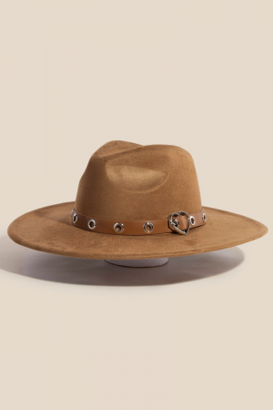Heart Buckle Grommet Strap Faux Suede Fedora Hat