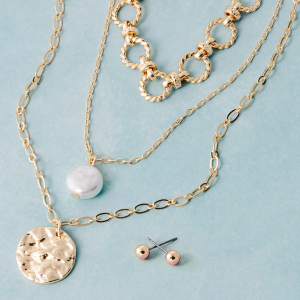 Triple Layered Chain Pearl And Coin Pendant Necklace Set