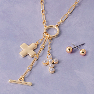 Paperclip Chain Cross And Pearl Cluster Charm Necklace