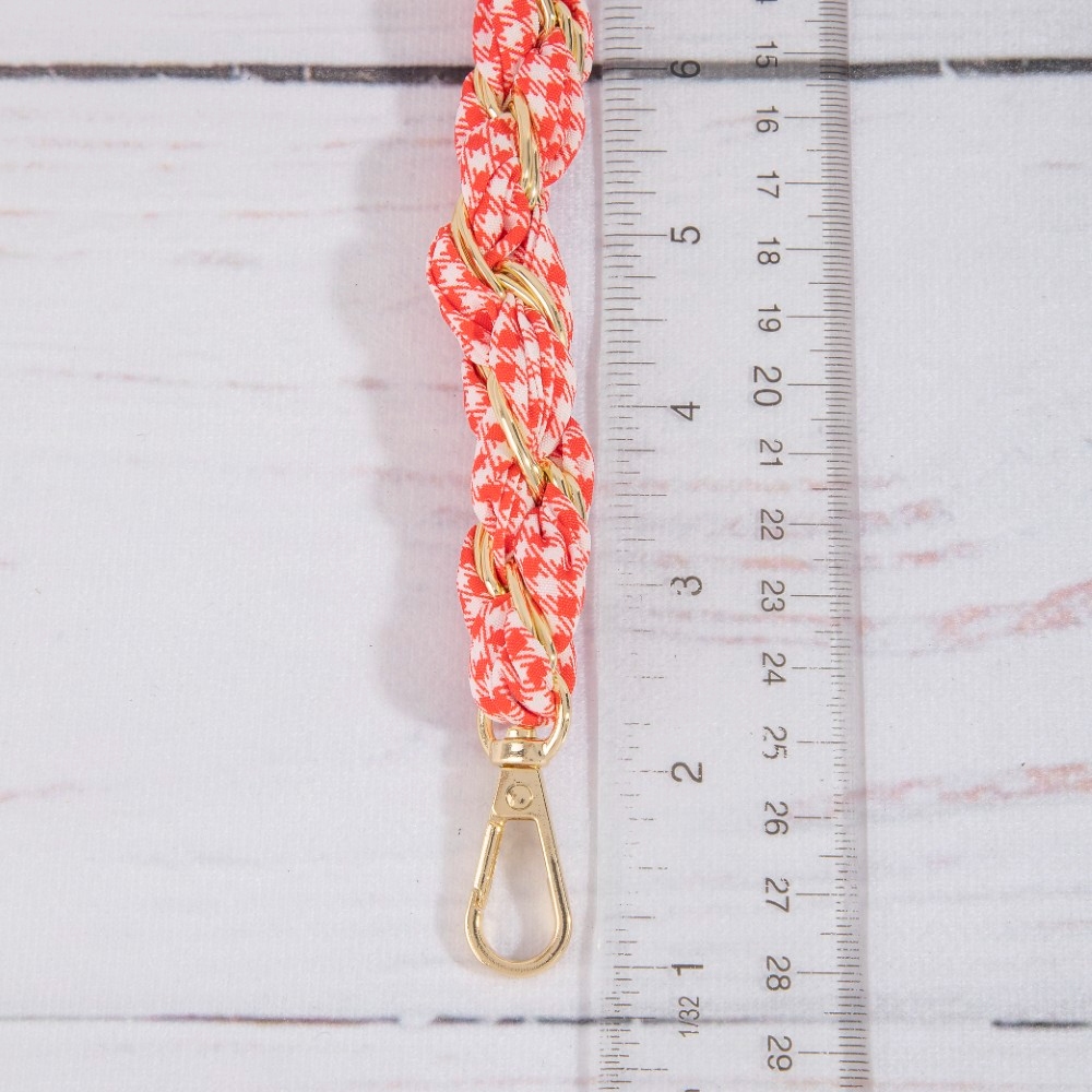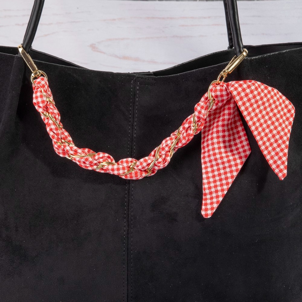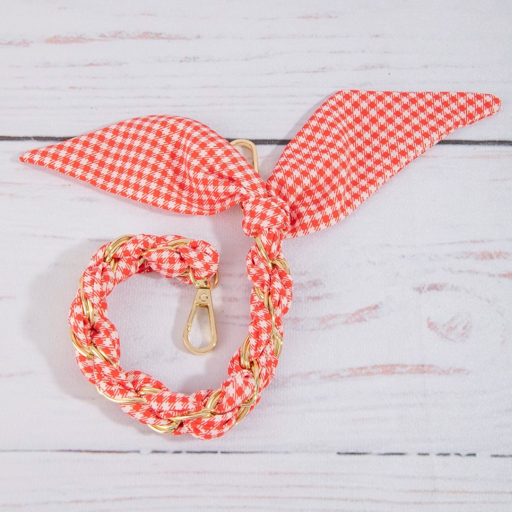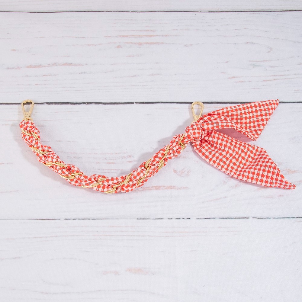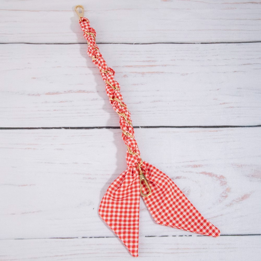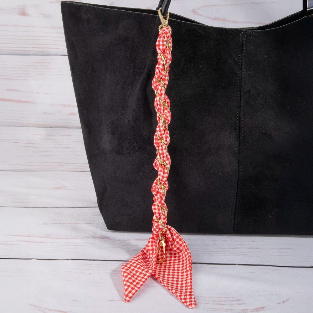 - This piece is both timeless and contemporary, this keychain carries a charming checkered scarf chain bag charm design. A must-have keychain for anyone who loves to add some flair to their outfits. Available in MBLG2, MRDG2. This item is sold in packs of 1.