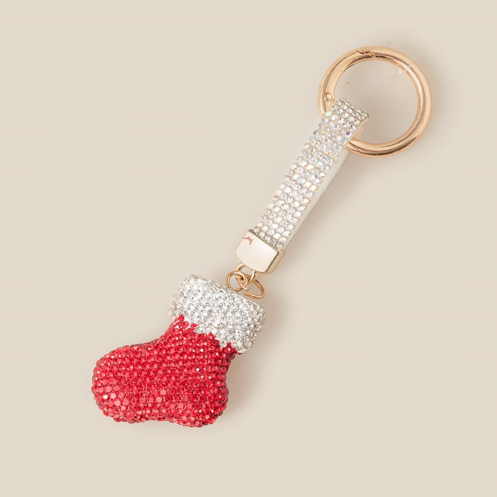 The perfect way to add some sparkle to your outfit, this bag charm features an exceptional pave christmas stocking design. Perfect for adding some texture and dimension to any outfit, this bag charm is a must-have. Available in WH. This item is sold in packs of 1.