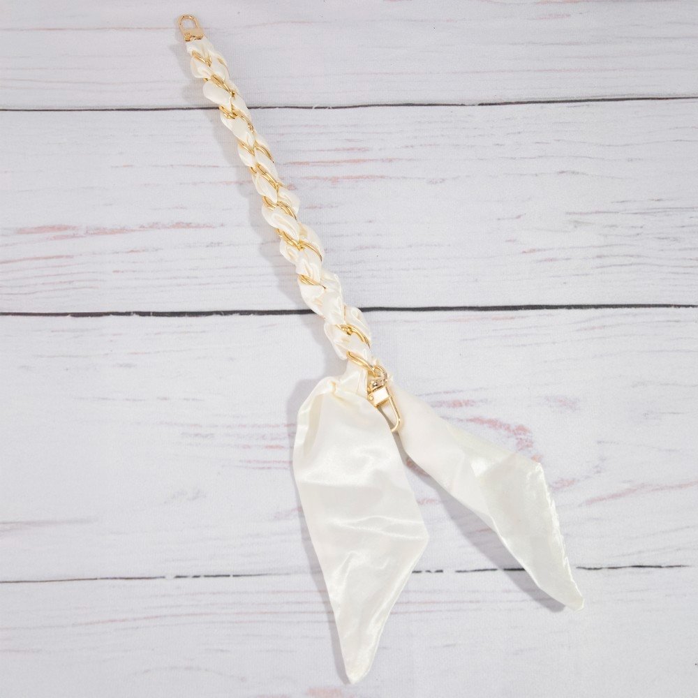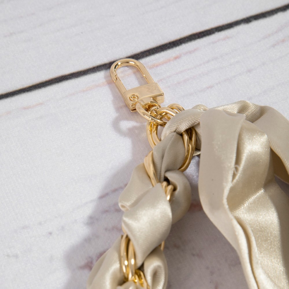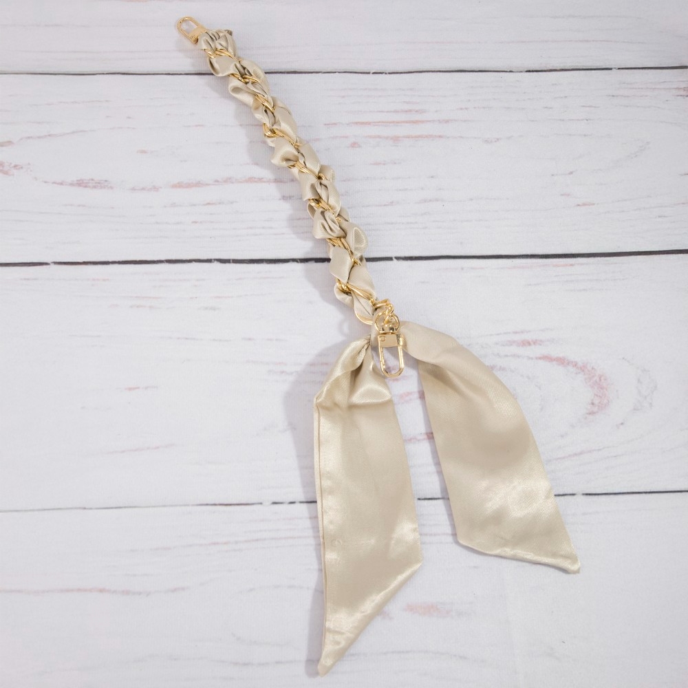 - Perfectly polished and endlessly versatile, this keychain boasts a magnificent satin scarf chain bag charm design. Elevate your fashion statement with this versatile keychain, adding a touch of glamour to your everyday look. Available in BGG2, BKG2, WHG2. This item is sold in packs of 1.