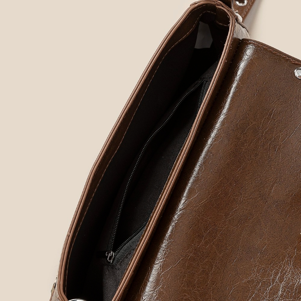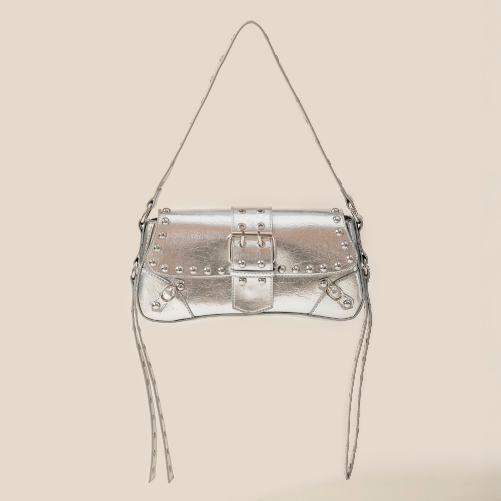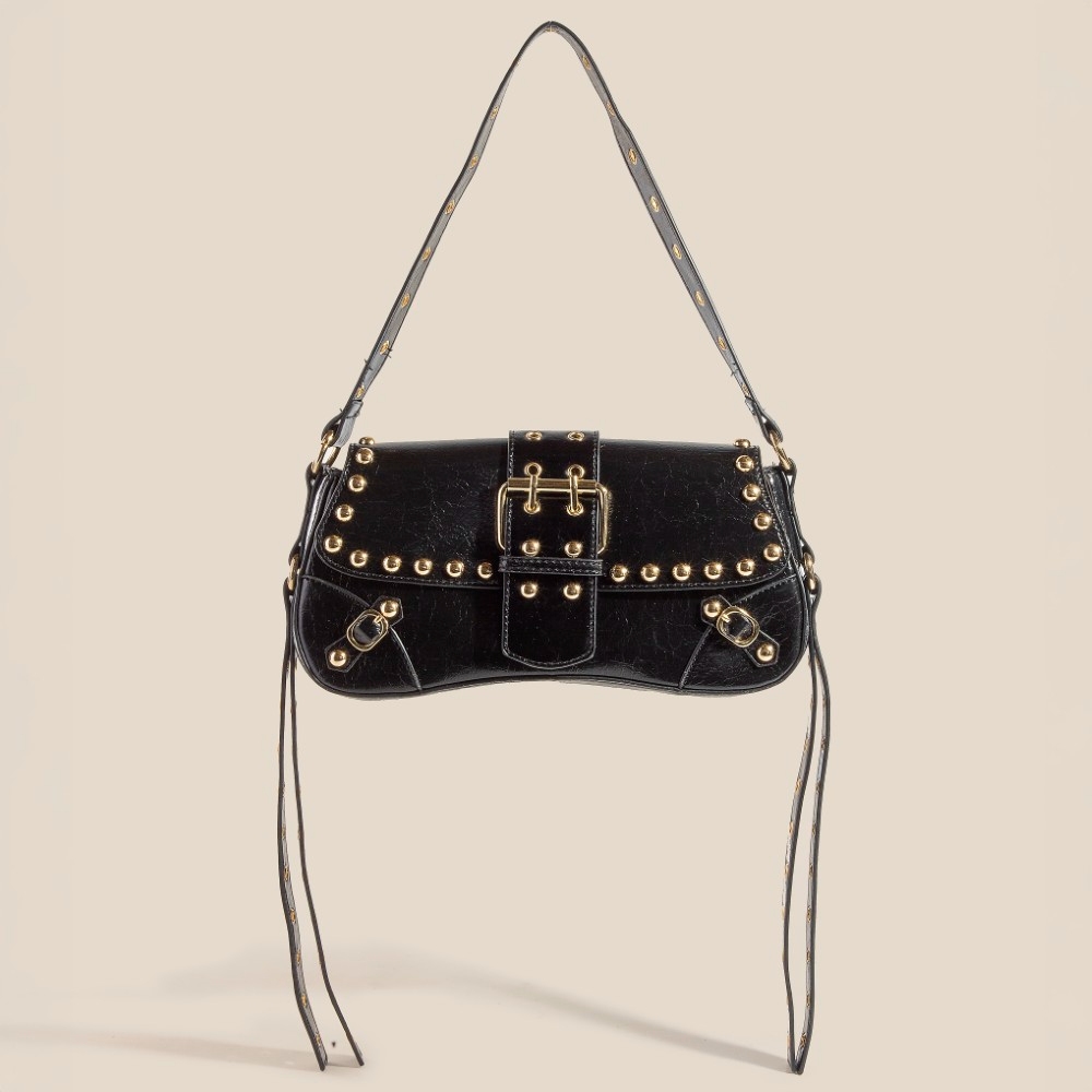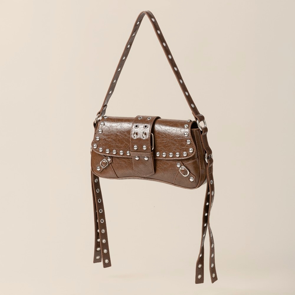 - Stay on-trend and ahead of the fashion curve, this shoulder bag features a distinct glossy faux leather rivet trim design. A chic and sophisticated shoulder bag that's perfect for dressing up or down. Available in BK, BR, IV, S, BU and LE. This item is sold in packs of 1.