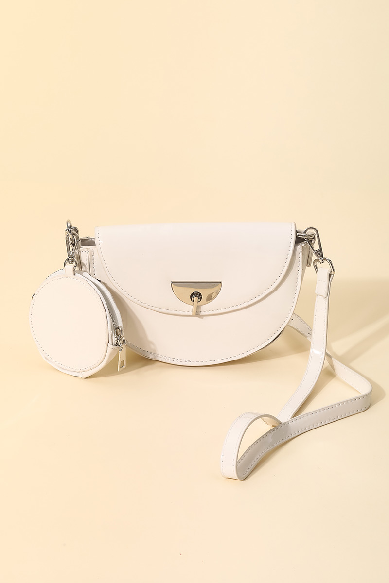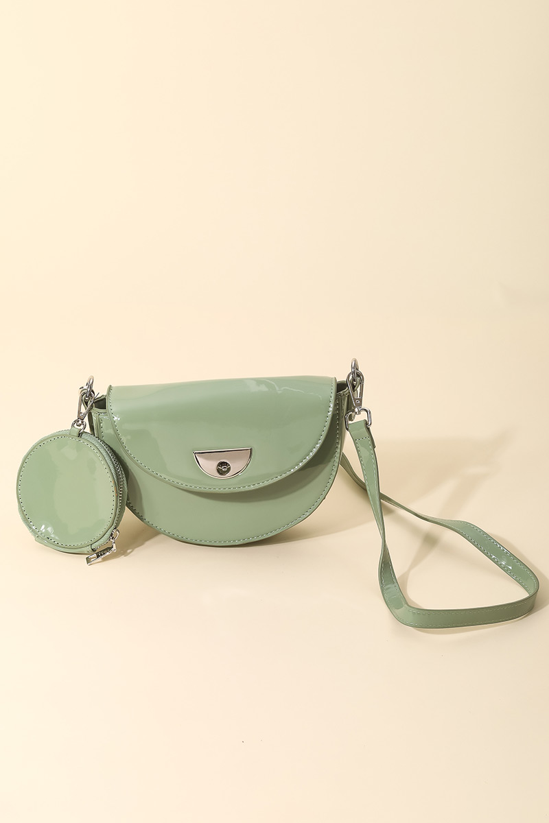Chic casual in season must have shoulder bag that features a gorgeous glossy semi circle shoulder bag design. An absolutely gorgeous stunning must have. Available in MI, PK, BK and IV.