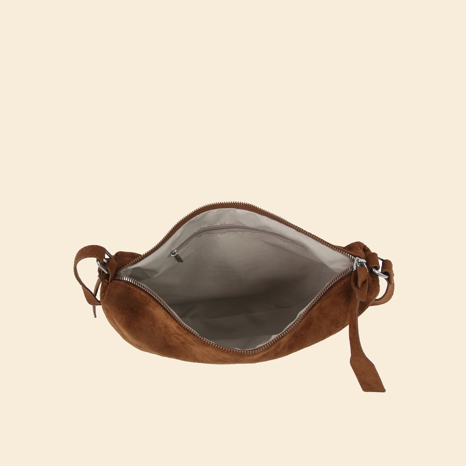 This shoulder bag is made with 100% Faux Suede.