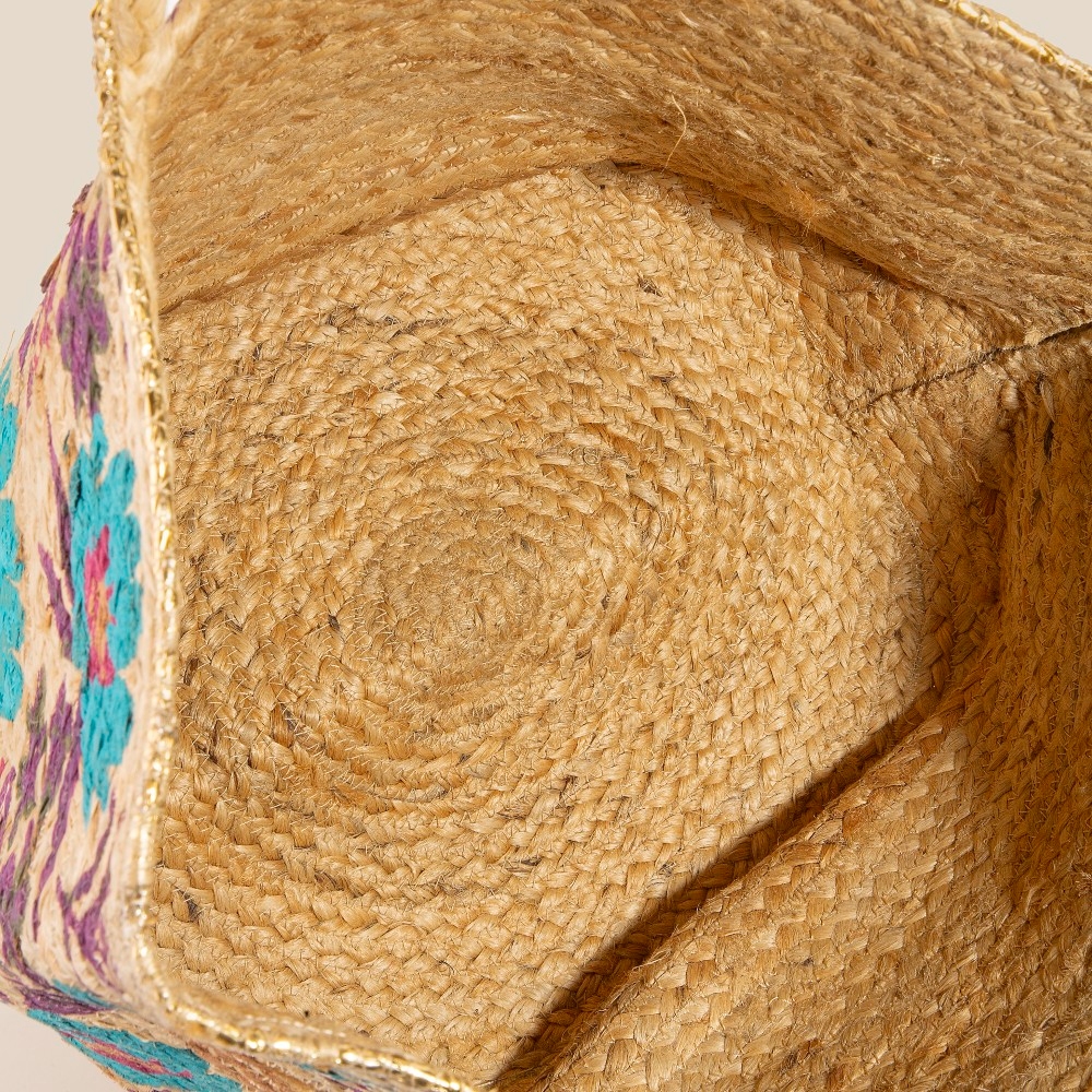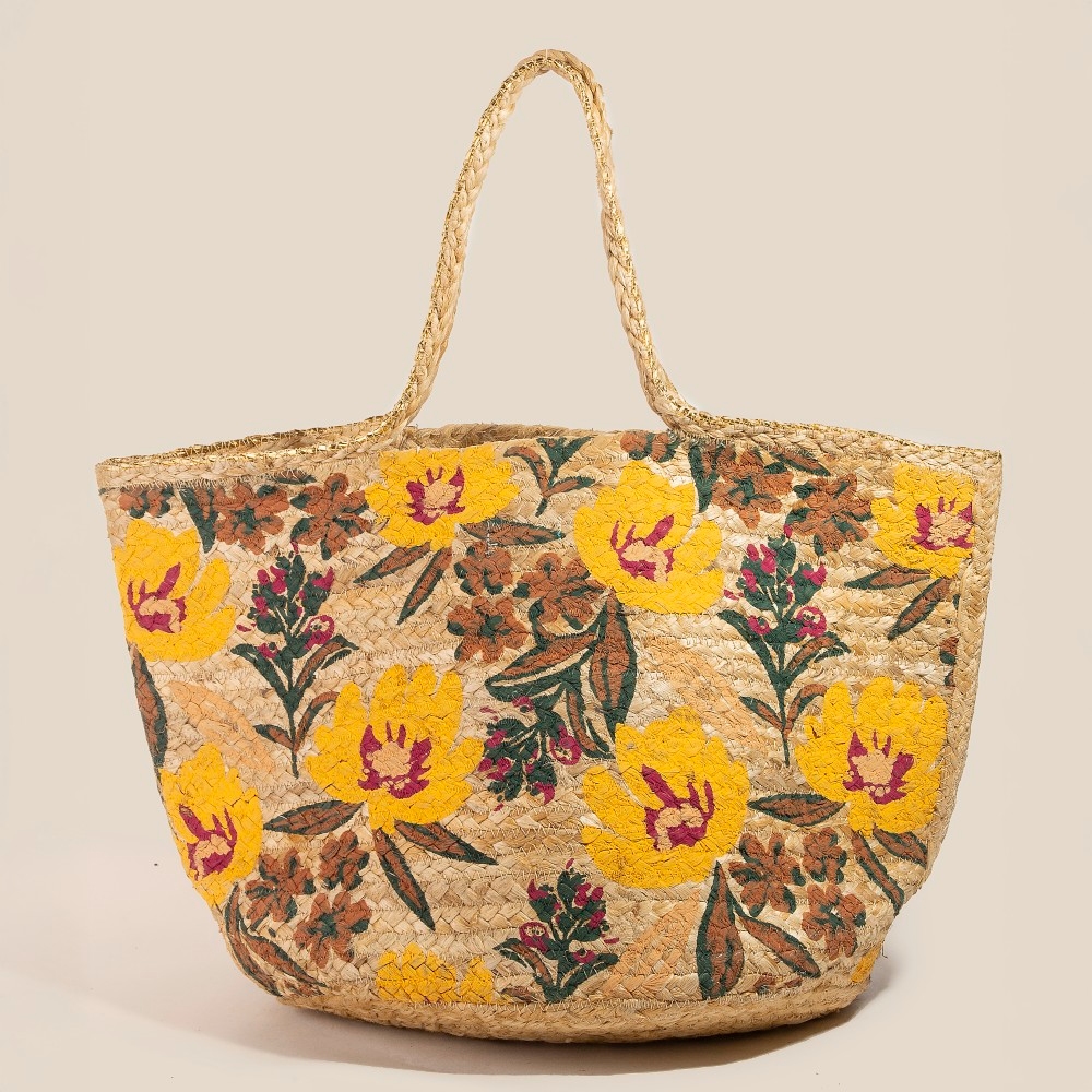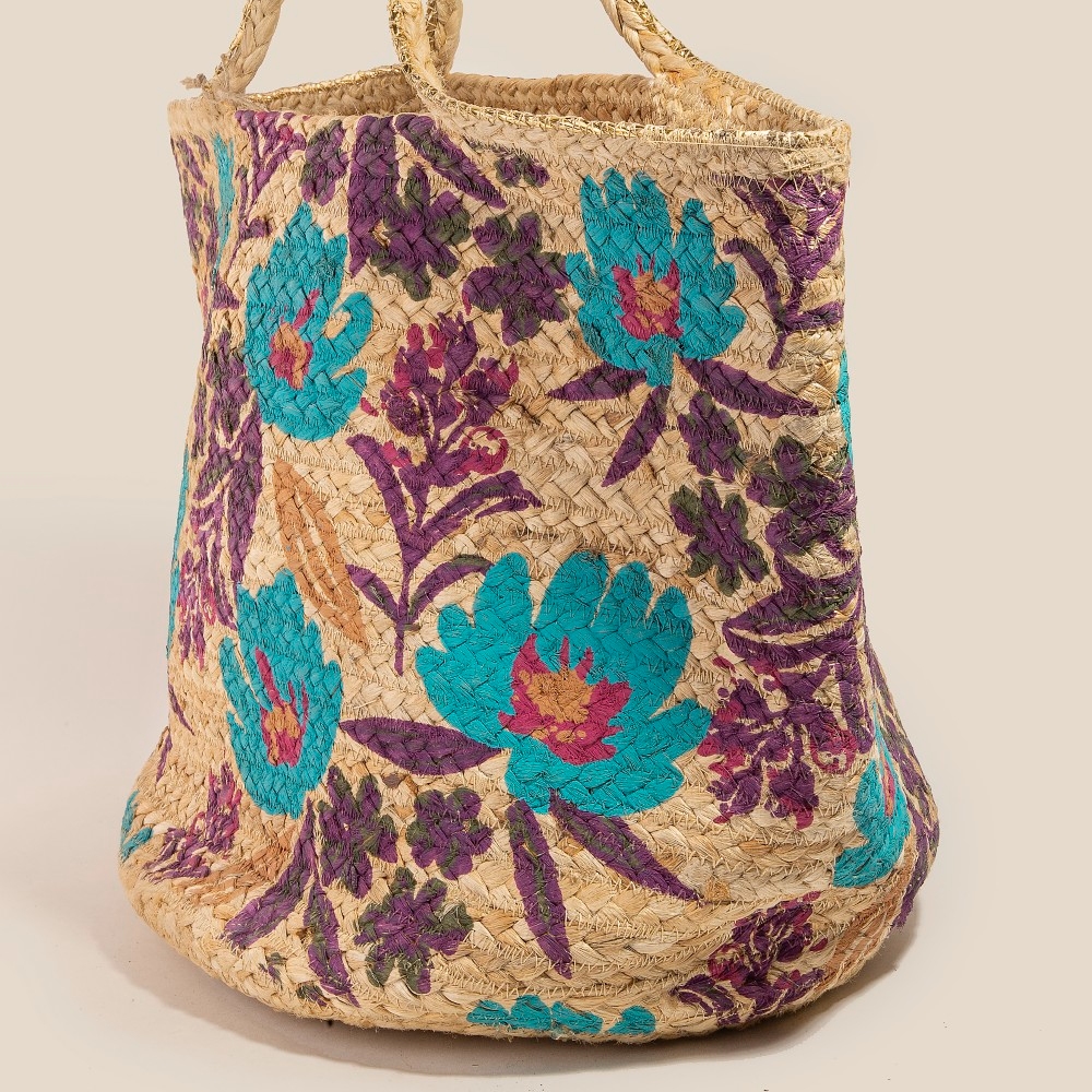 • This piece is perfect for those who want to showcase their unique style, this tote bag brings a one-of-a-kind colorful floral pattern wide jute design. Infuse elegance into your daily wardrobe with the versatile charm of this must-have tote bag. This item is sold in packs of 1.