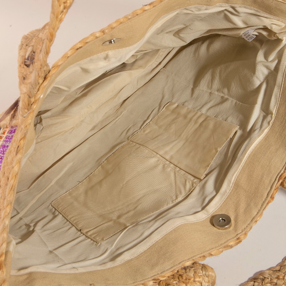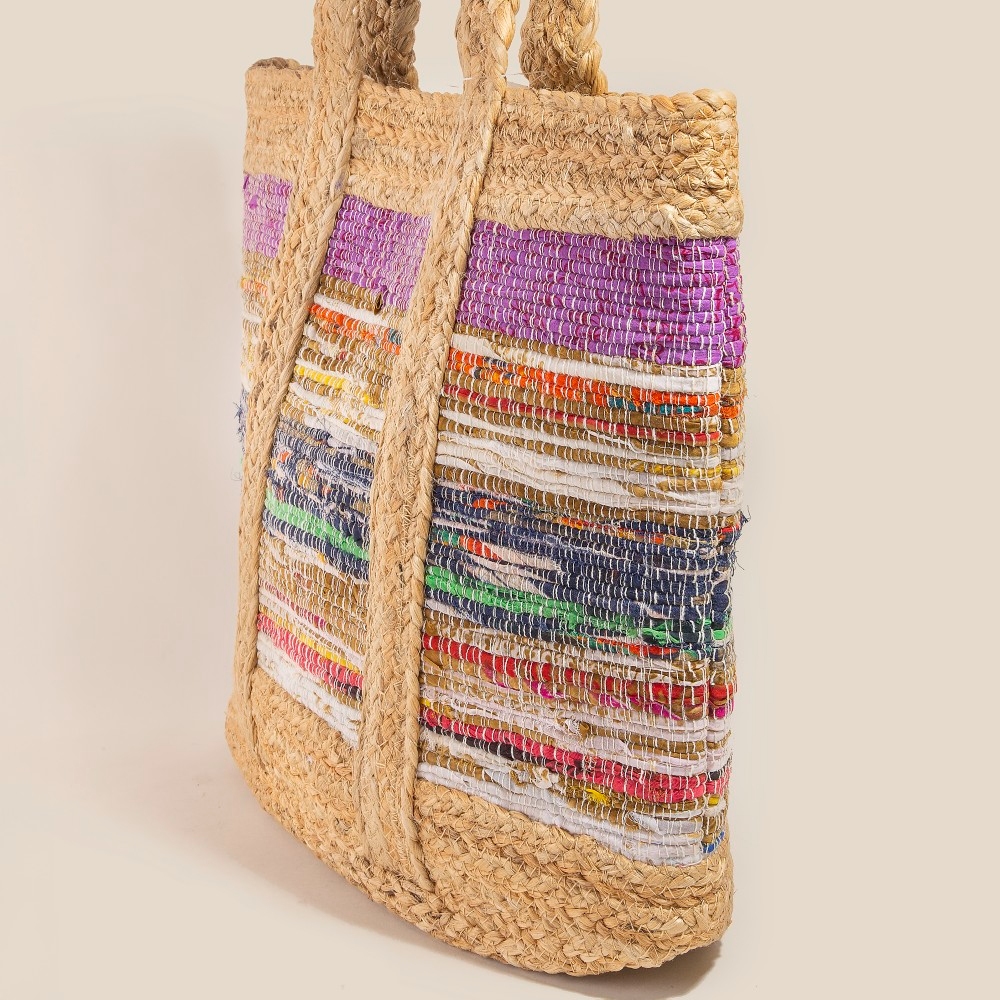 The perfect way to elevate any outfit, this tote bag emanates an elegant colorful stripe woven jute design. Add a touch of glamour to your wardrobe with this versatile tote bag, perfect for enhancing the elegance of any look. This item is sold in packs of 1.