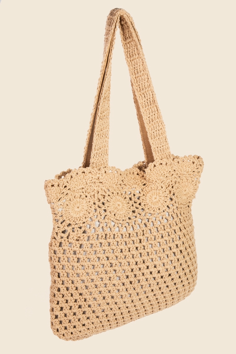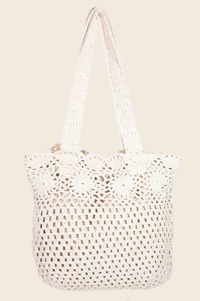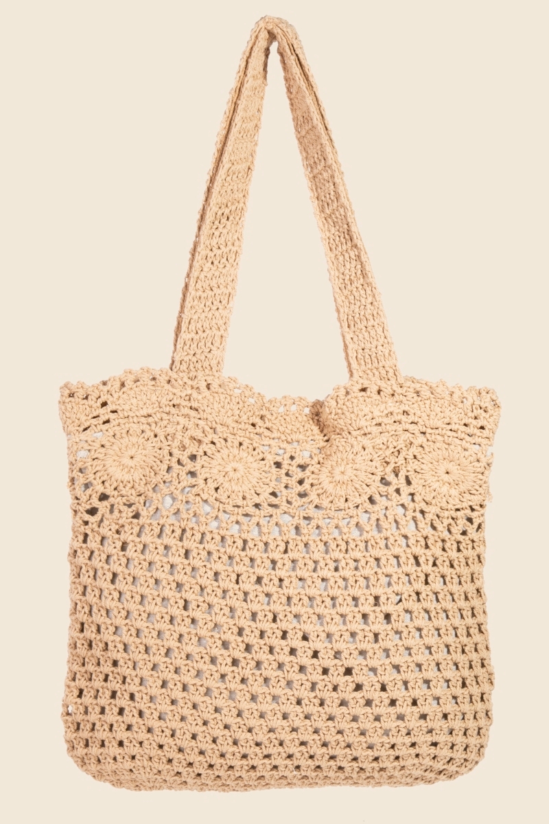 • Guaranteed to add a touch of glamour to any outfit, this tote bag showcases a breathtaking crochet circles mesh knit design. The perfect way to elevate any outfit, this tote bag adds a touch of elegance and style. Available in IV, KA. This item is sold in packs of 1.