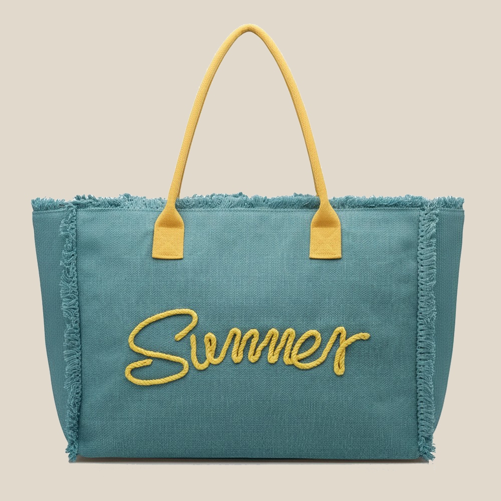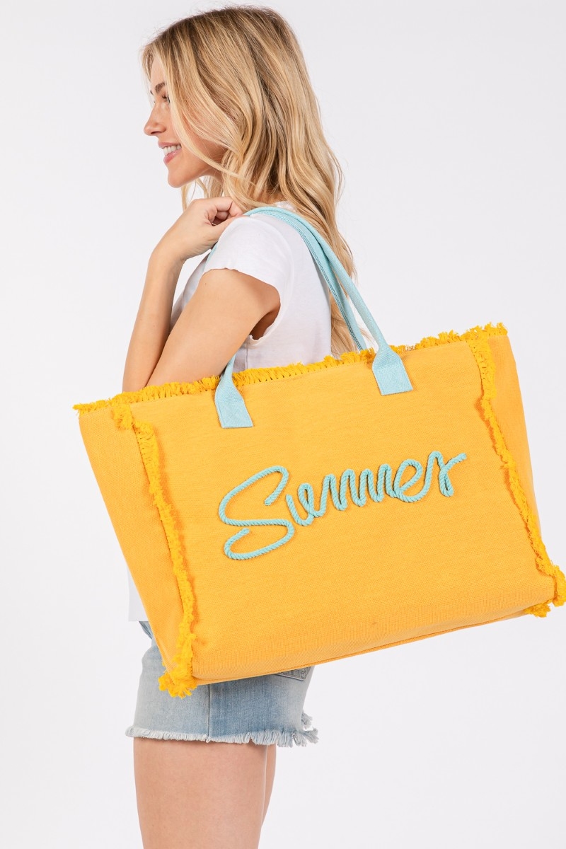 • This piece is both elegant and versatile, this tote bag features an exceptional sewn rope summer letter fringe design. Infuse your ensemble with a touch of sophistication using this versatile tote bag, a game-changer in the world of fashion. Available in BL, GN, NV, OR, PK, PU, TL, YE. This item is sold in packs of 1.