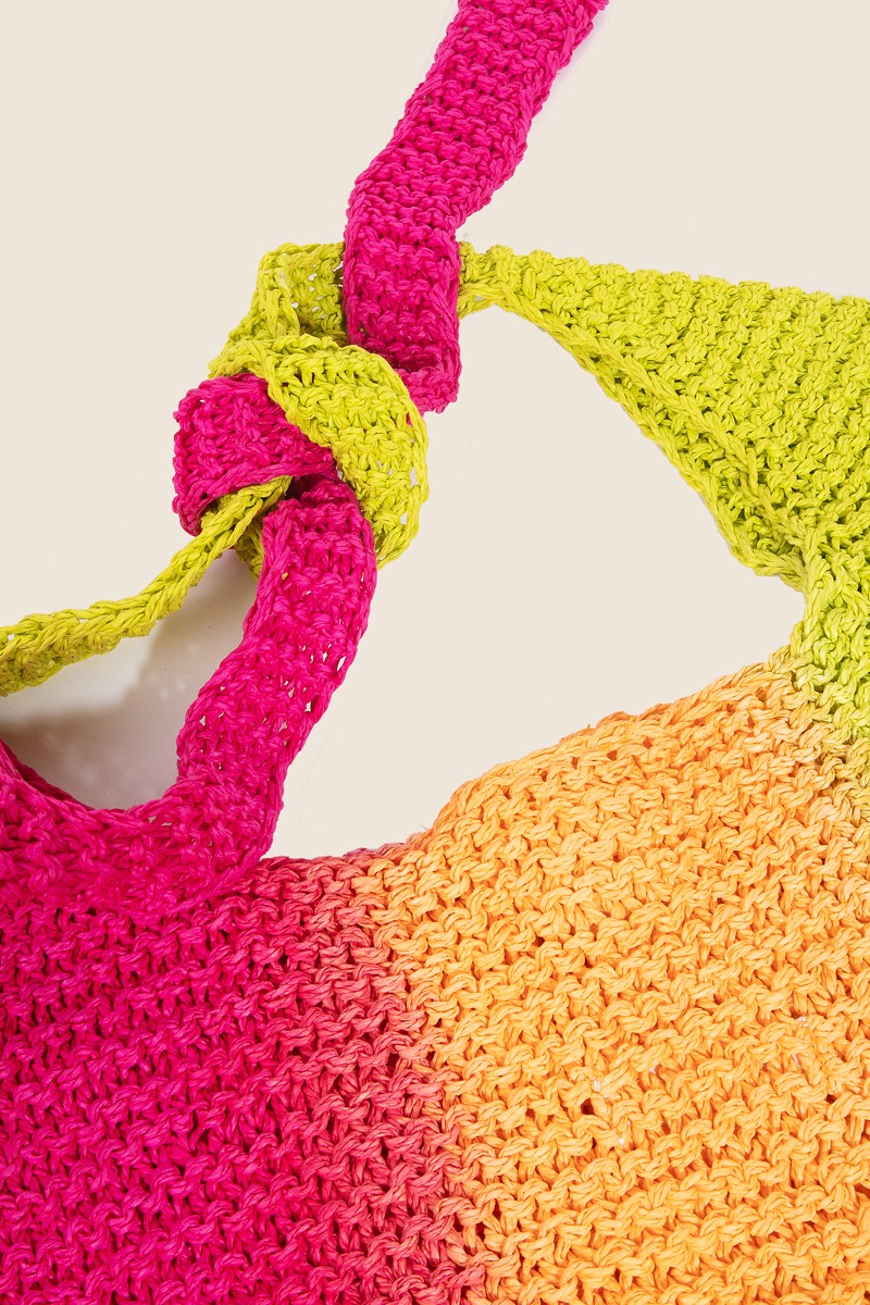 Multi Tone Straw Half Moon Round Handle Tote Bag