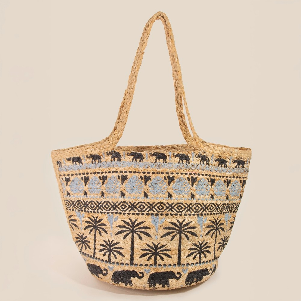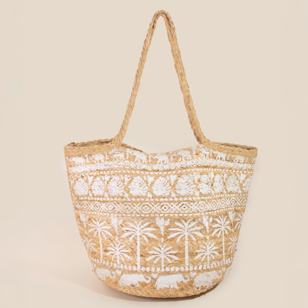 • This piece is designed to be both stylish and functional, this tote bag highlights a special palm trees and monstera leaf print jute design. This tote bag is a great way to add some flair to your outfit without going over the top. Available in BL, GY, TUR, W. This item is sold in packs of 1.