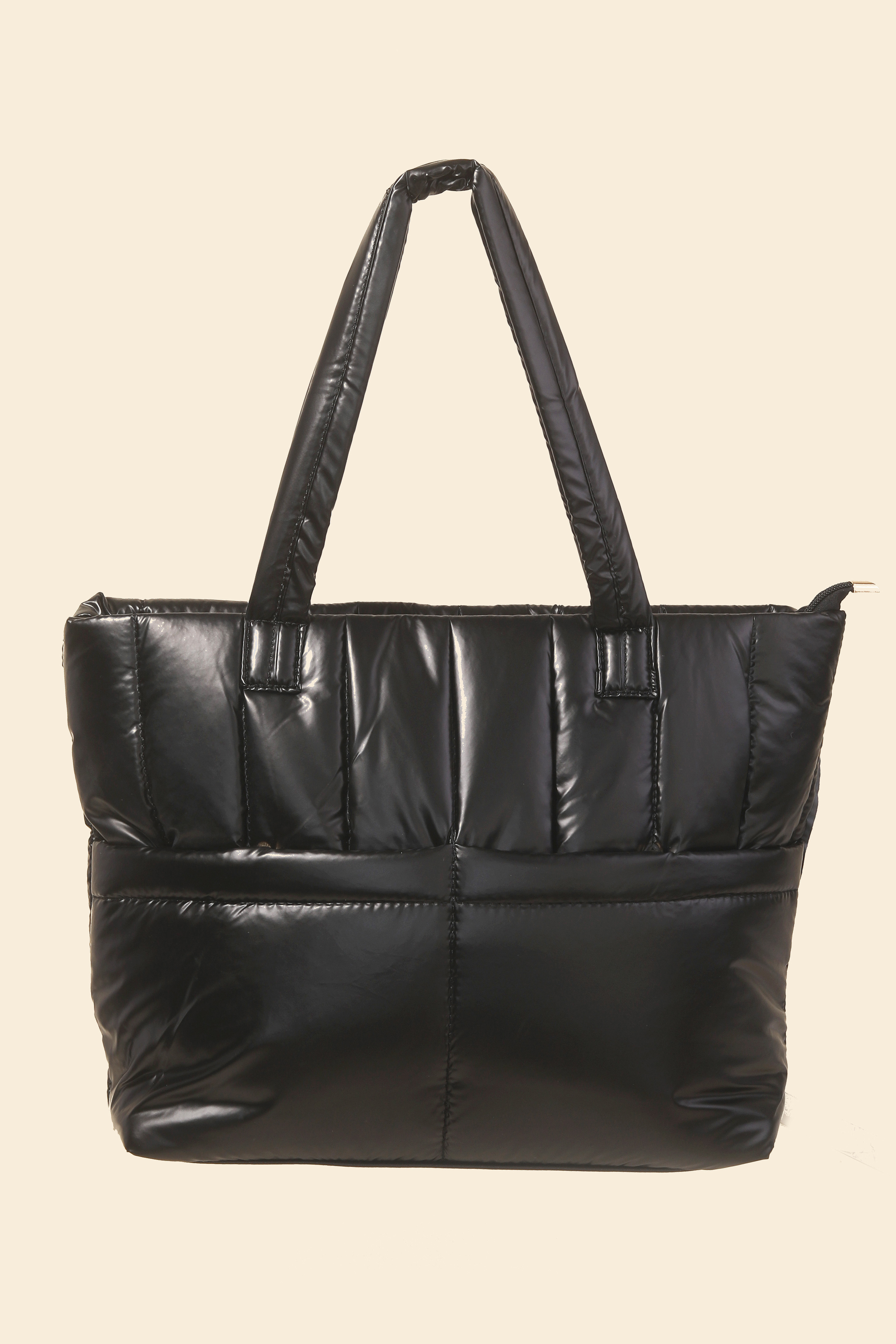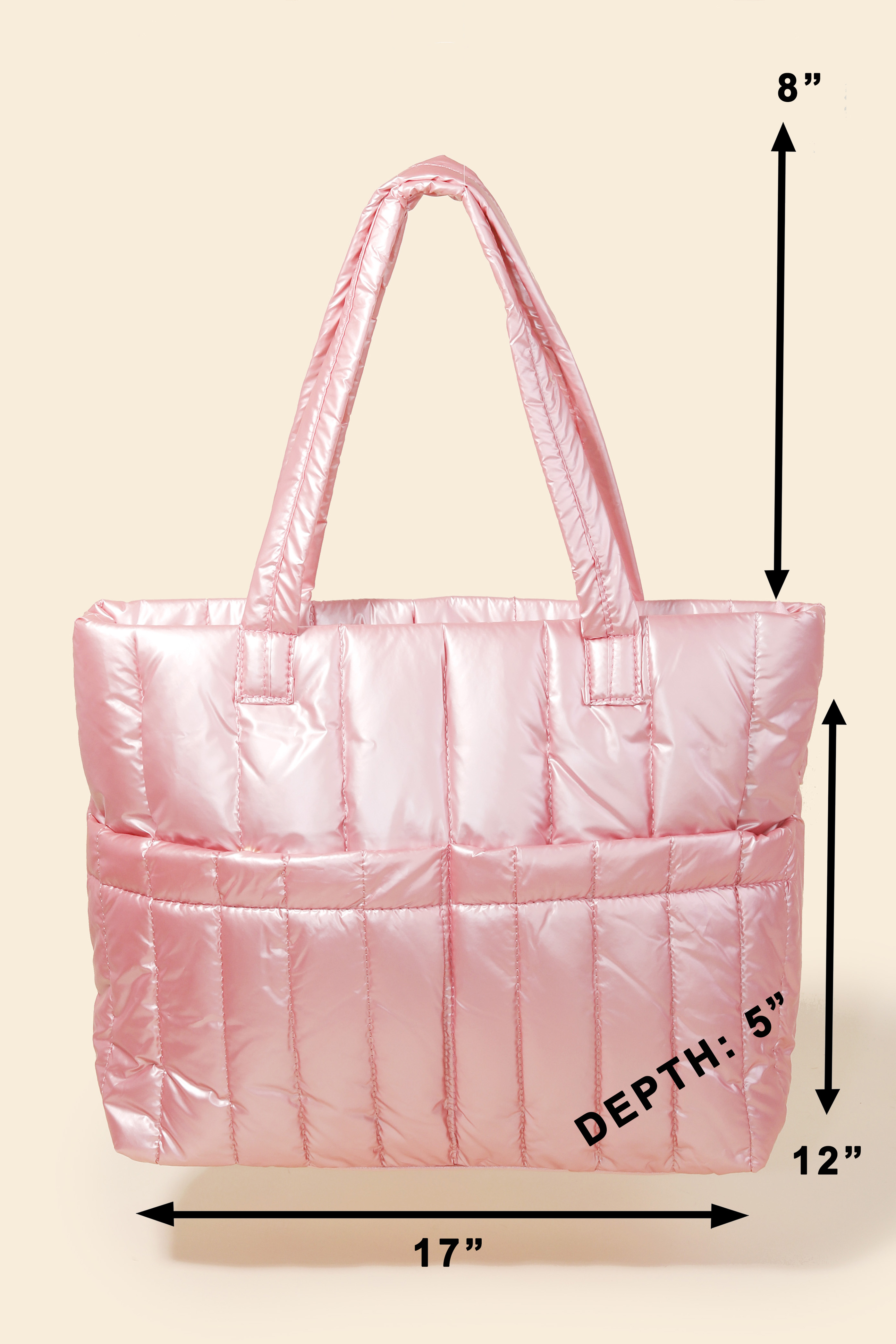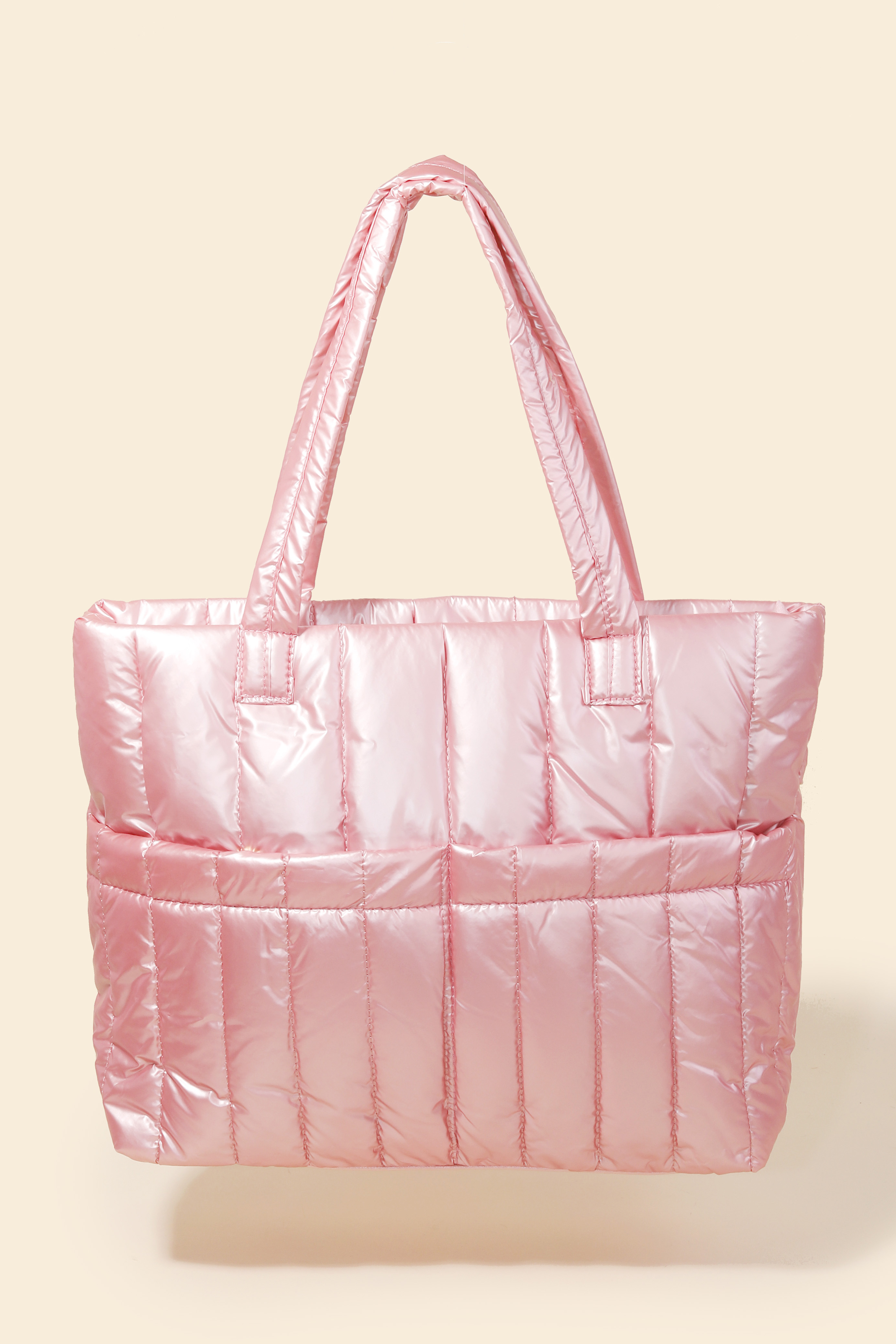 The perfect way to add some sparkle to your outfit, this tote bag flaunts a luxurious quilted faux leather tote bag design. This versatile accessory adds a touch of elegance to any outfit. Available in BLK, CRM and PIN. This item is sold in packs of 1.