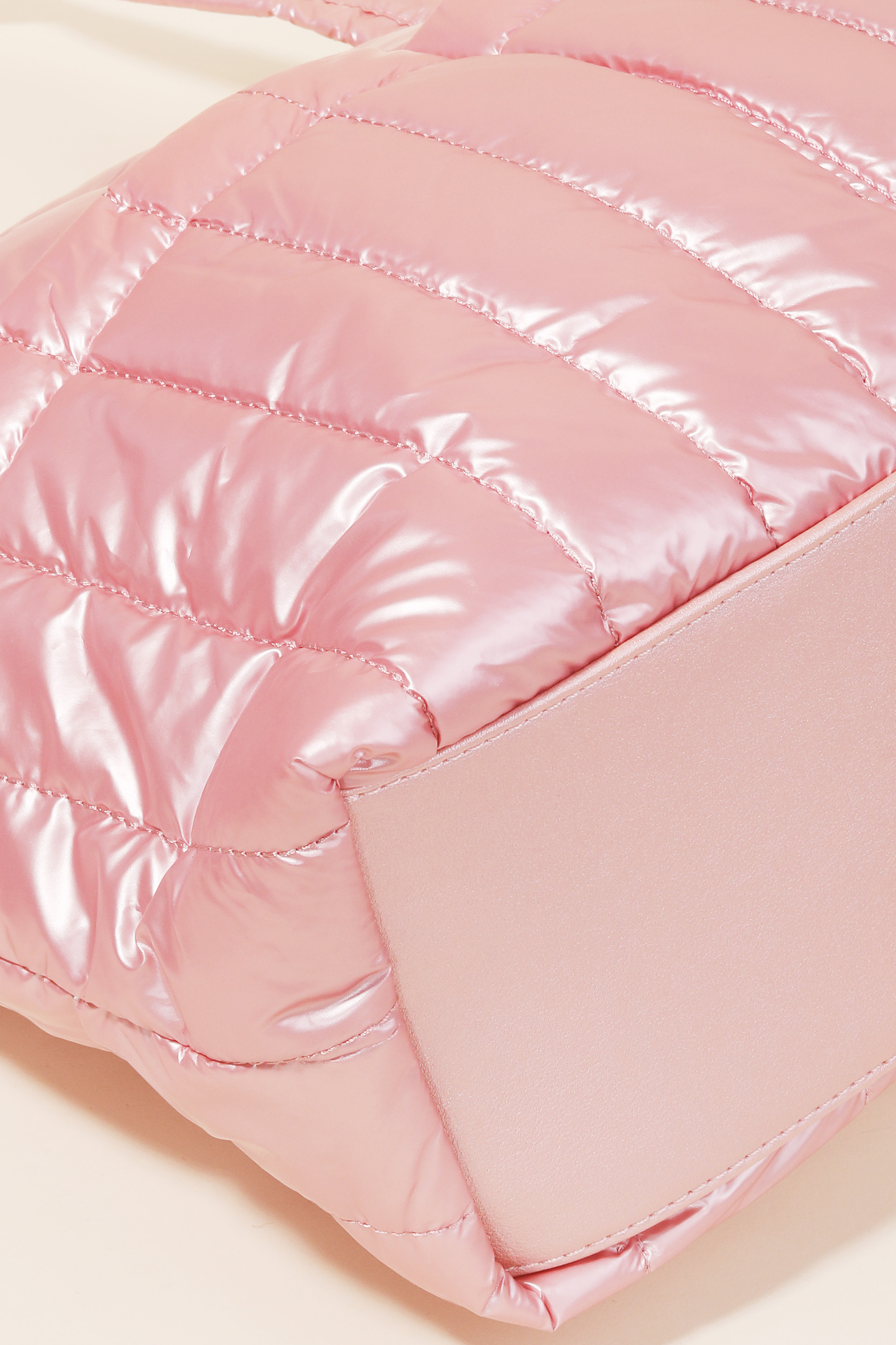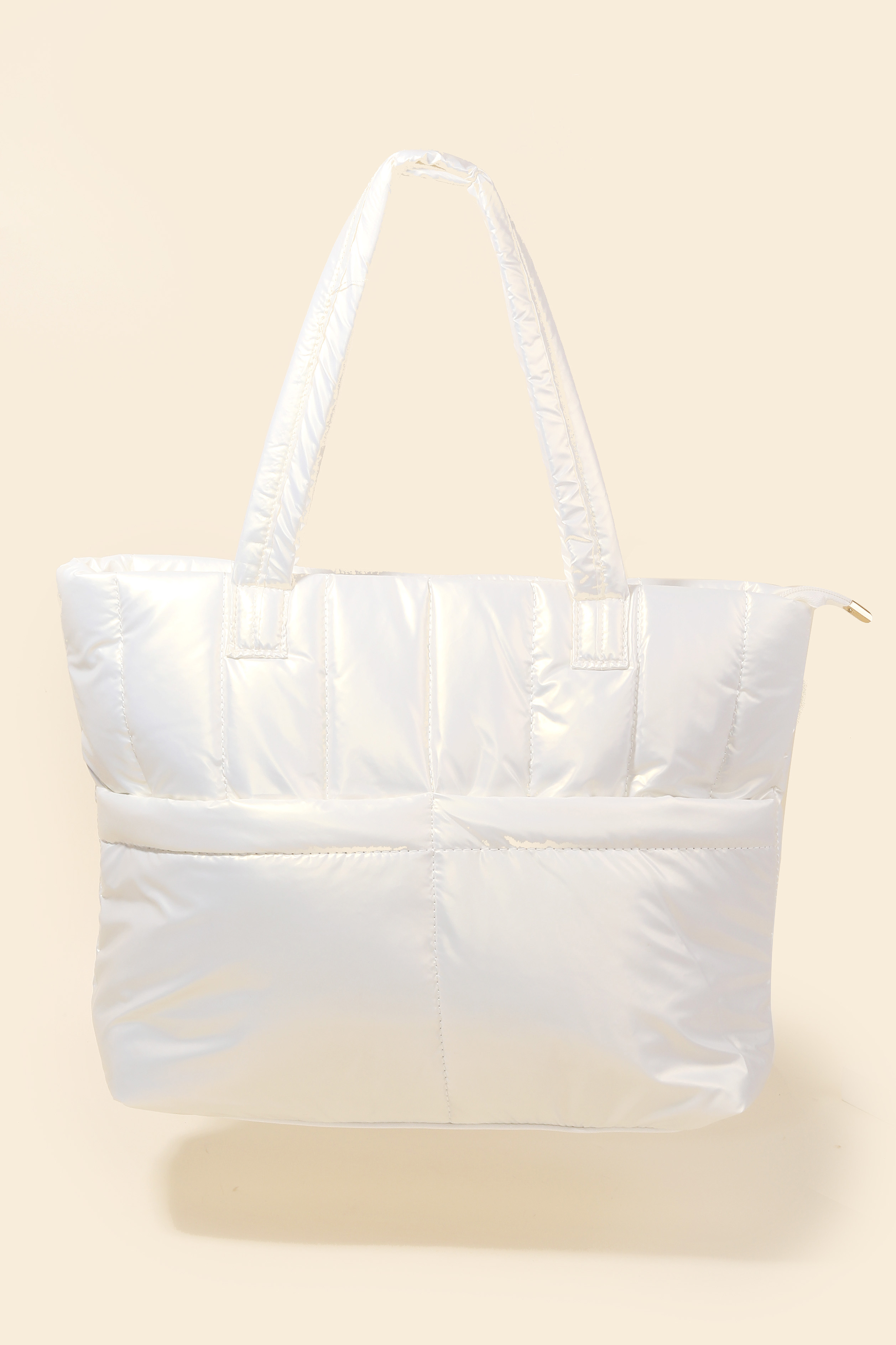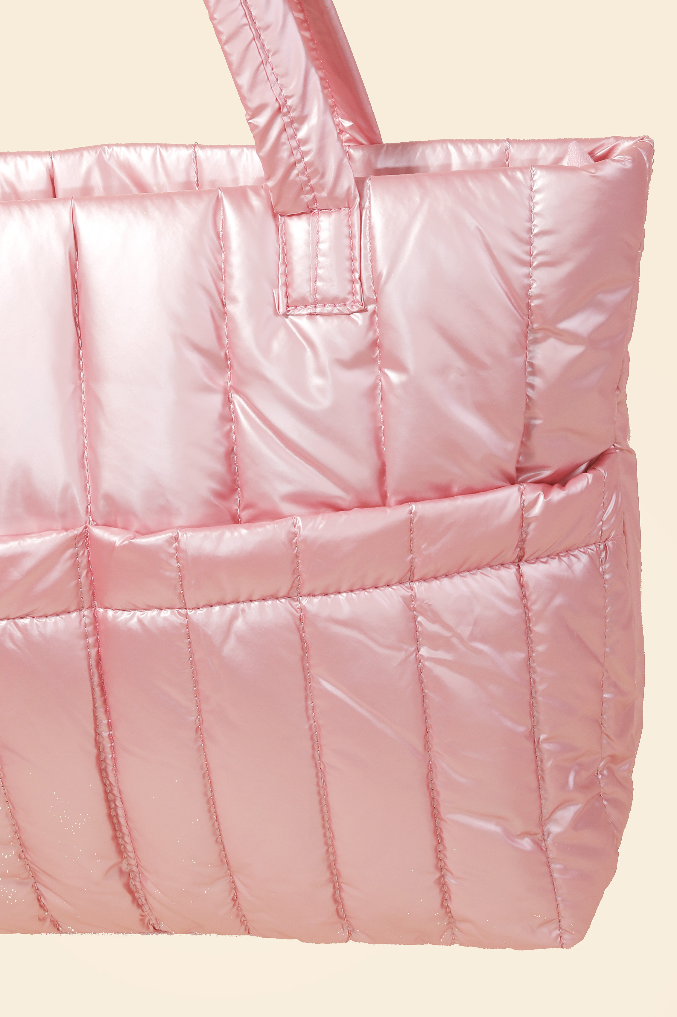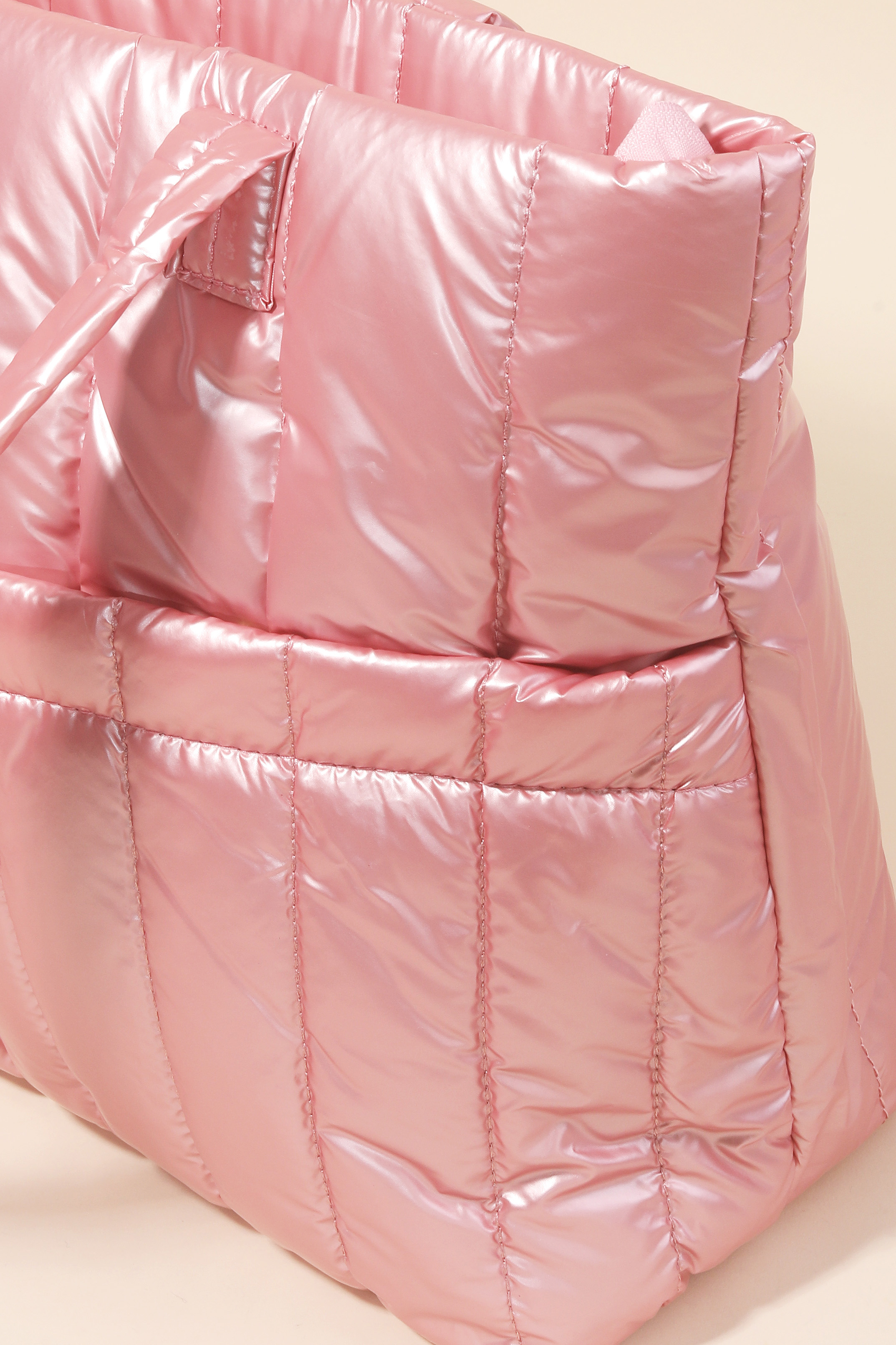 The perfect way to add some sparkle to your outfit, this tote bag flaunts a luxurious quilted faux leather tote bag design. This versatile accessory adds a touch of elegance to any outfit. Available in BLK, CRM and PIN. This item is sold in packs of 1.