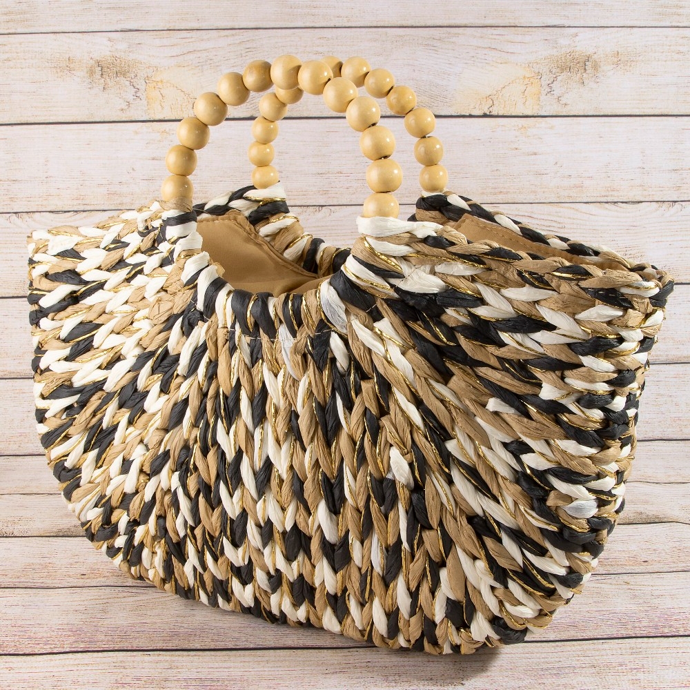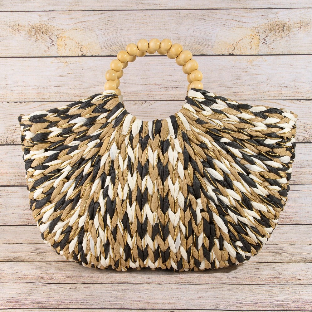 Multi Tone Straw Half Moon Round Handle Tote Bag