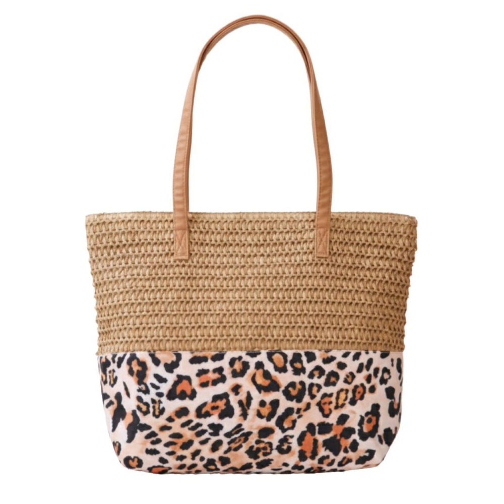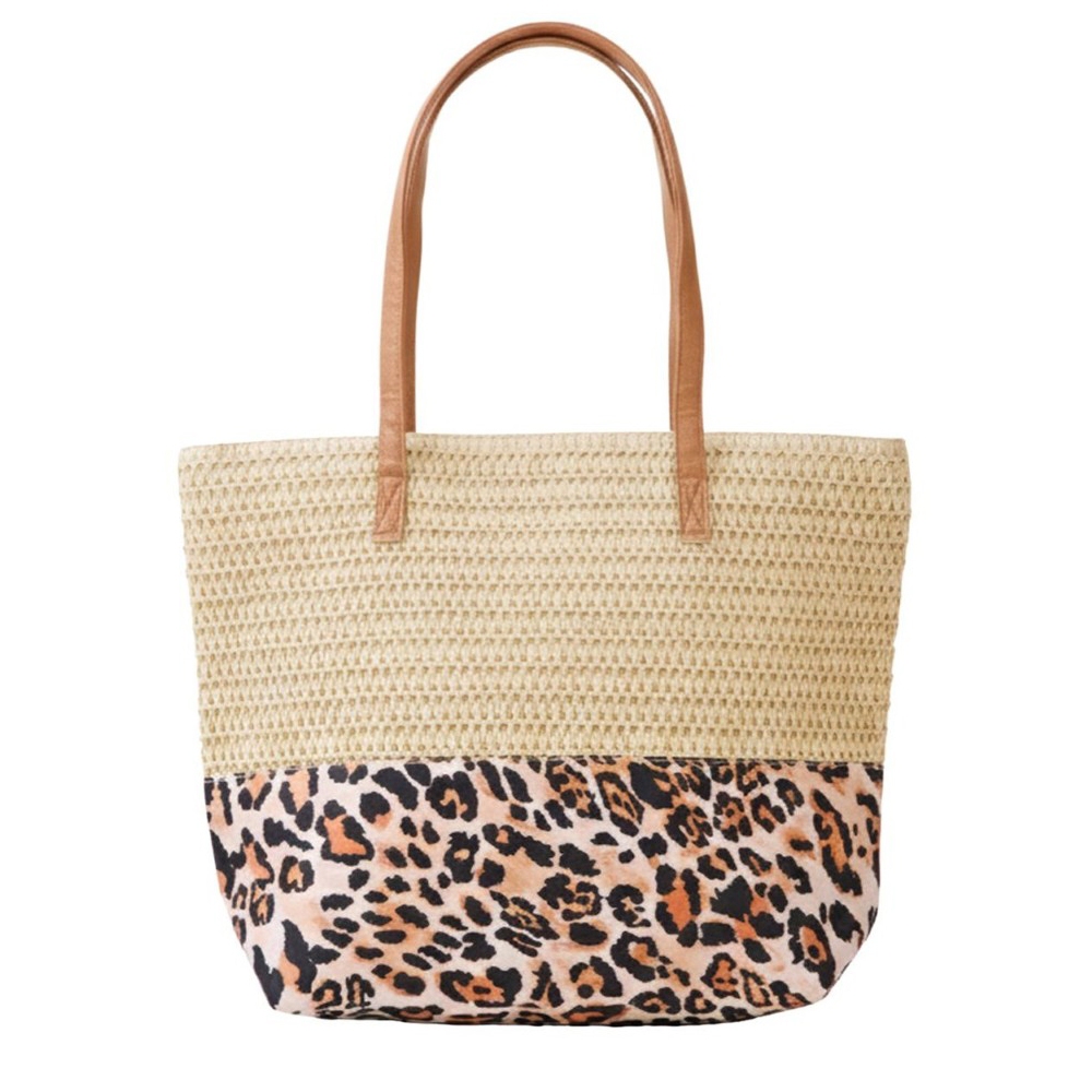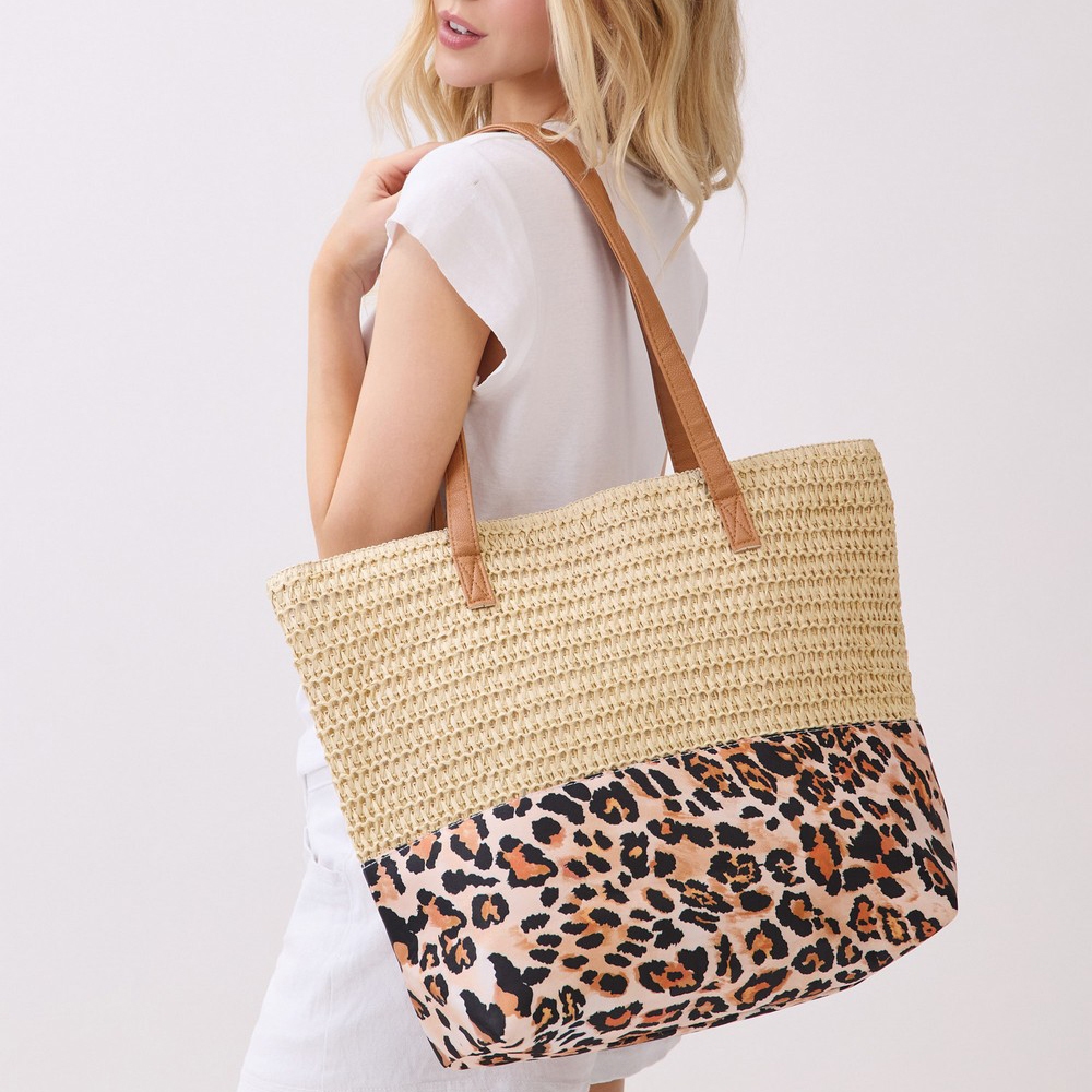 Add a touch of elegance and glamour to your look, this tote bag reveals an intricate straw braided leopard print design. This item is the perfect finishing touch to any outfit, adding a touch of glamour and sophistication. Available in BE, TP. This item is sold in packs of 1.