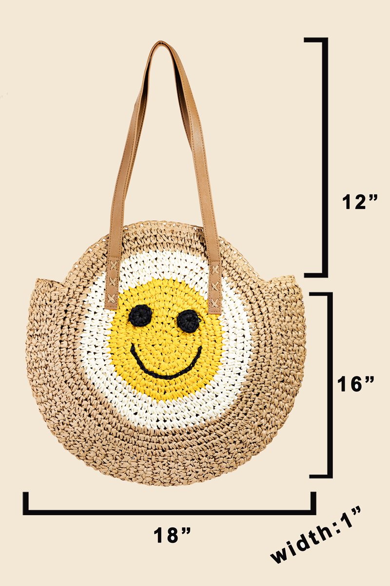 • An absolute must have tote bag created with a straw braided round happy face tote bag design. A must have choice for any occasion, casual or formal. Available in BEI and NAT. This item is sold in packs of 1.