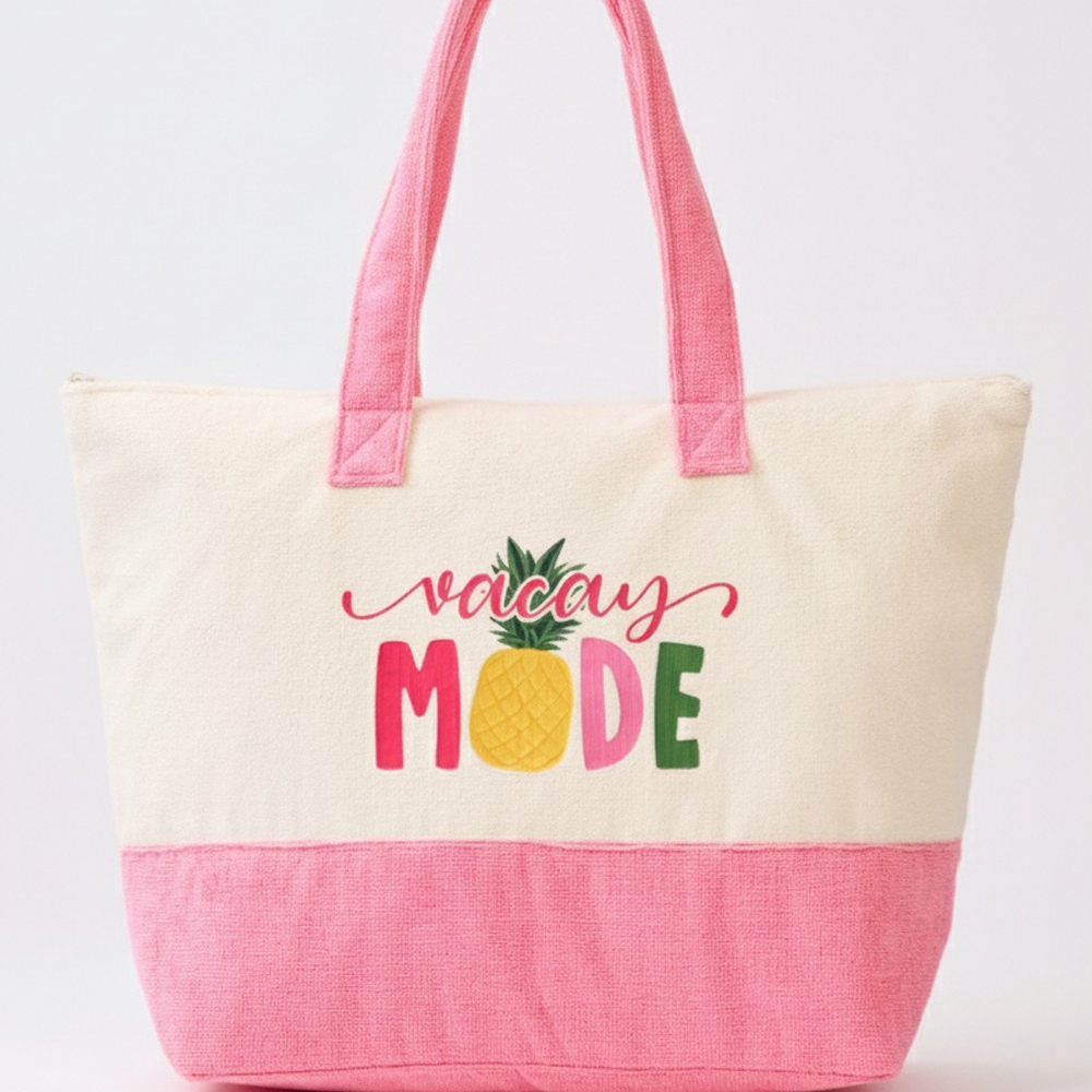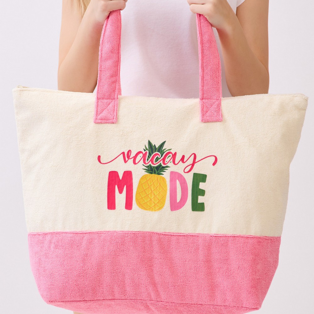 - Effortlessly chic and sophisticated, this tote bag shows off a distinctive vacay mode pineapple terry design. Elevate your personal style effortlessly with this versatile tote bag, an essential component for a refined wardrobe. Available in NO COLOR. This item is sold in packs of 1.