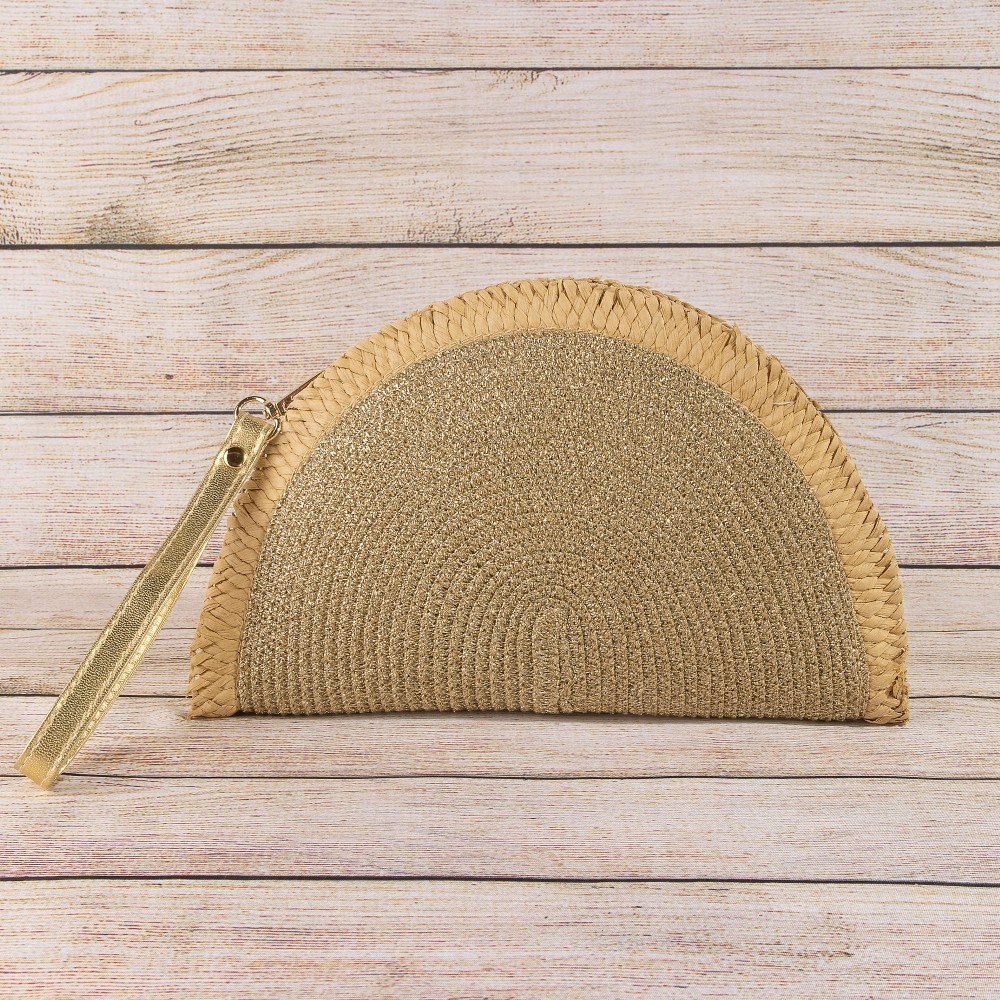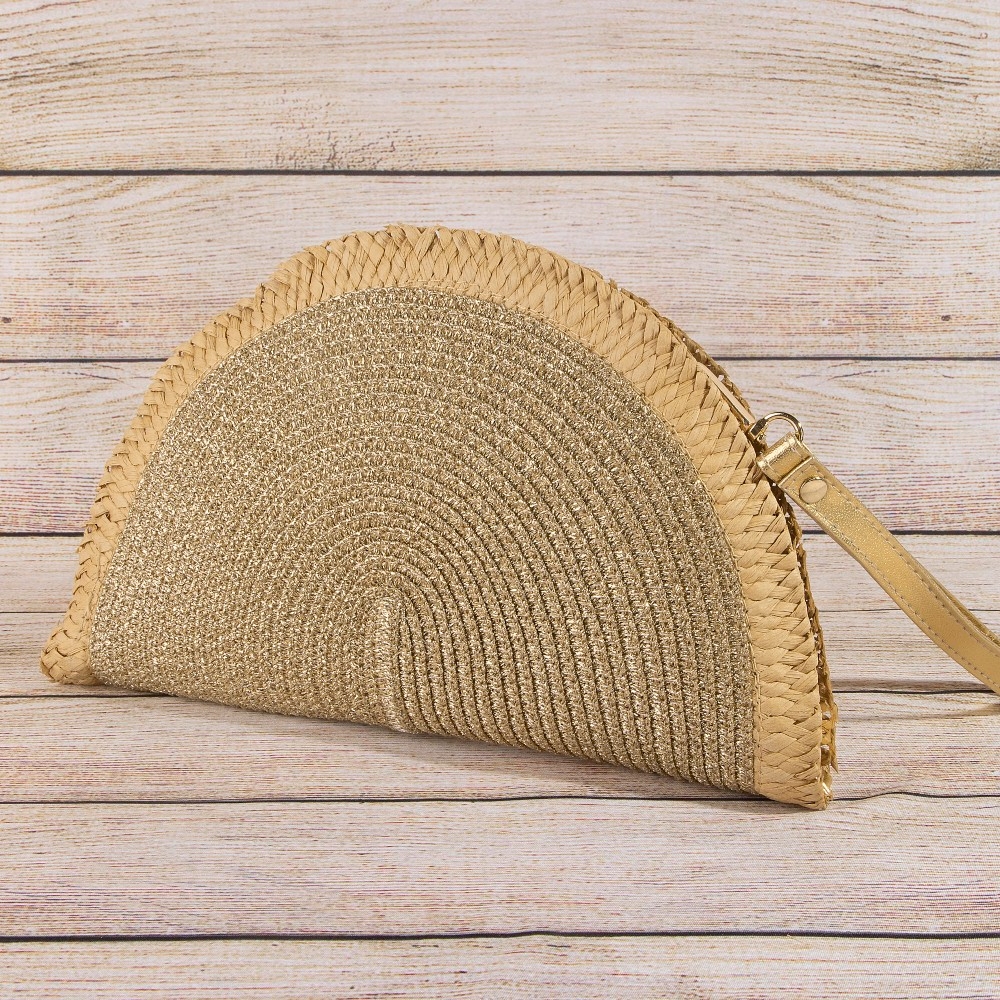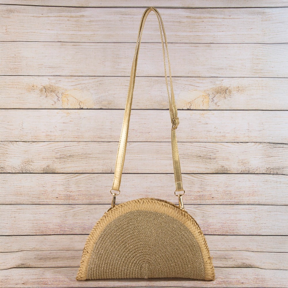 Metallic Straw Woven Half Moon Round Handle Bag