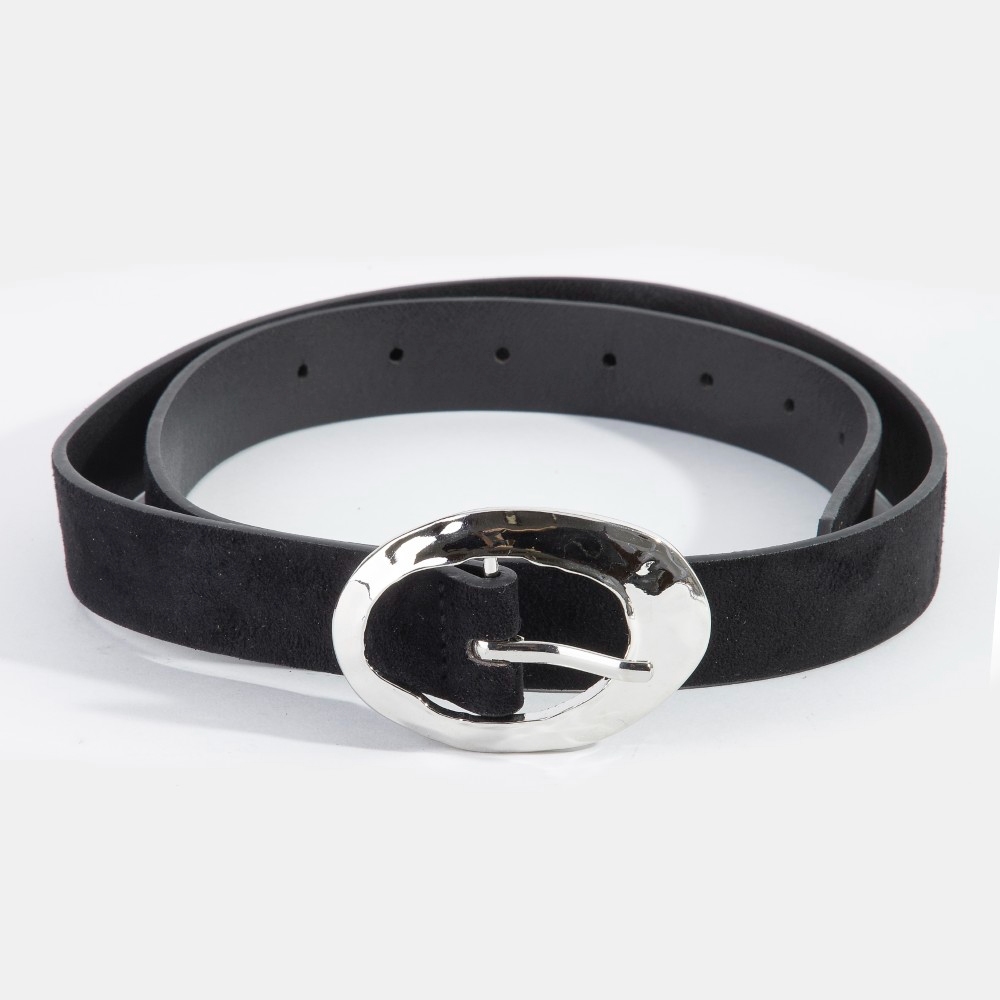 Hammered Oval Buckle Embroidered Vegan Leather Belt