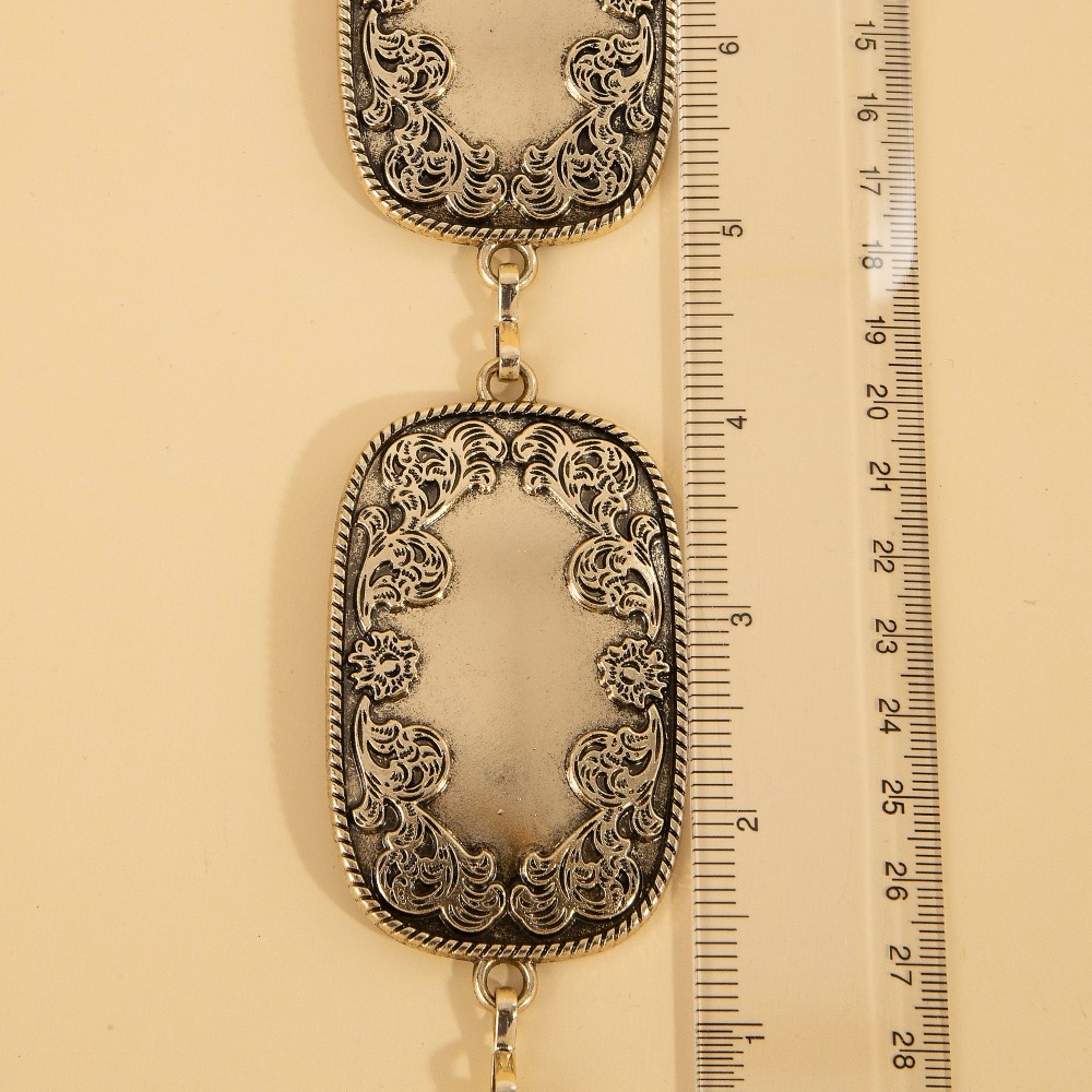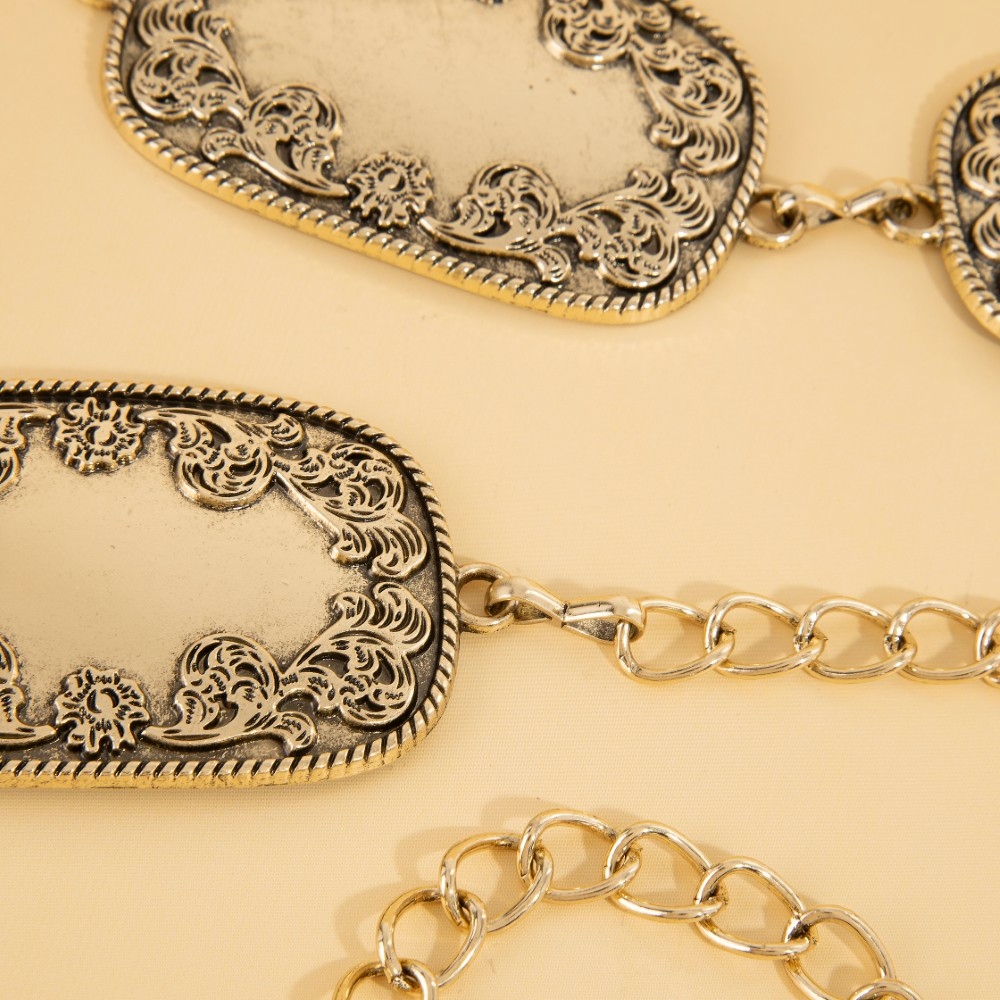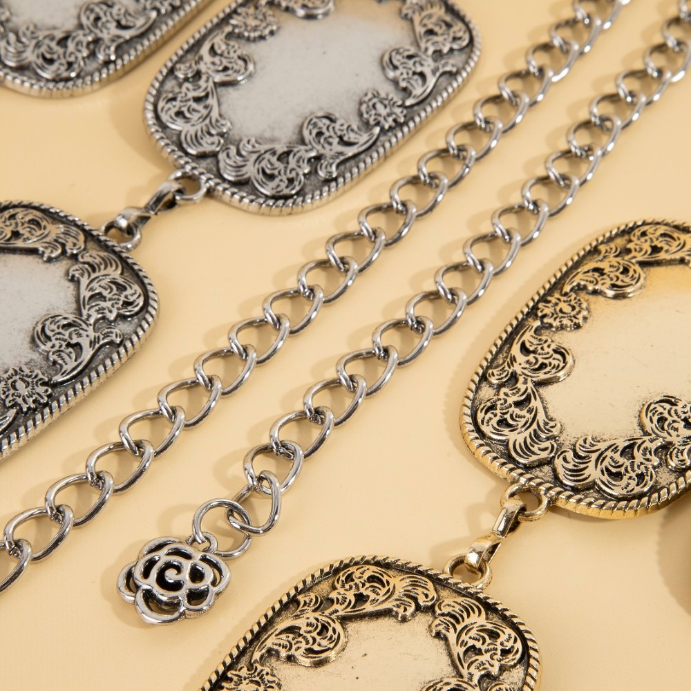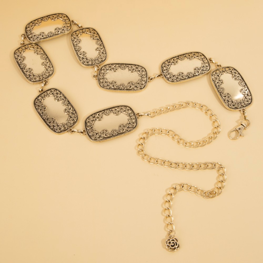 • Make a statement, this chain belt introduces an exceptional rectangle concho design. Perfect for dressing up your favorite outfit, this chain belt is a must-have. Available in G, S. This item is sold in packs of 1.