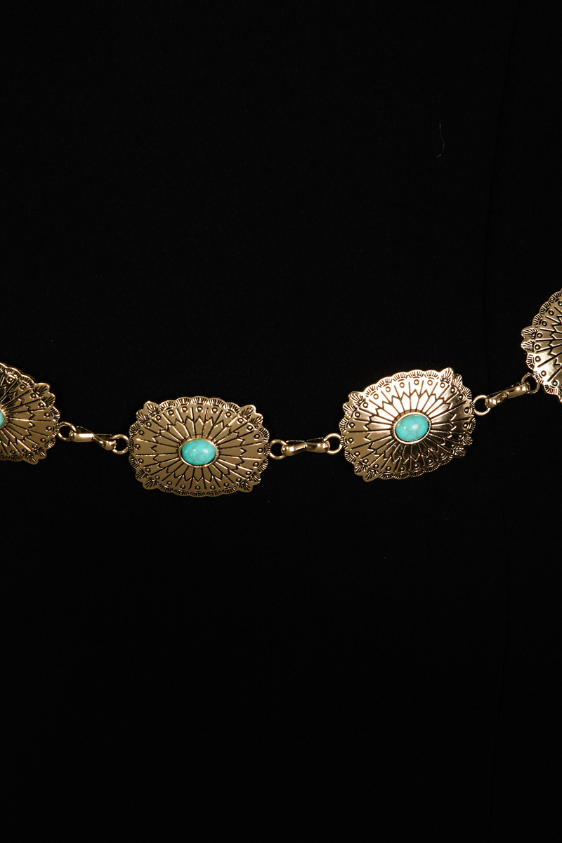 - Elevate any look, this chain belt showcases a breathtaking turqoise studded oval design. Perfect for adding some texture and dimension to any outfit, this chain belt is a must-have. Available in G, S. This item is sold in packs of 1.