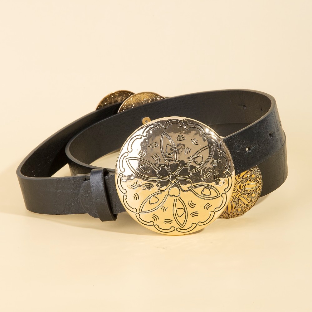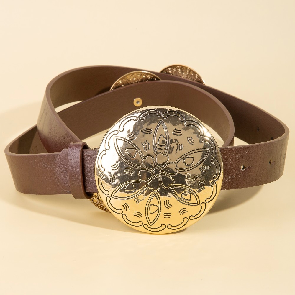 • The perfect way to add some sparkle to your outfit, this leather belt shows off a distinctive large circle concho disc design. Unleash the power of style with this versatile leather belt, perfect for enhancing the charm of your wardrobe. Available in GBK, GCO, SBK. This item is sold in packs of 1.