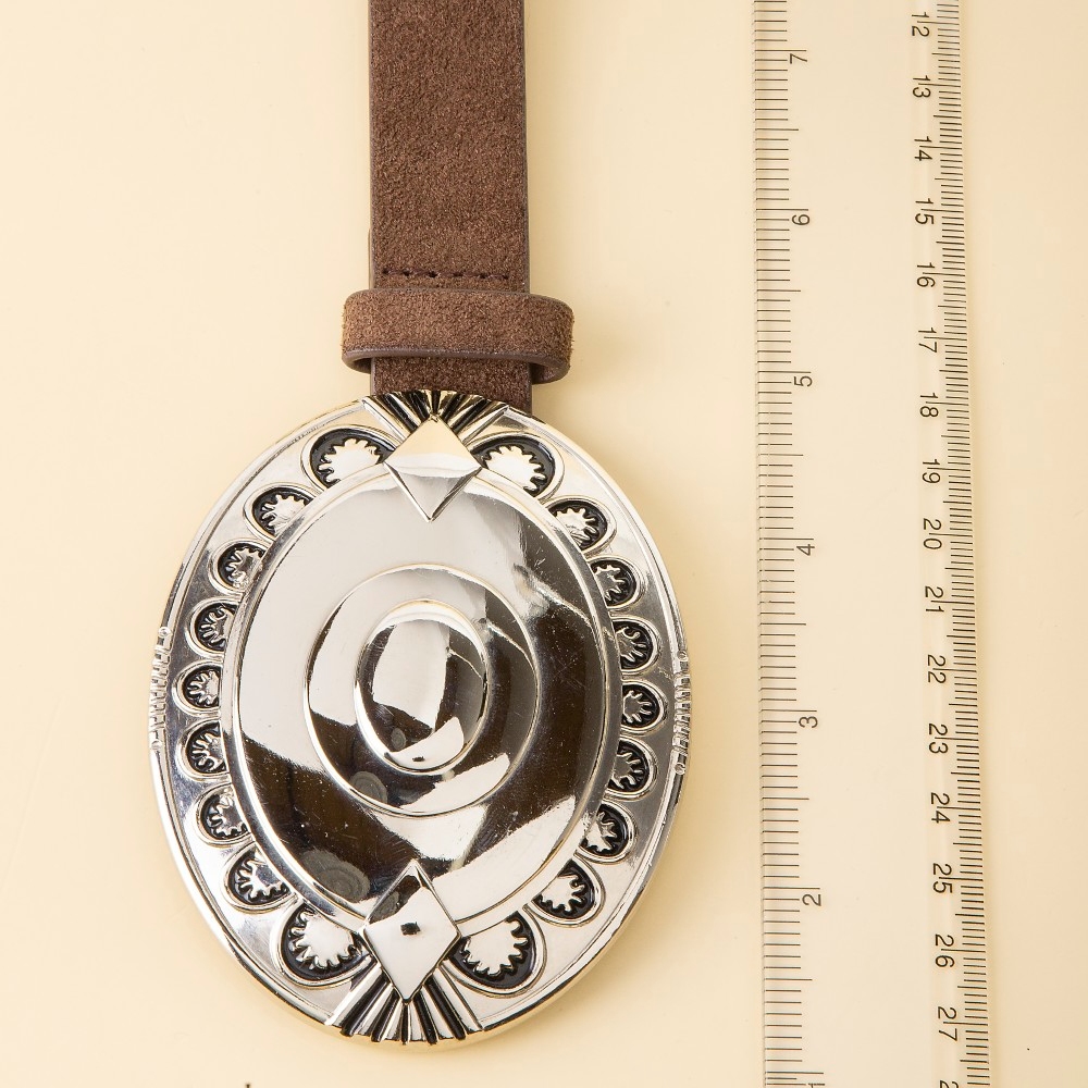 This piece is designed to make a statement, this leather belt incorporates a flawless large oval concho disc design. This leather belt is the perfect way to add a touch of elegance to any outfit. Available in GBK, SBK, SCO. This item is sold in packs of 1.