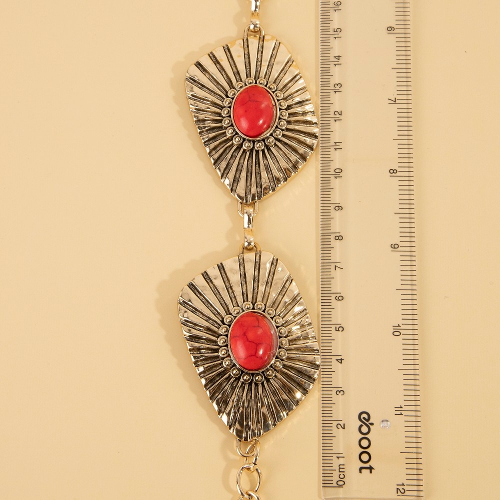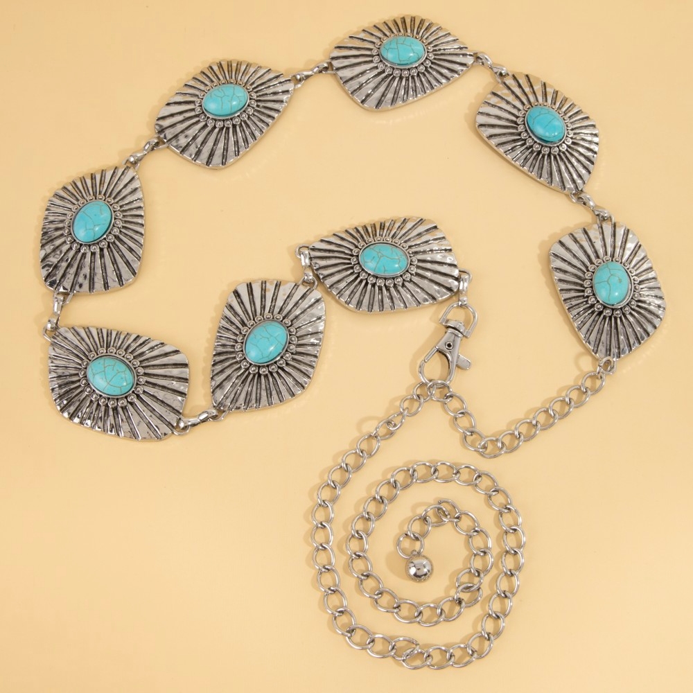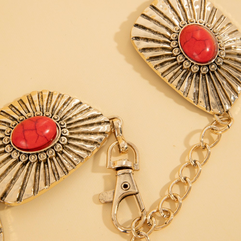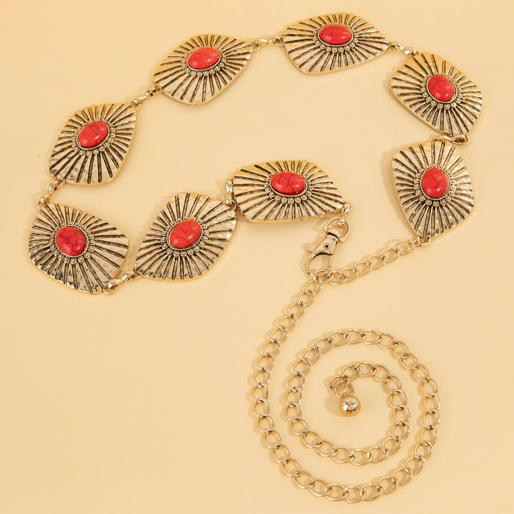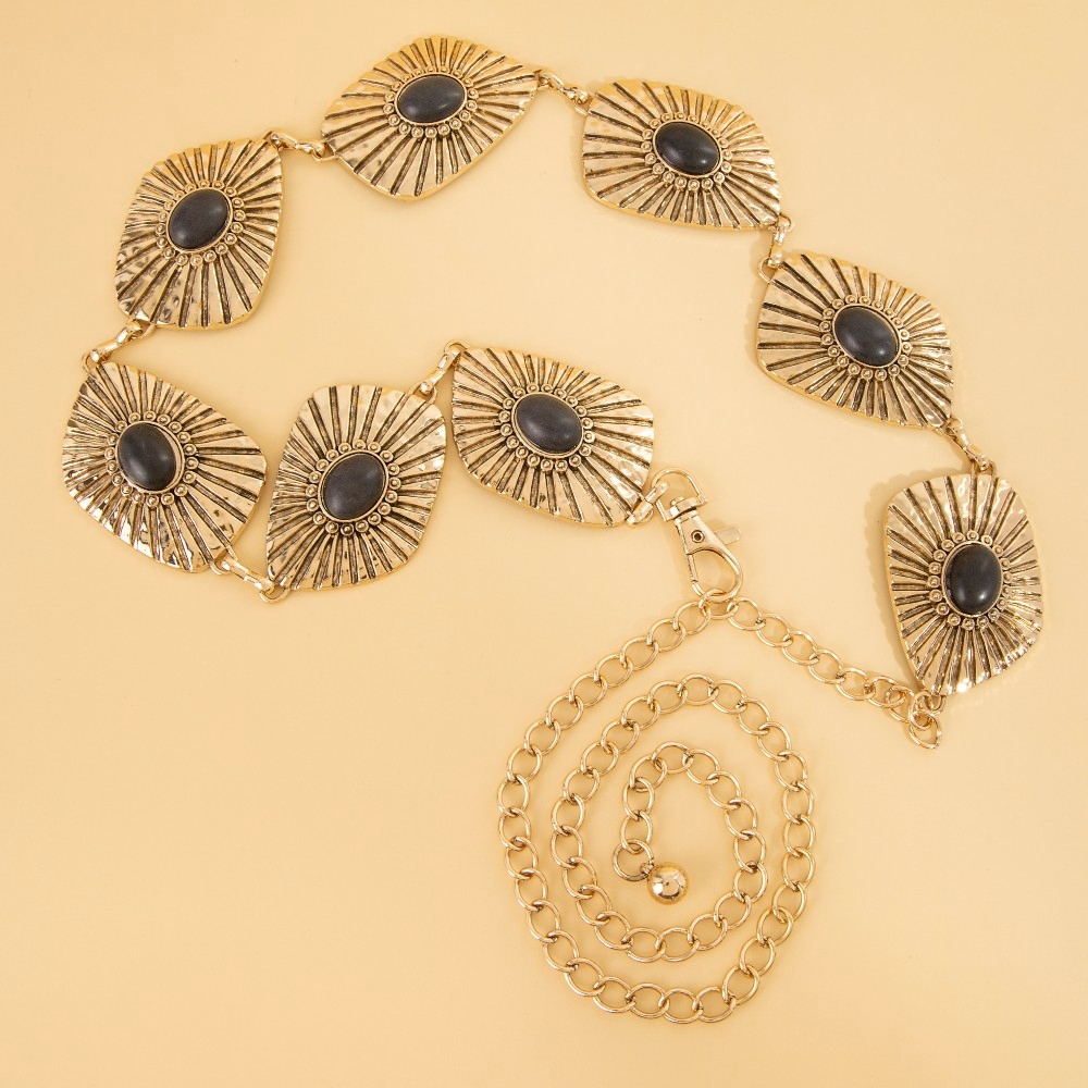 • Stay on-trend and ahead of the fashion curve, this belt carries a charming stone detail concho chain link design. Upgrade your fashion game with this versatile belt, a timeless addition that complements any outfit seamlessly. Available in GBK, GRD, SBL. This item is sold in packs of 1.