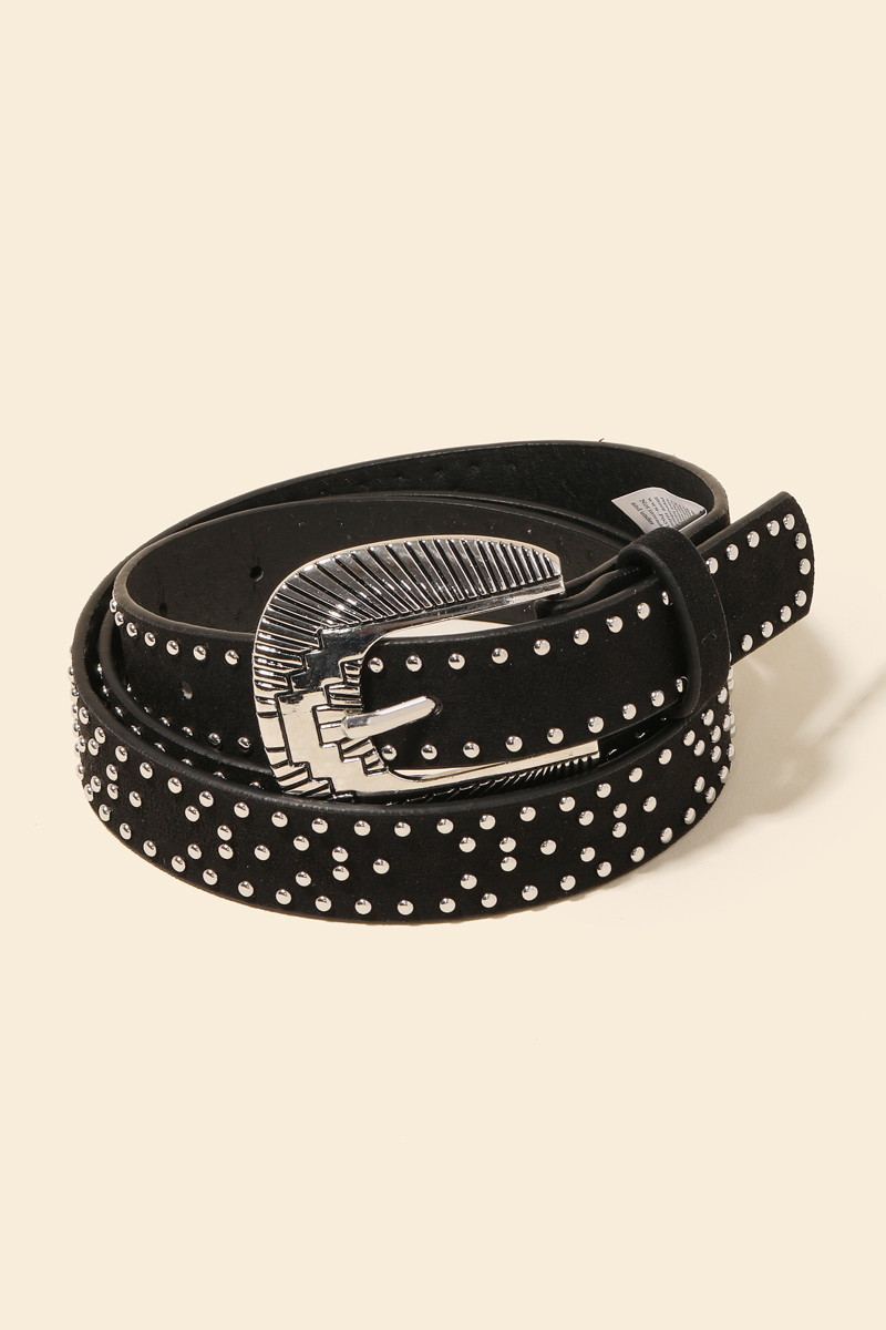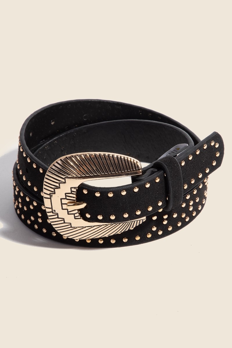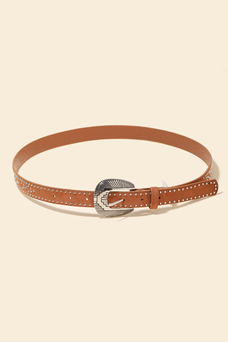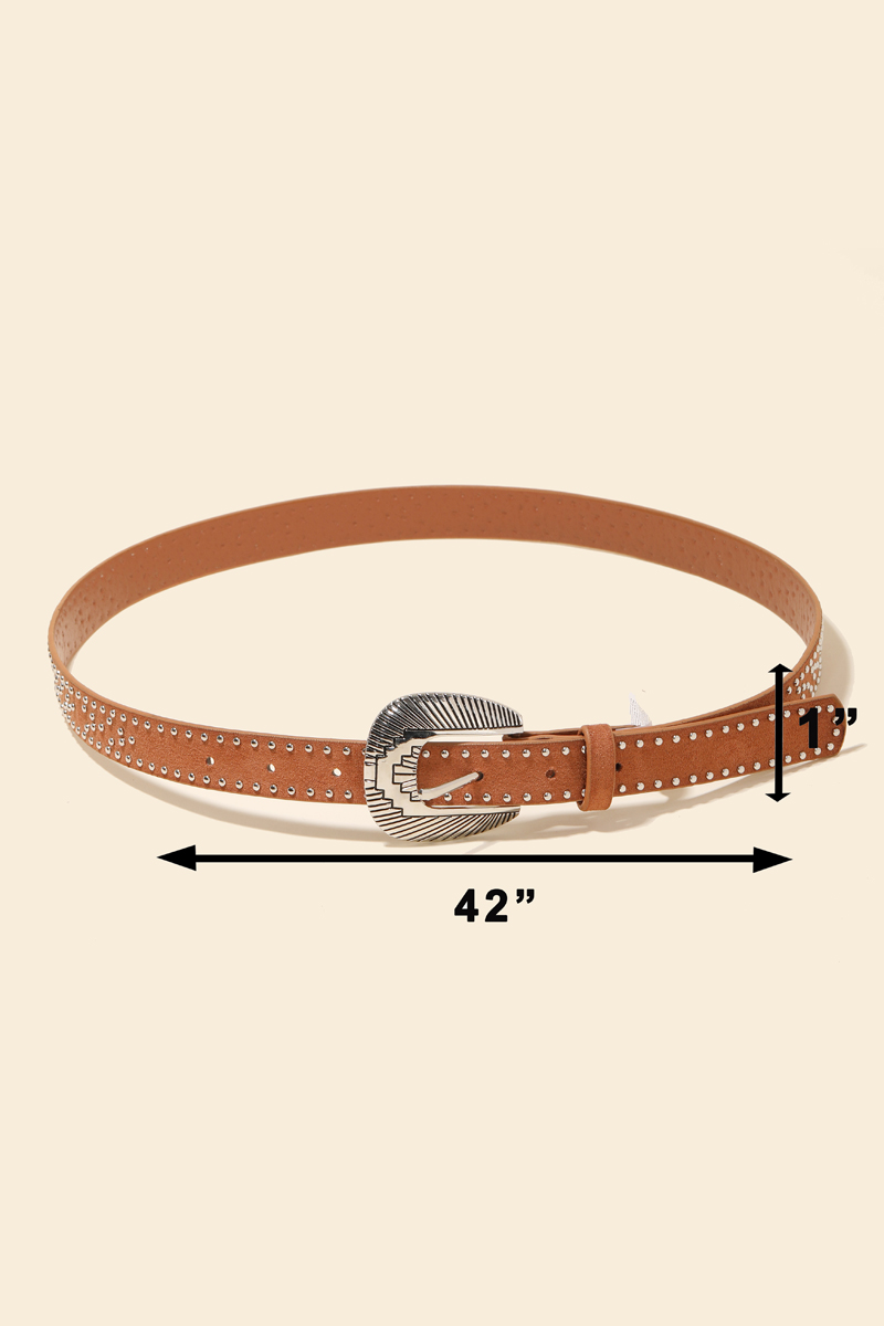 • A unique and stylish piece that sets you apart, this faux leather belt emanates an elegant studded western design. Add a touch of glamour to your wardrobe with this versatile faux leather belt, perfect for enhancing the elegance of any look. Available in BR, GBK and SBK. This item is sold in packs of 1.