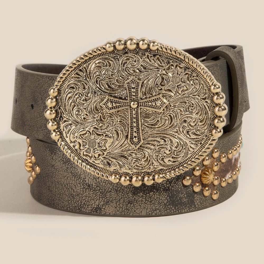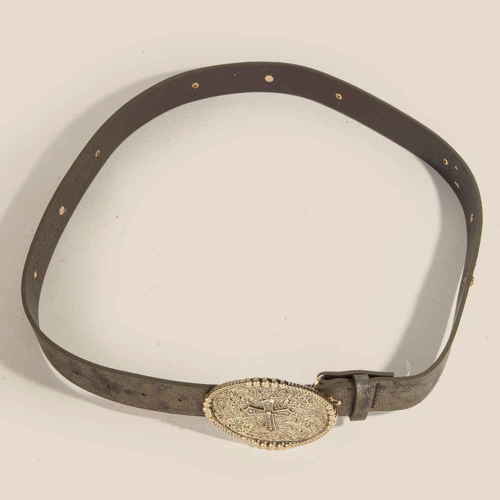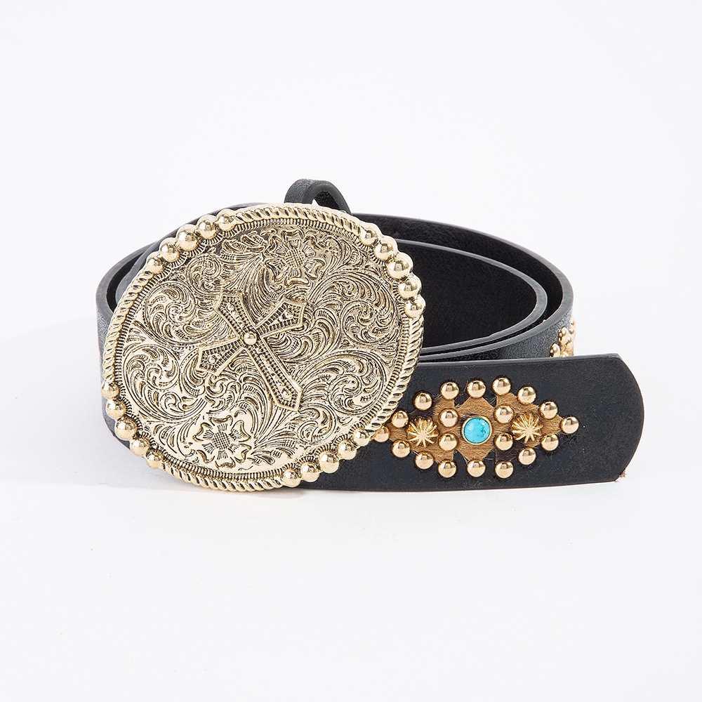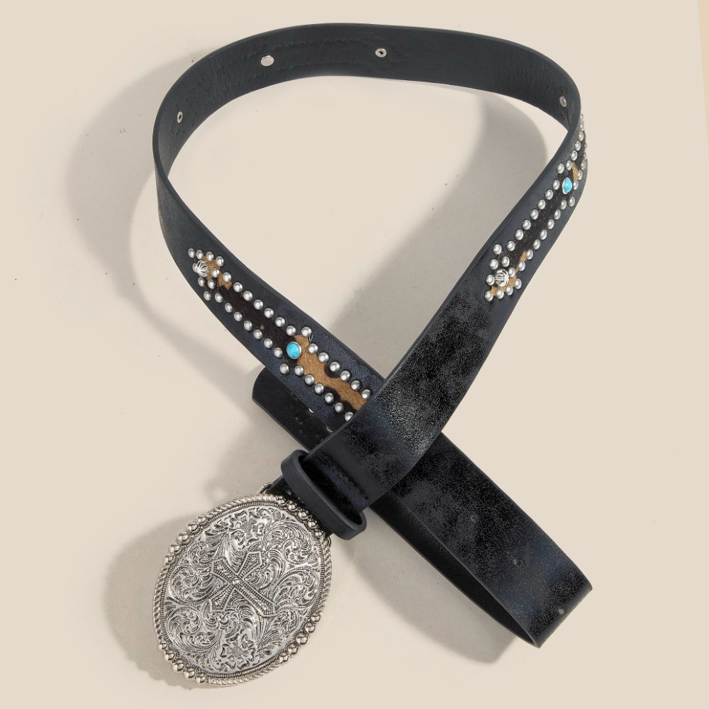 Perfect for any fashion-forward individual, this belt displays a unique vegan leather embroidered cowboy buckle design. This belt is ideal for both casual and formal events, adding a touch of sophistication to any outfit. Available in GBK, GBR, SBK. This item is sold in packs of 1.