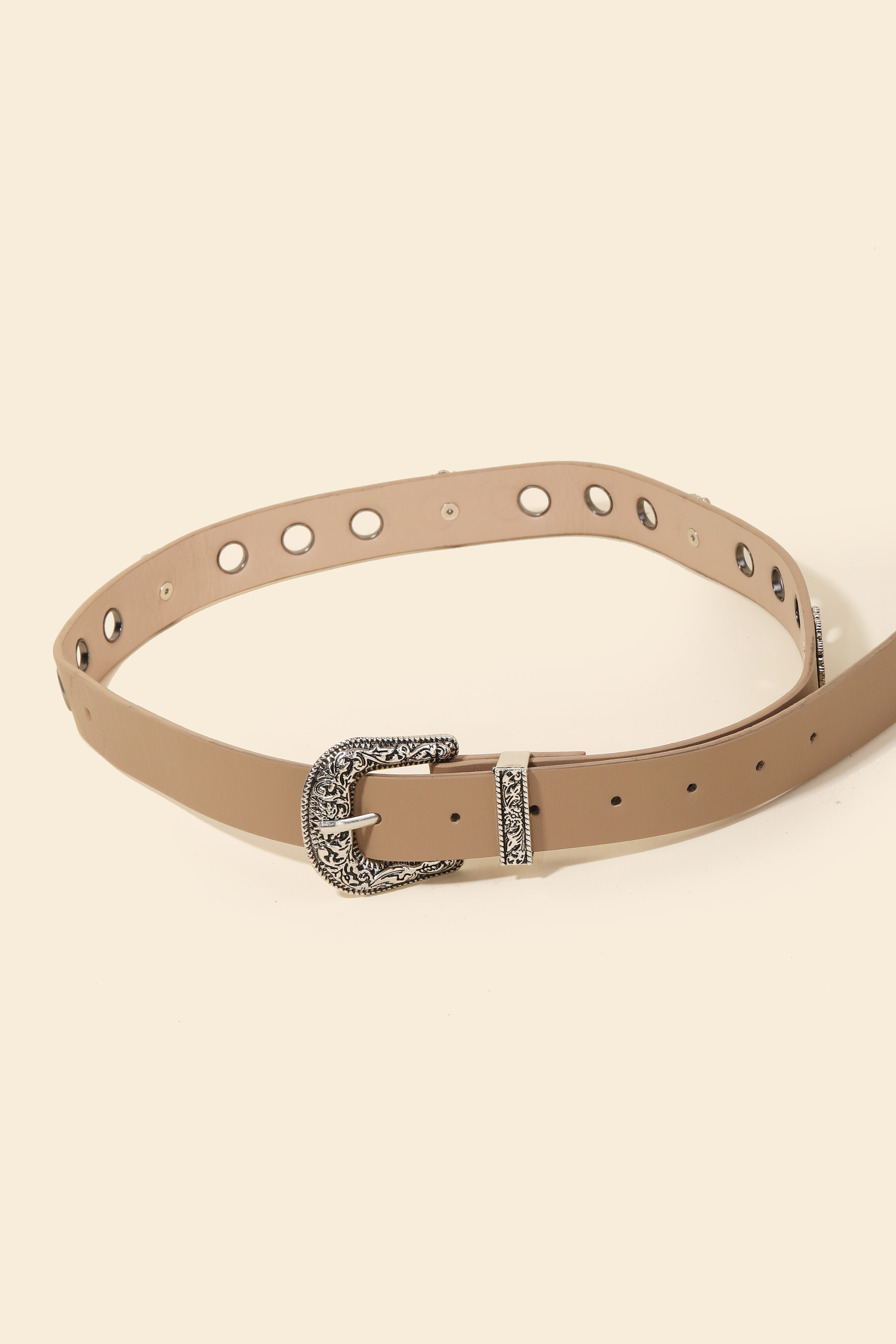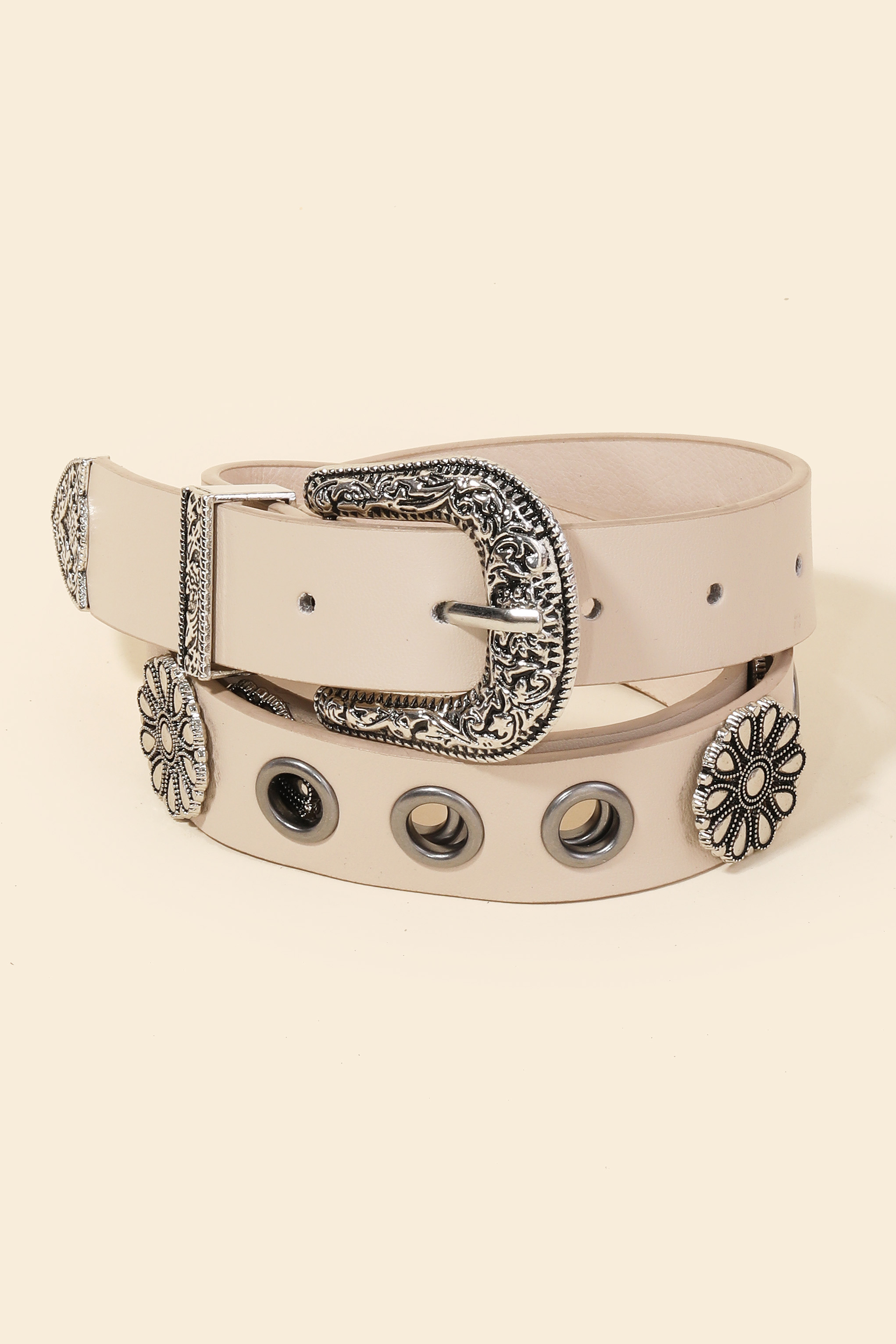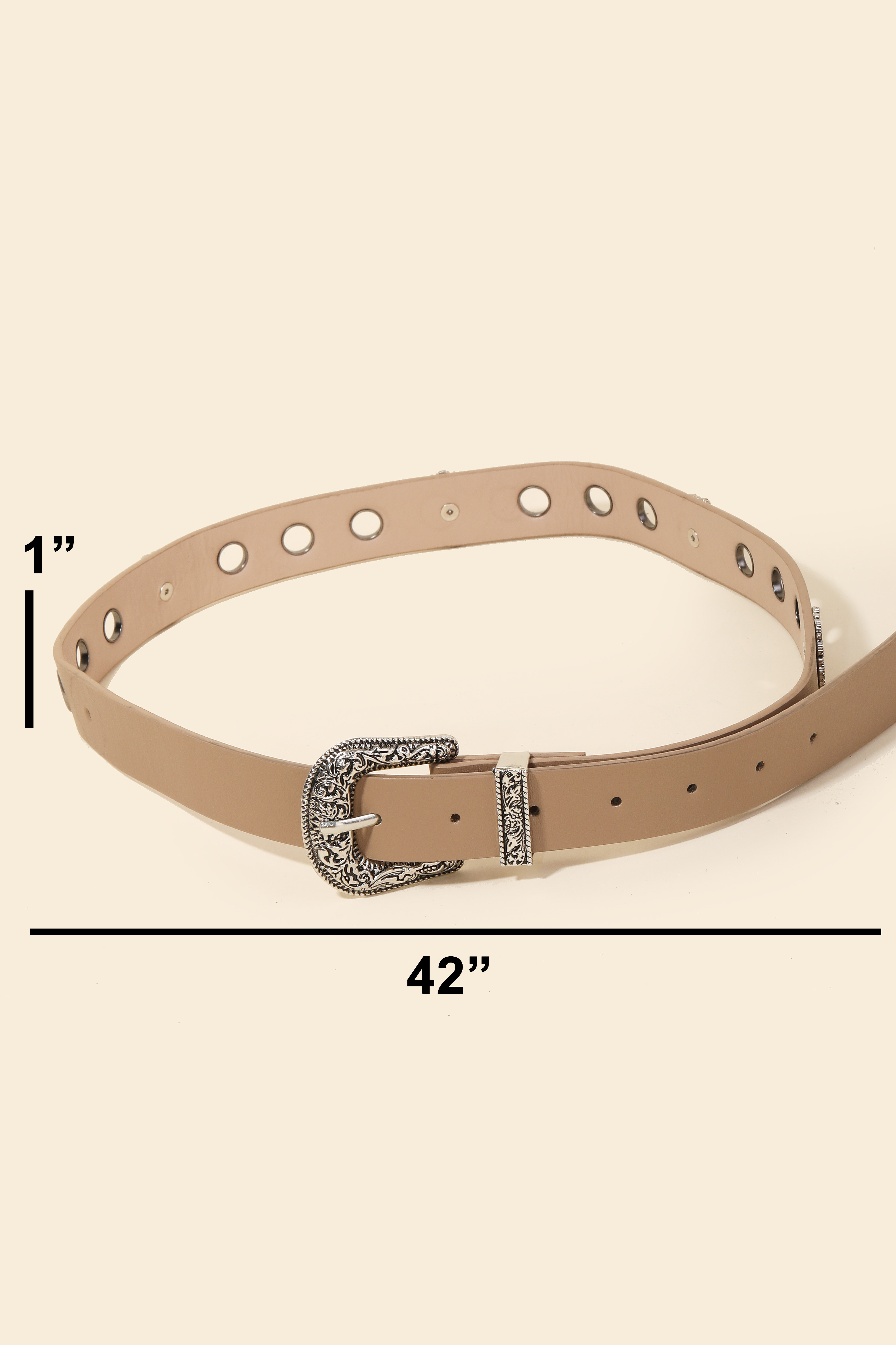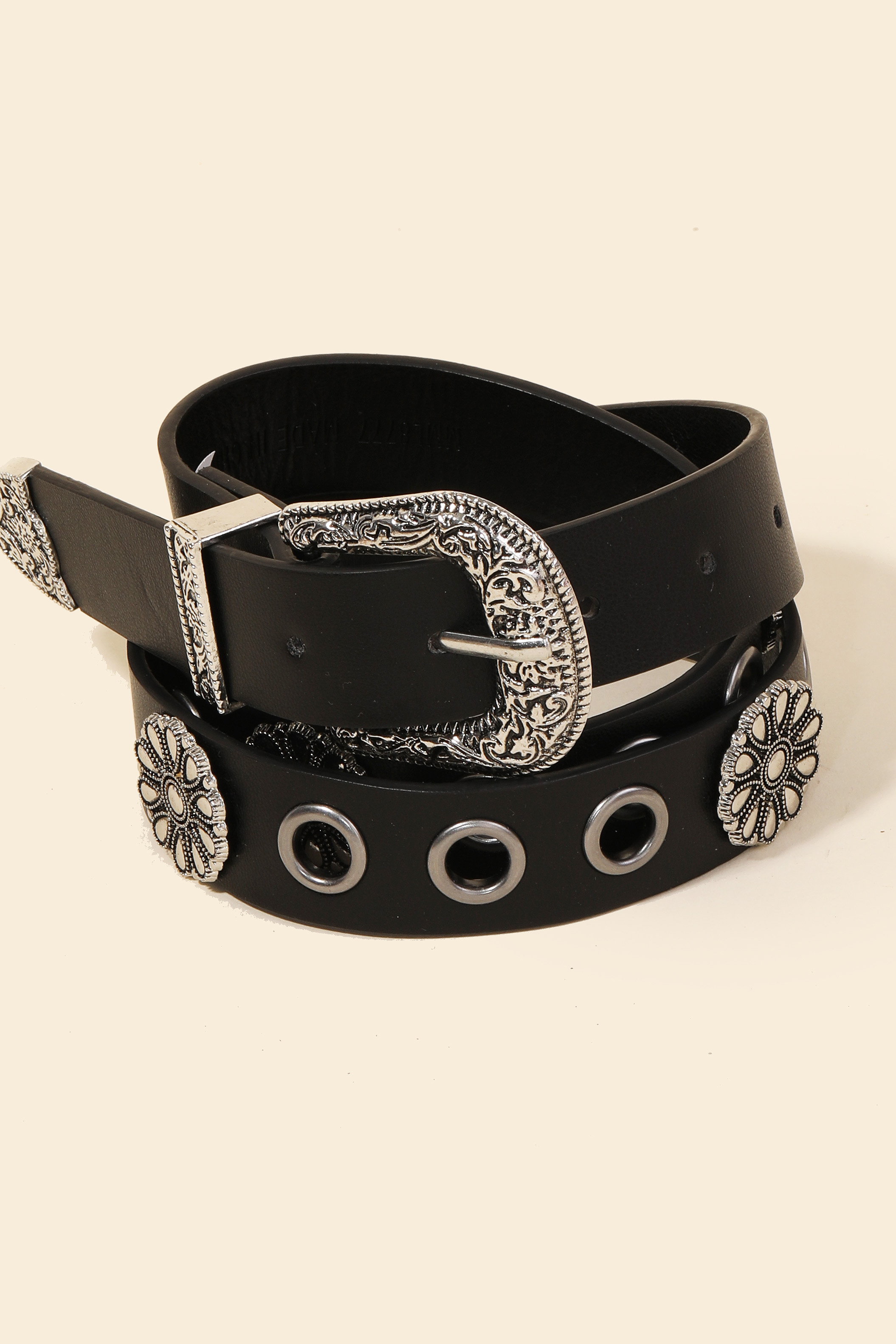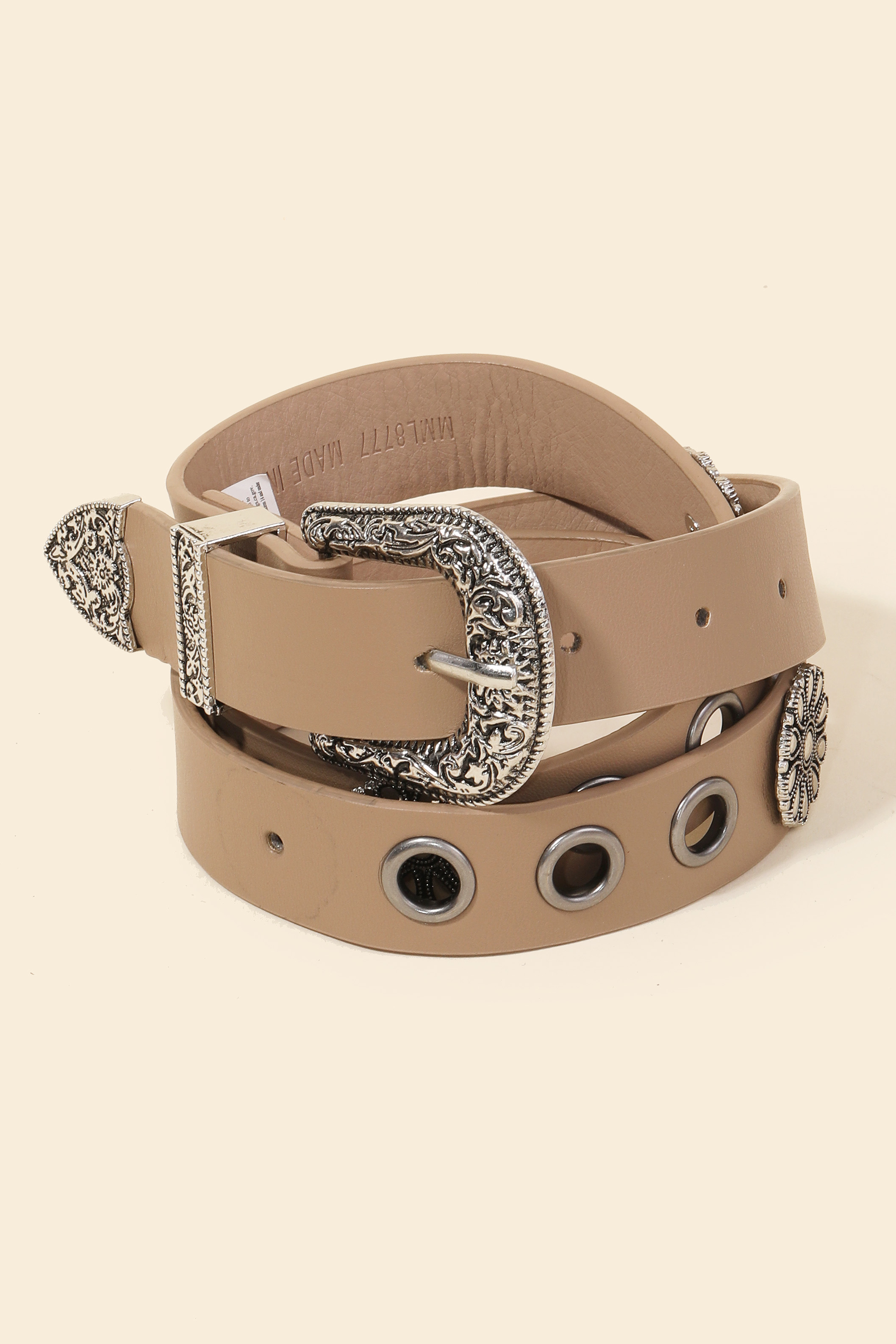 A timeless piece that you'll wear for years to come, this faux leather belt features an exceptional western etched buckle design. Unleash the potential of your wardrobe with this versatile faux leather belt, ensuring a touch of elegance in every ensemble. Available in BK, IV and KA. This item is sold in packs of 1.