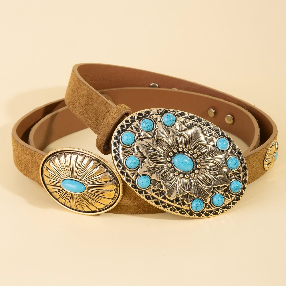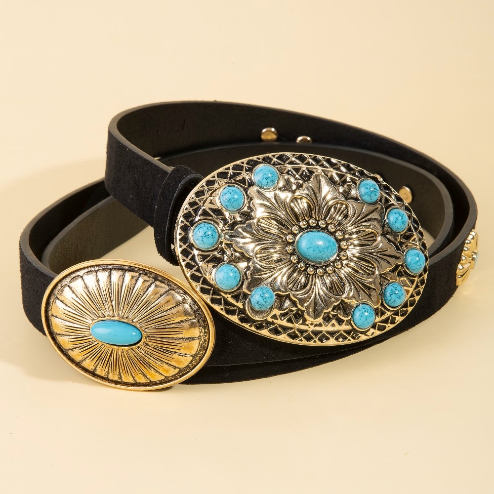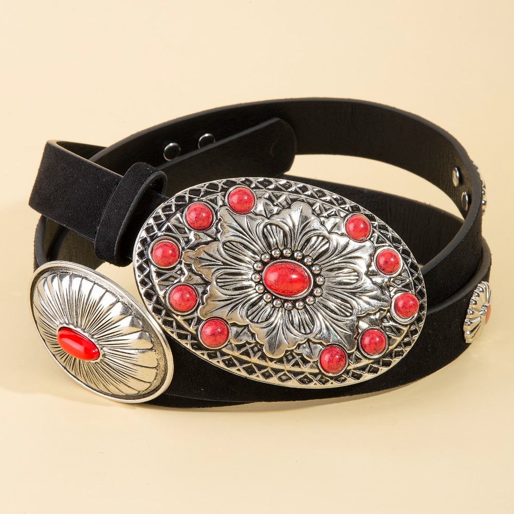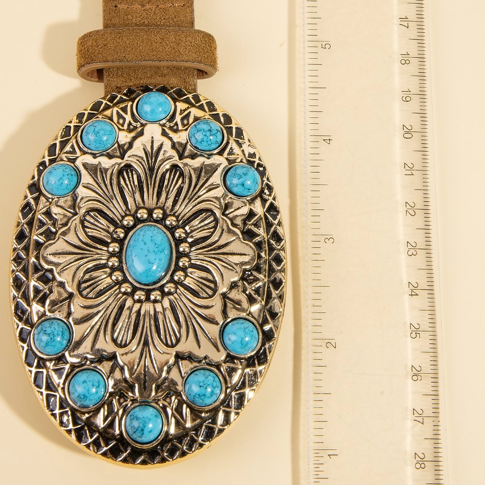 Western Rectangle Embroidered Concho Buckle Vegan Leather Belt