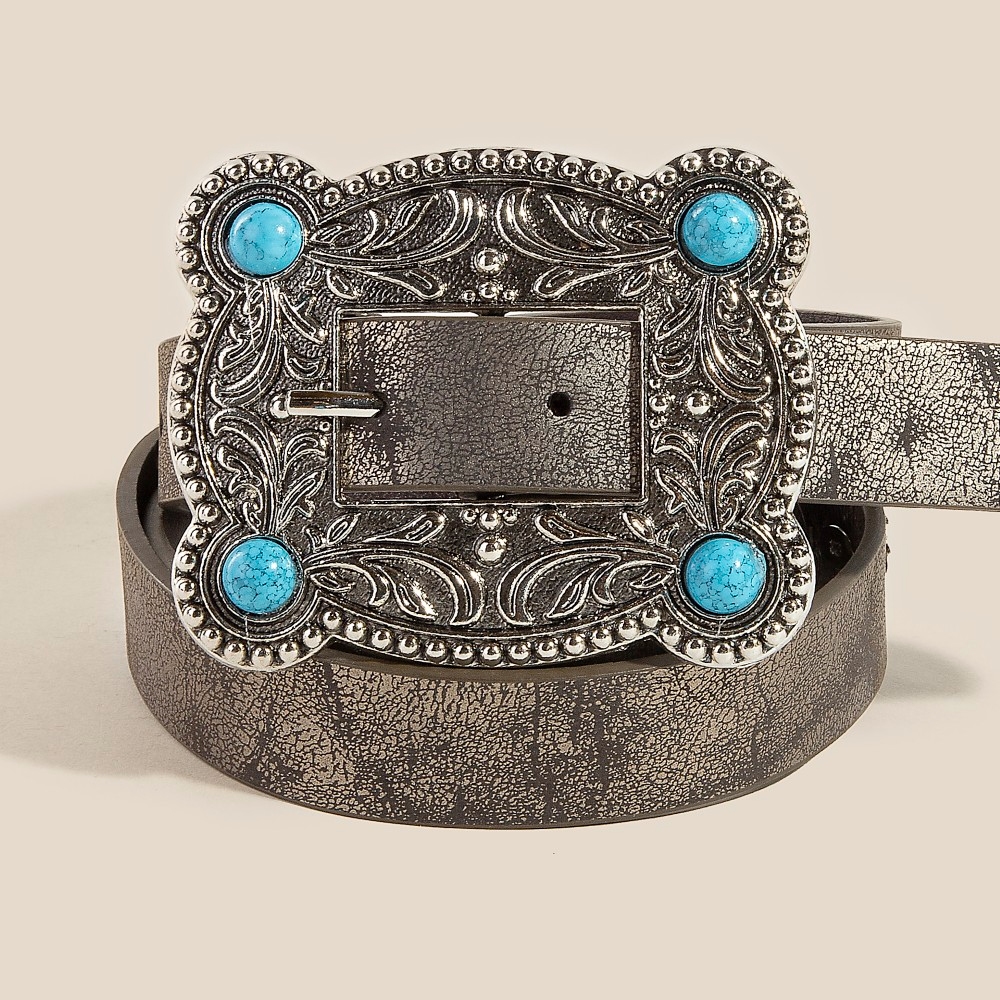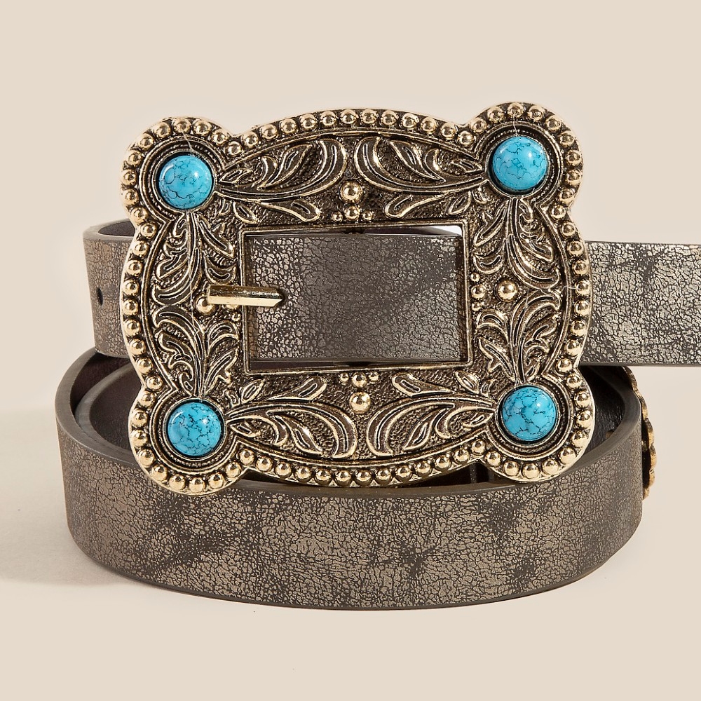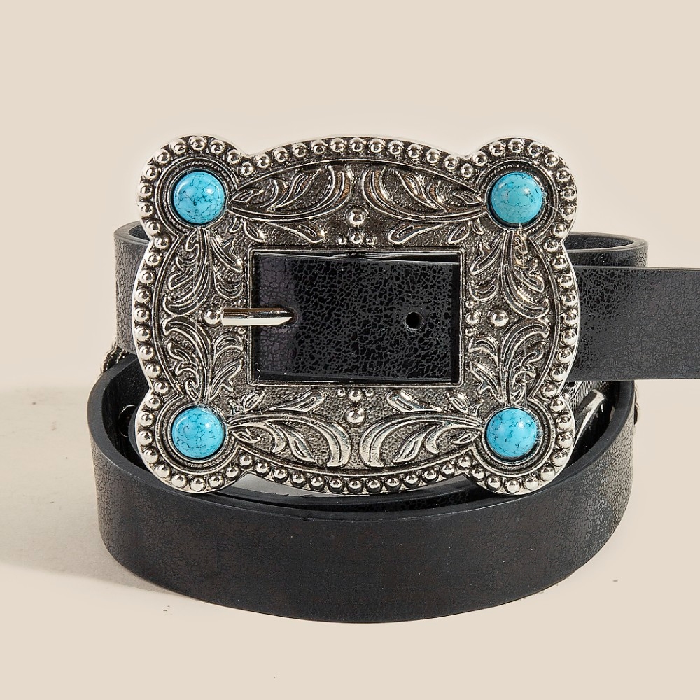 • This season's hottest belt, this belt incorporates a flawless western turquoise stud rectangle concho buckle design. Achieve a perfect balance of style and sophistication with this versatile belt, the ultimate choice for the fashion-savvy individual. Available in GBR, SBK, SBR. This item is sold in packs of 1.