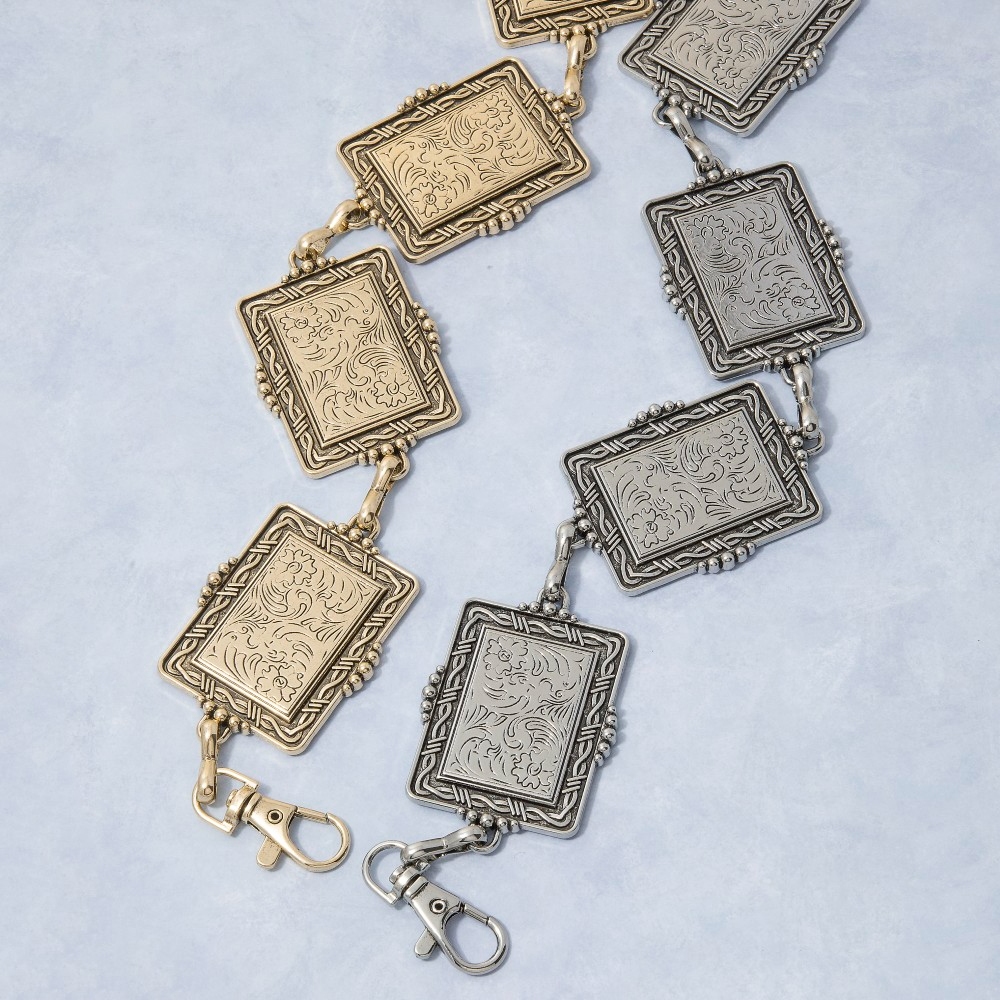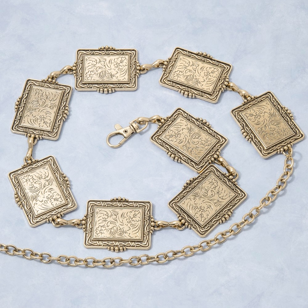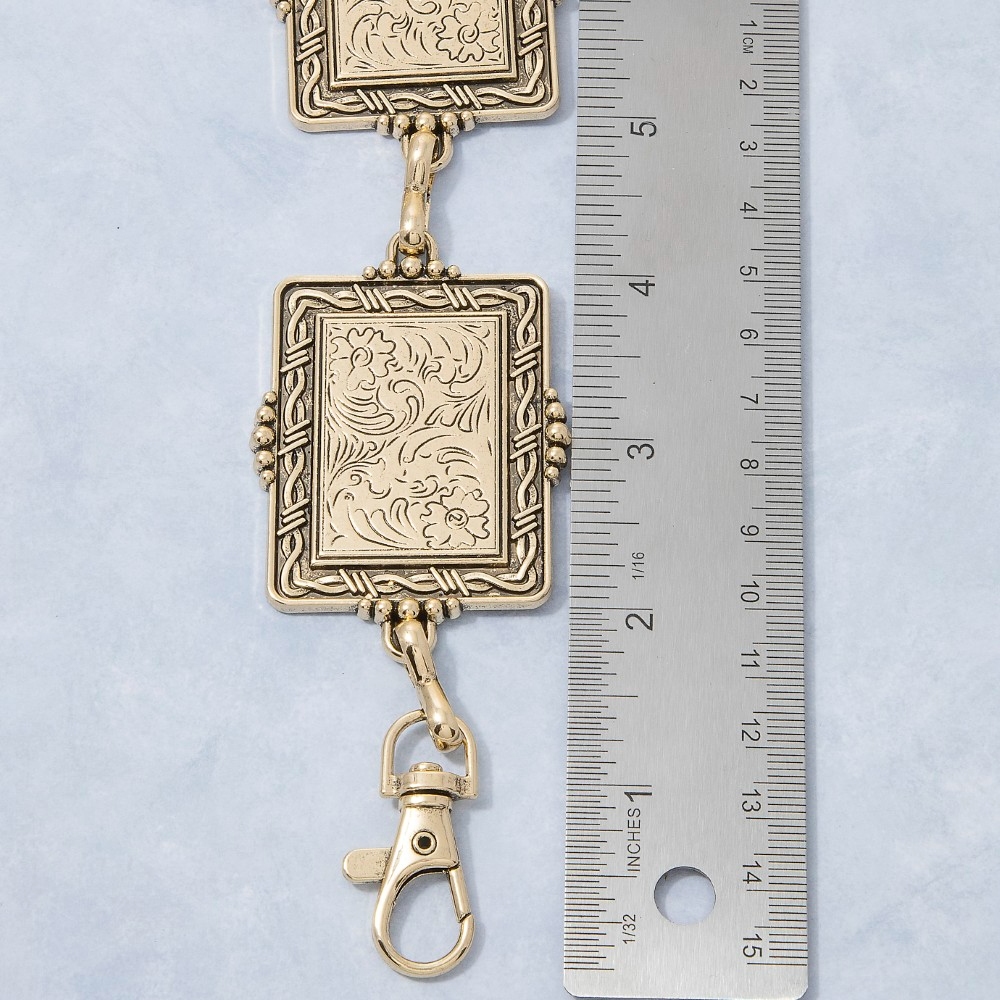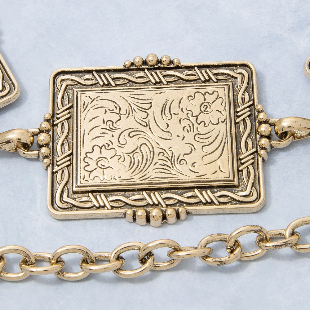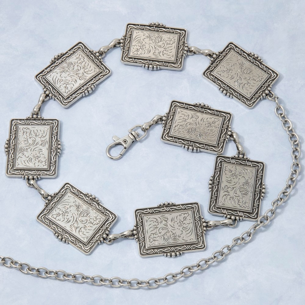 Make a statement, this chain belt contains a special floral rectangle concho link design. Perfect for adding a touch of glamour and sophistication to any outfit, this chain belt is a must-have. Available in G, S. This item is sold in packs of 1.
