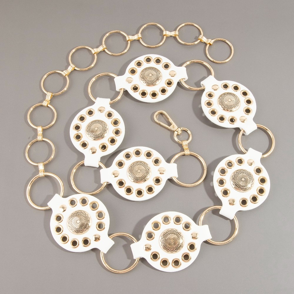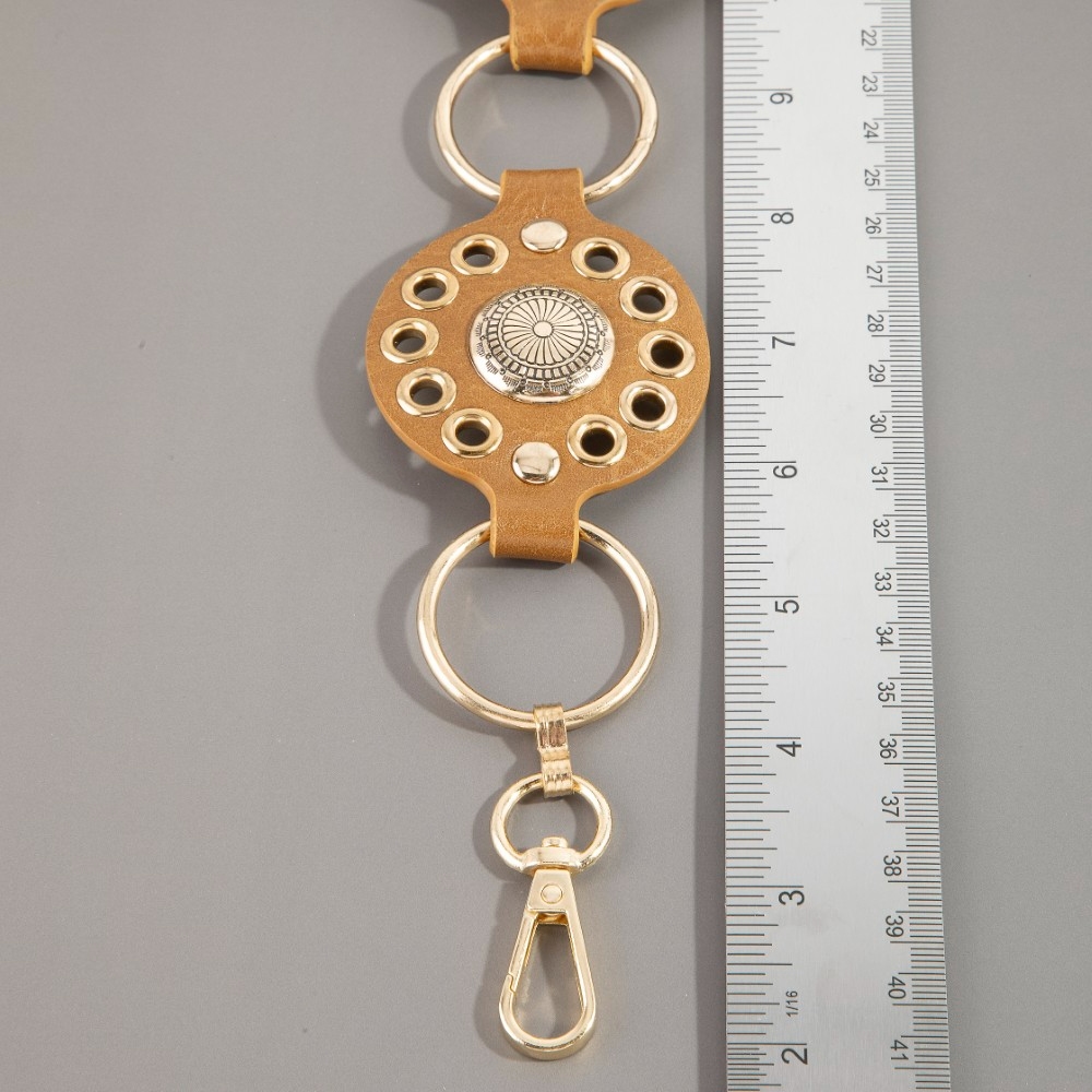 • A contemporary masterpiece, this chain belt features a distinct gold concho ring leather design. This chain belt is the perfect way to add a touch of elegance to any outfit. Available in B, BR, BZ, G, KH, W. This item is sold in packs of 1.