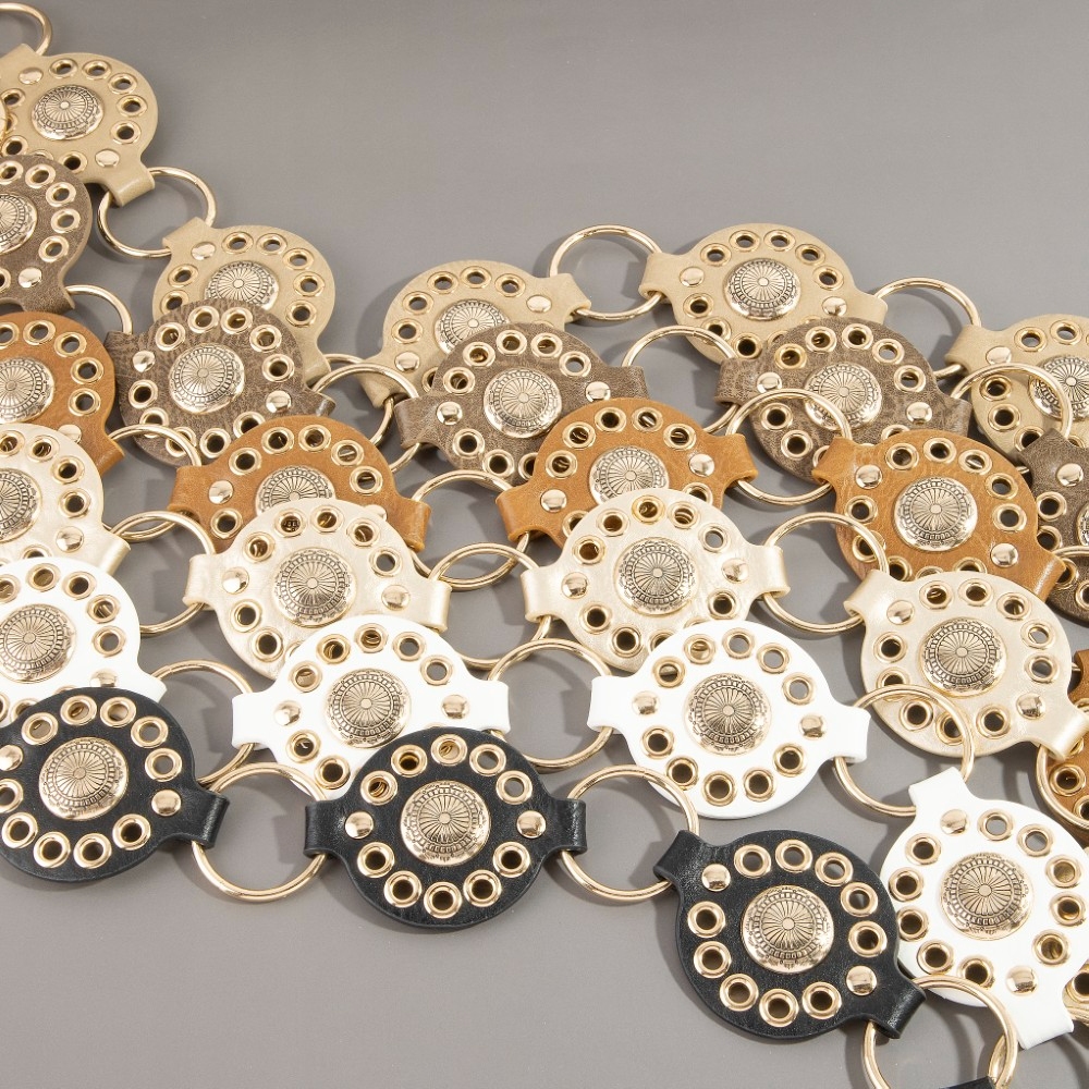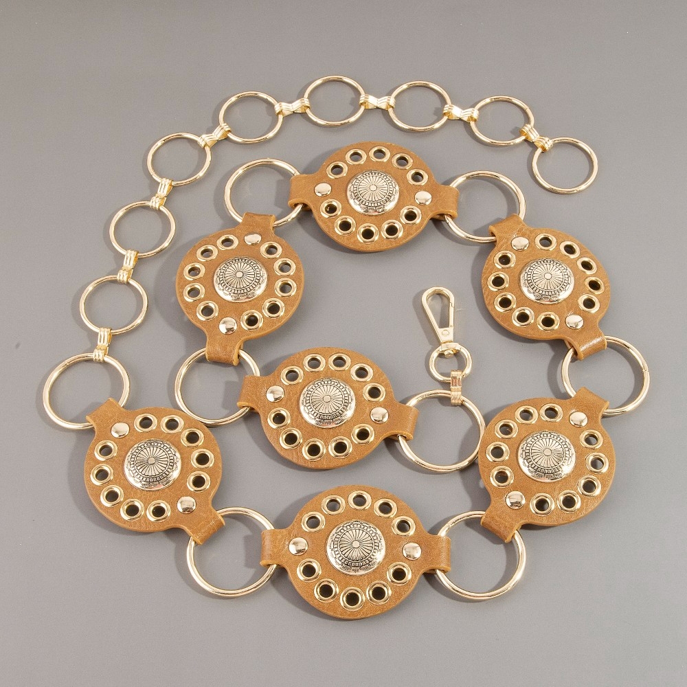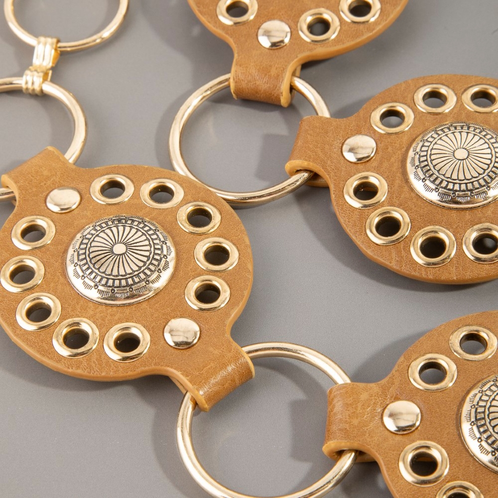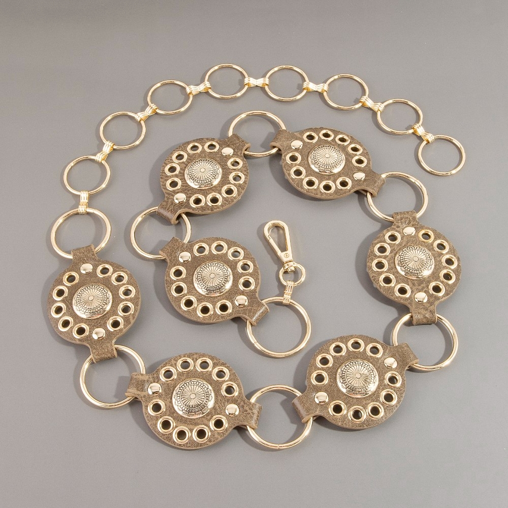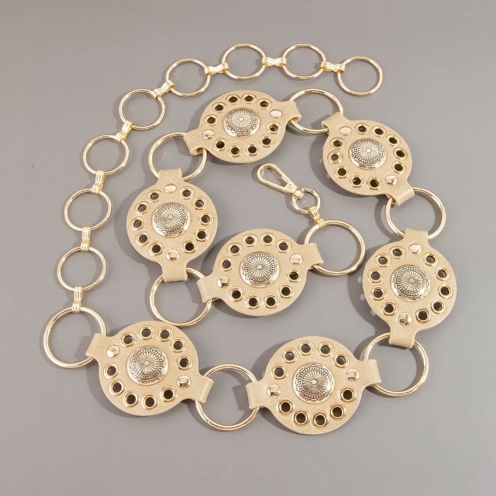 A contemporary masterpiece, this chain belt features a distinct gold concho ring leather design. This chain belt is the perfect way to add a touch of elegance to any outfit. Available in B, BR, BZ, G, KH, W. This item is sold in packs of 1.
