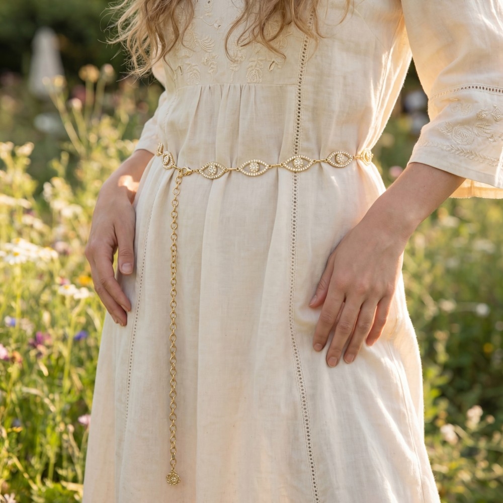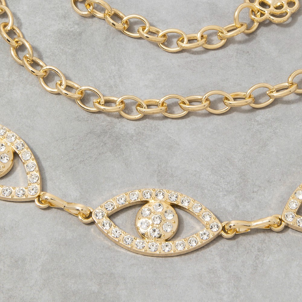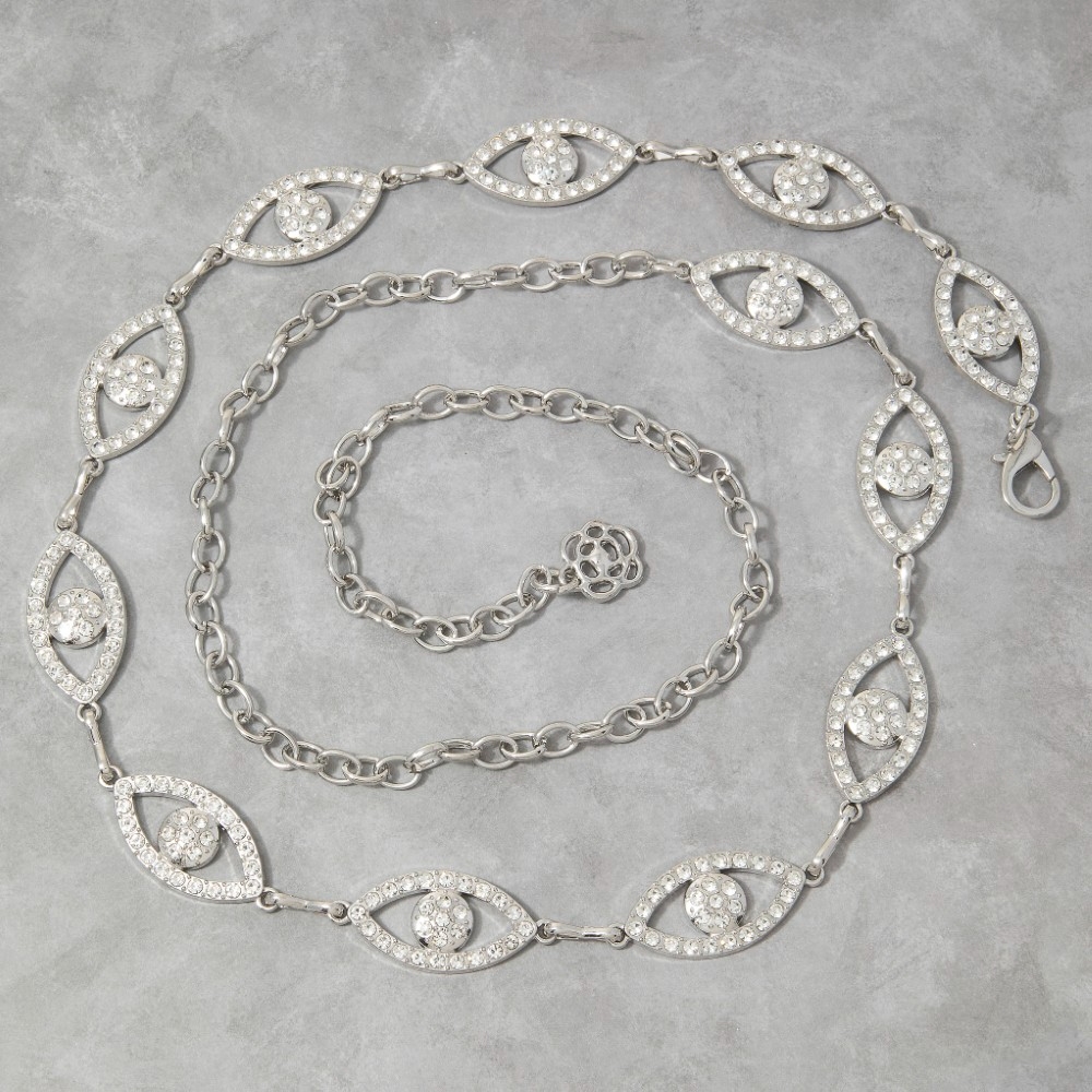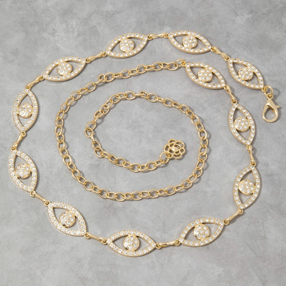 This piece is perfect for those who want to showcase their unique style, this chain belt reveals an intricate gold cubic zirconia evil eye link design. A stylish chain belt that's perfect for complementing your favorite outfit. Available in G, S. This item is sold in packs of 1.