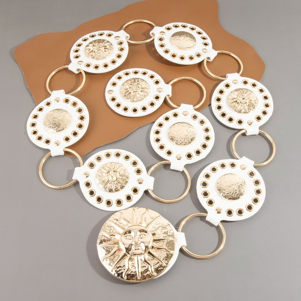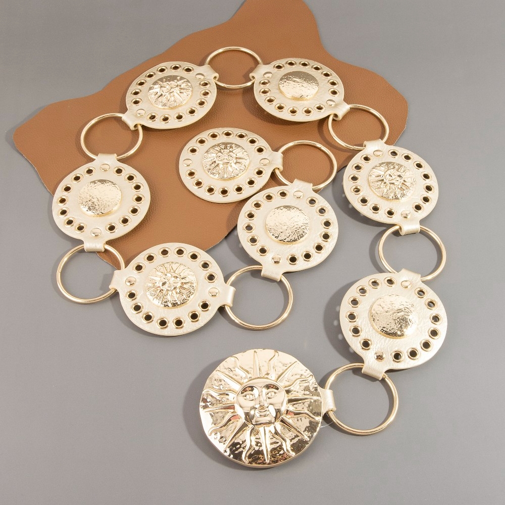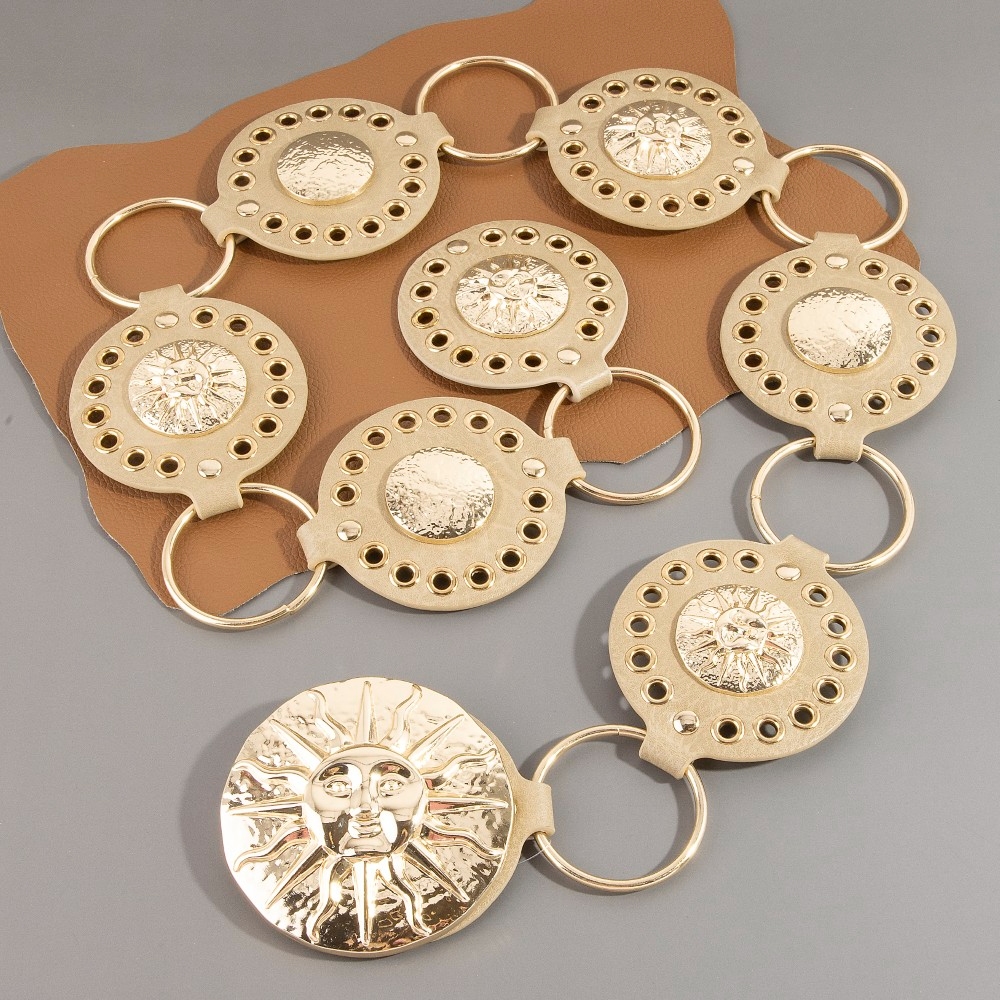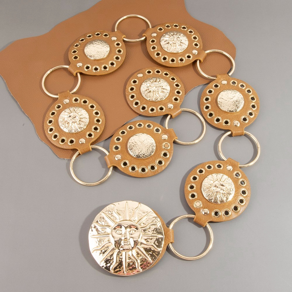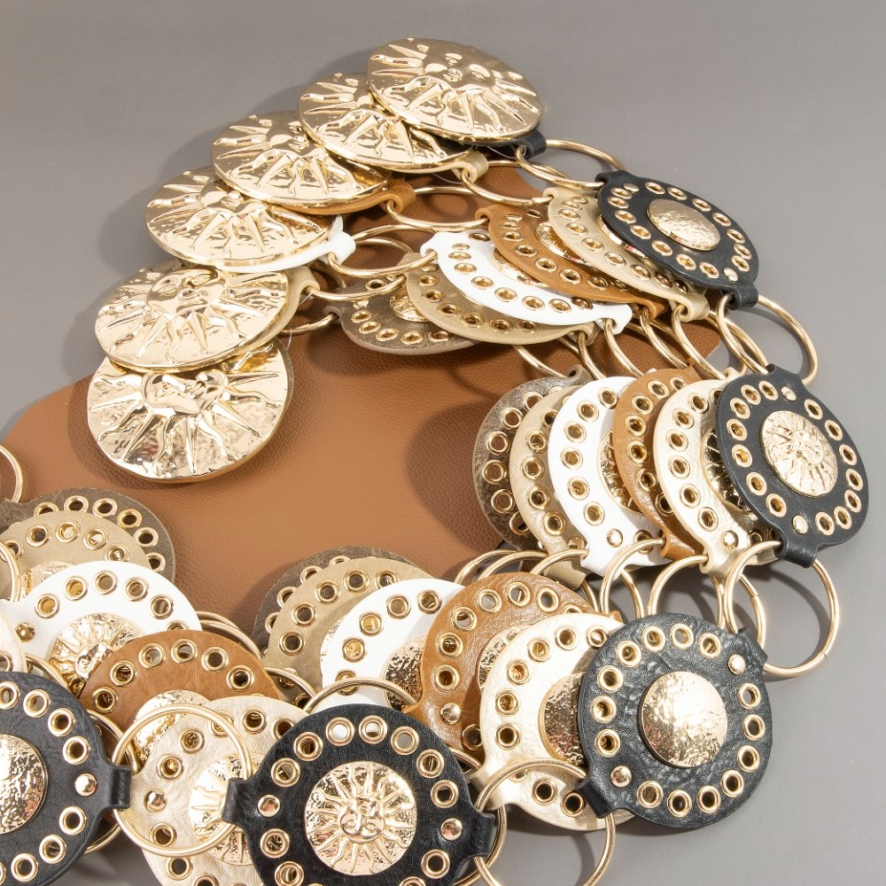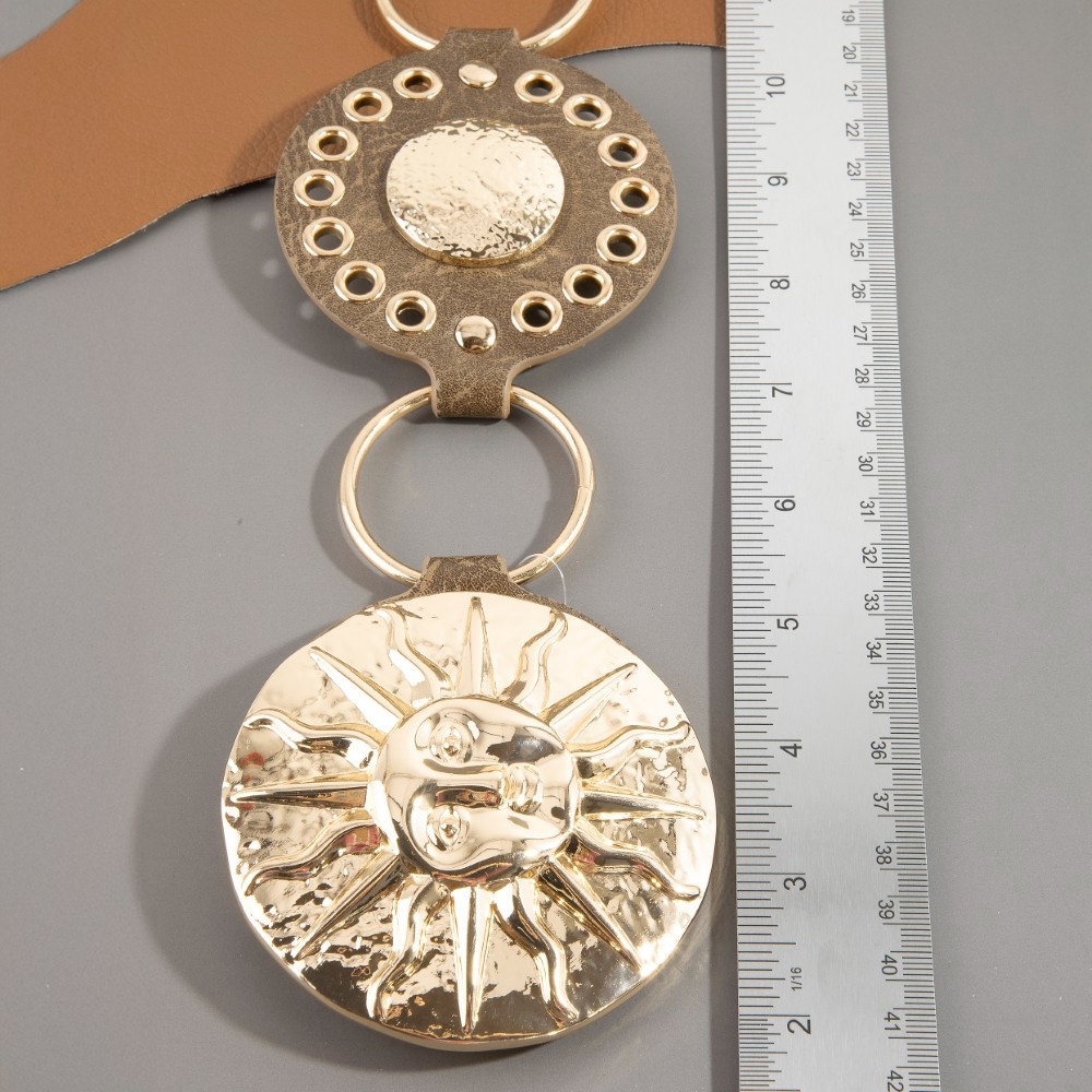 Stay on-trend and ahead of the fashion curve, this chain belt comes with a special gold sun concho ring design. This chain belt is a great way to add some glamour and sophistication to your outfit. Available in B, BR, BZ, G, KH, W. This item is sold in packs of 1.
