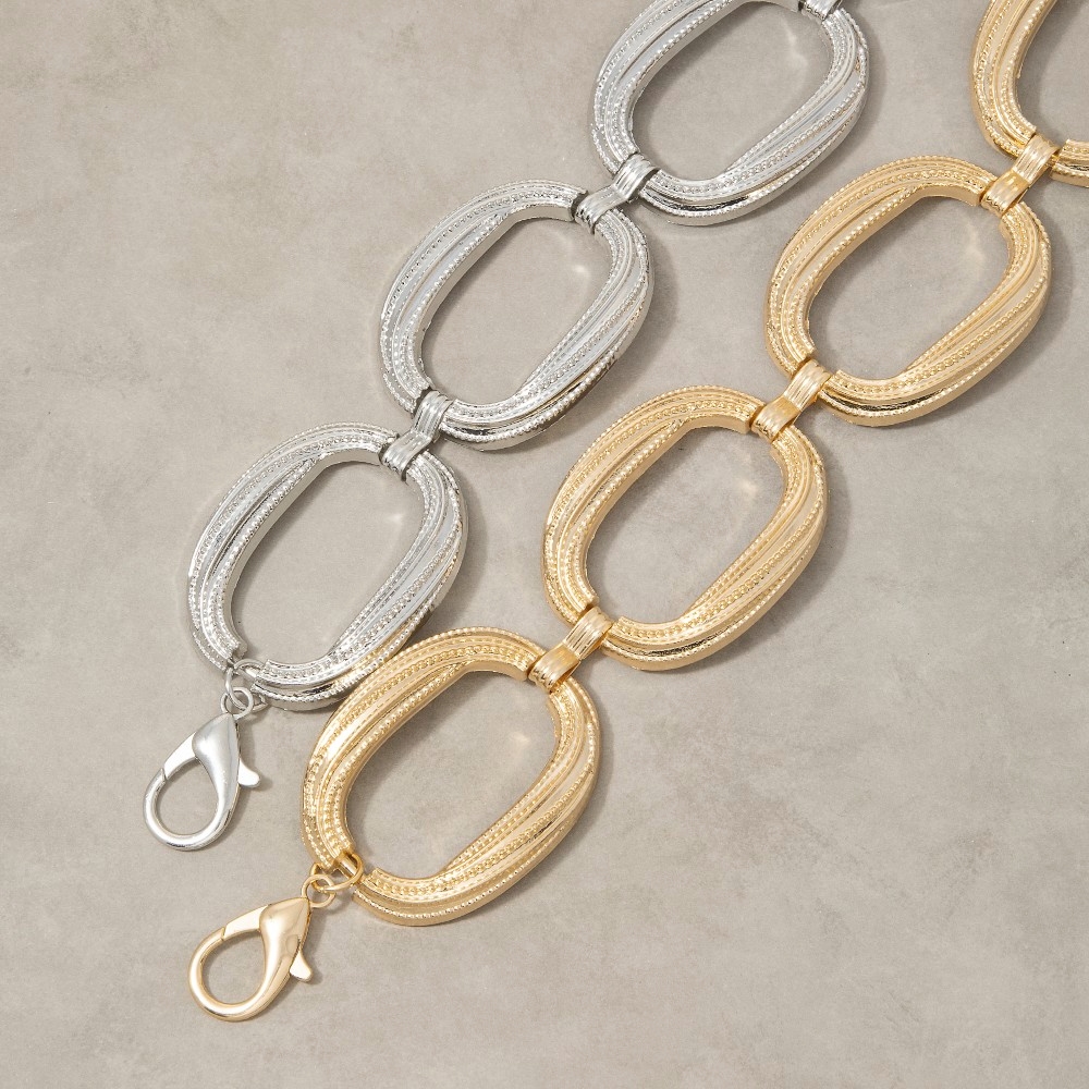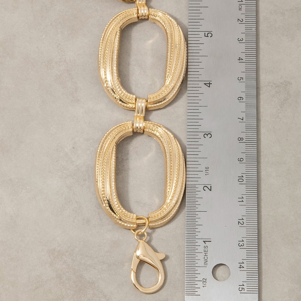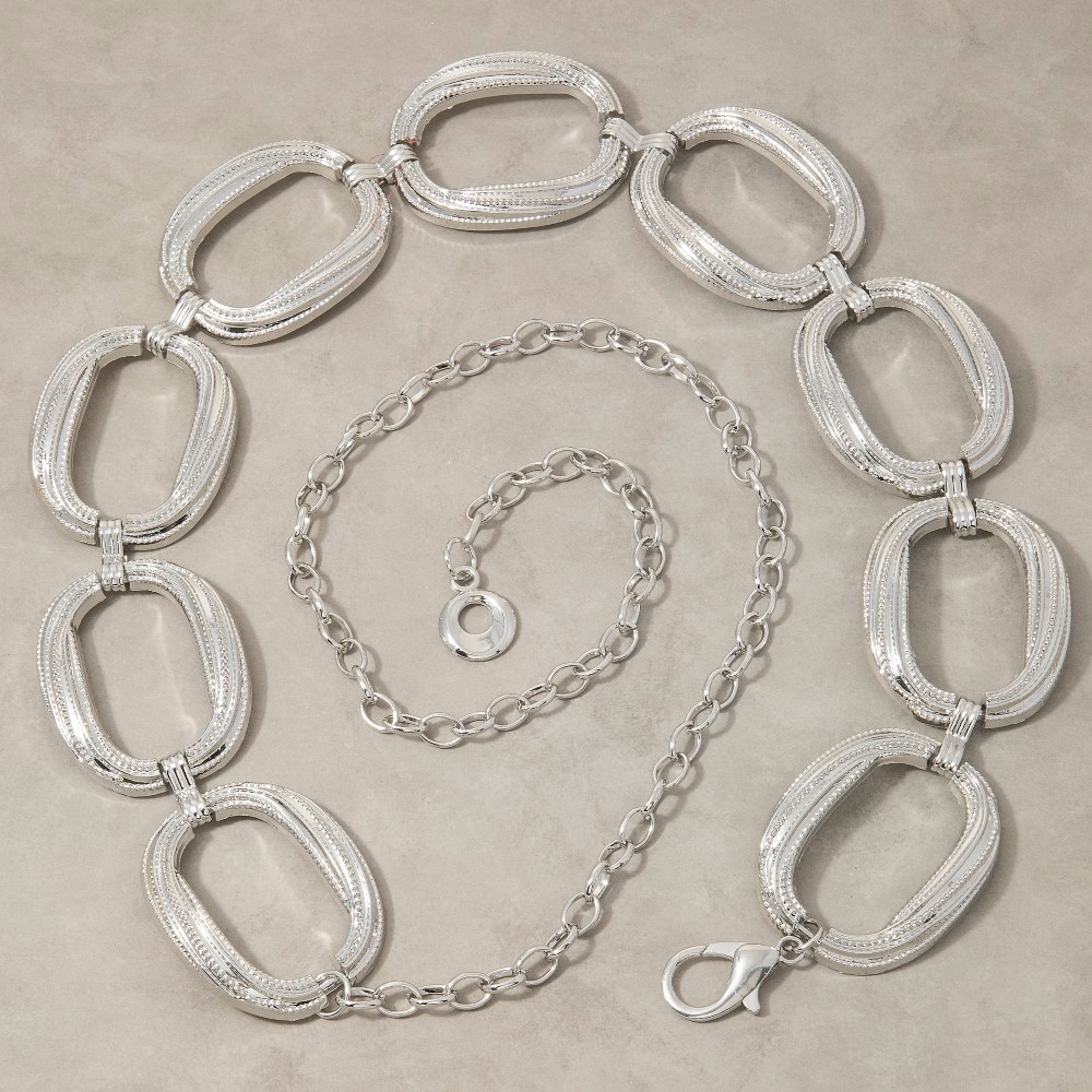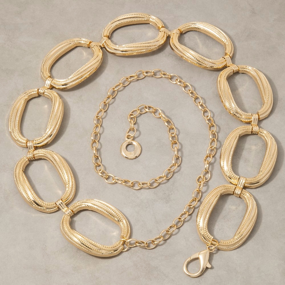 Effortlessly elevate your style, this chain belt flaunts a luxurious gold textured open oval link design. Infuse a hint of luxury into your daily attire with this versatile chain belt, a must-have for those who appreciate timeless elegance. Available in G, S. This item is sold in packs of 1.