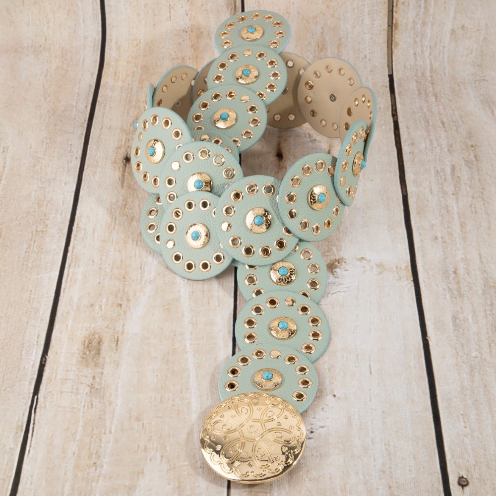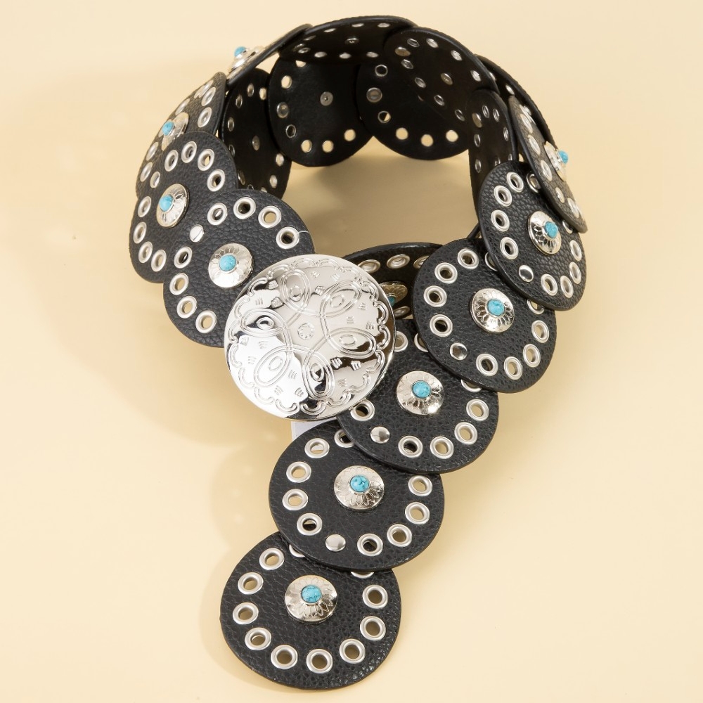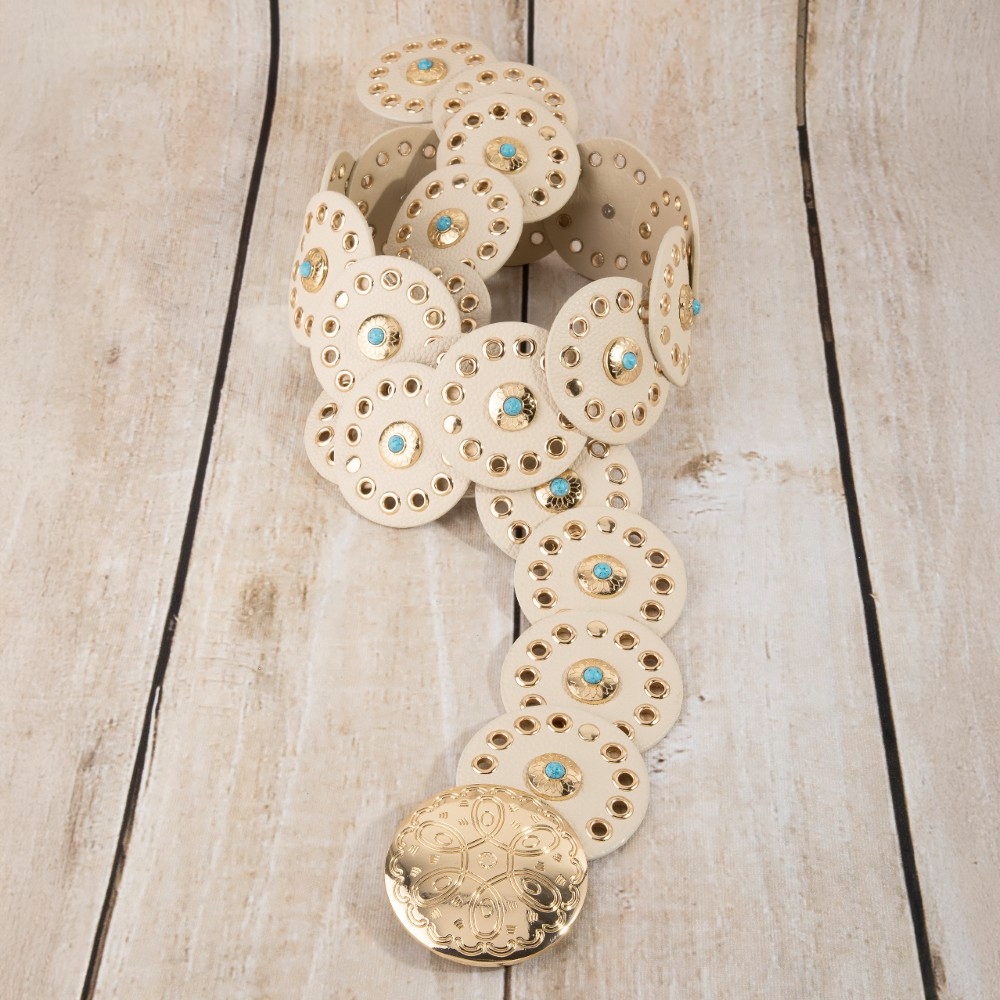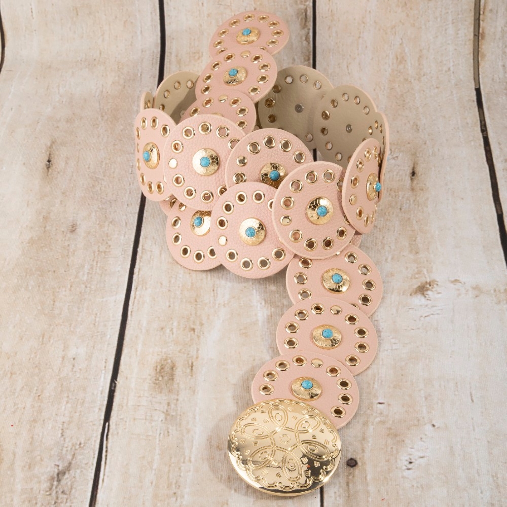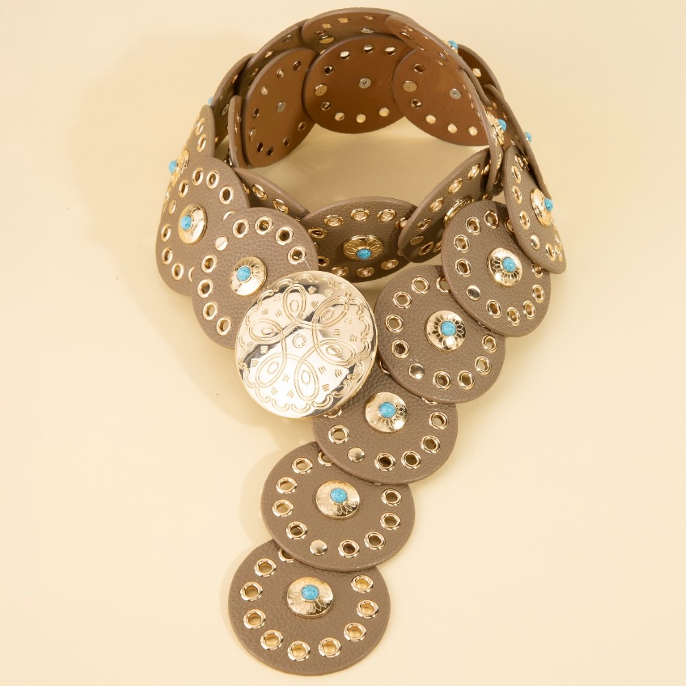 - A modern classic, this belt boasts a magnificent grommet trim leather concho disc link design. Infuse your ensemble with a touch of sophistication using this versatile belt, a game-changer in the world of fashion. Available in BEI, BG, BL, BR, BS, BZG, BZS, G, MIN, NVY, PN, R, S. This item is sold in packs of 1.