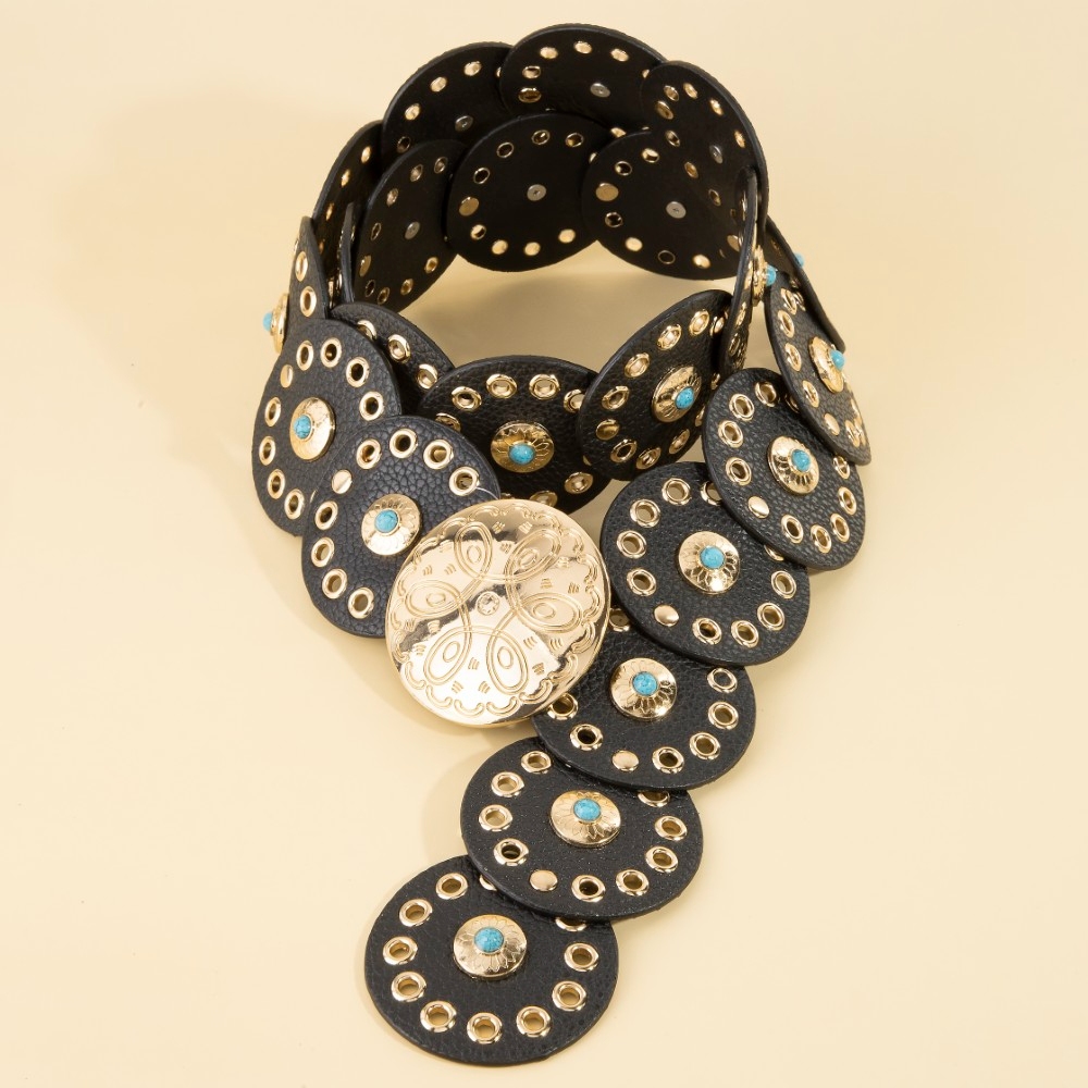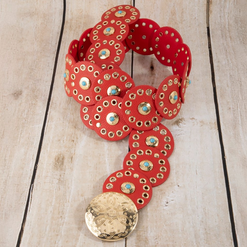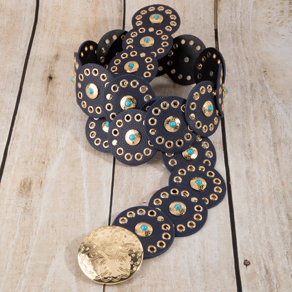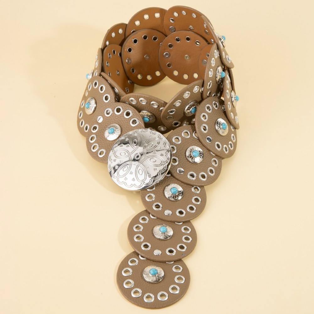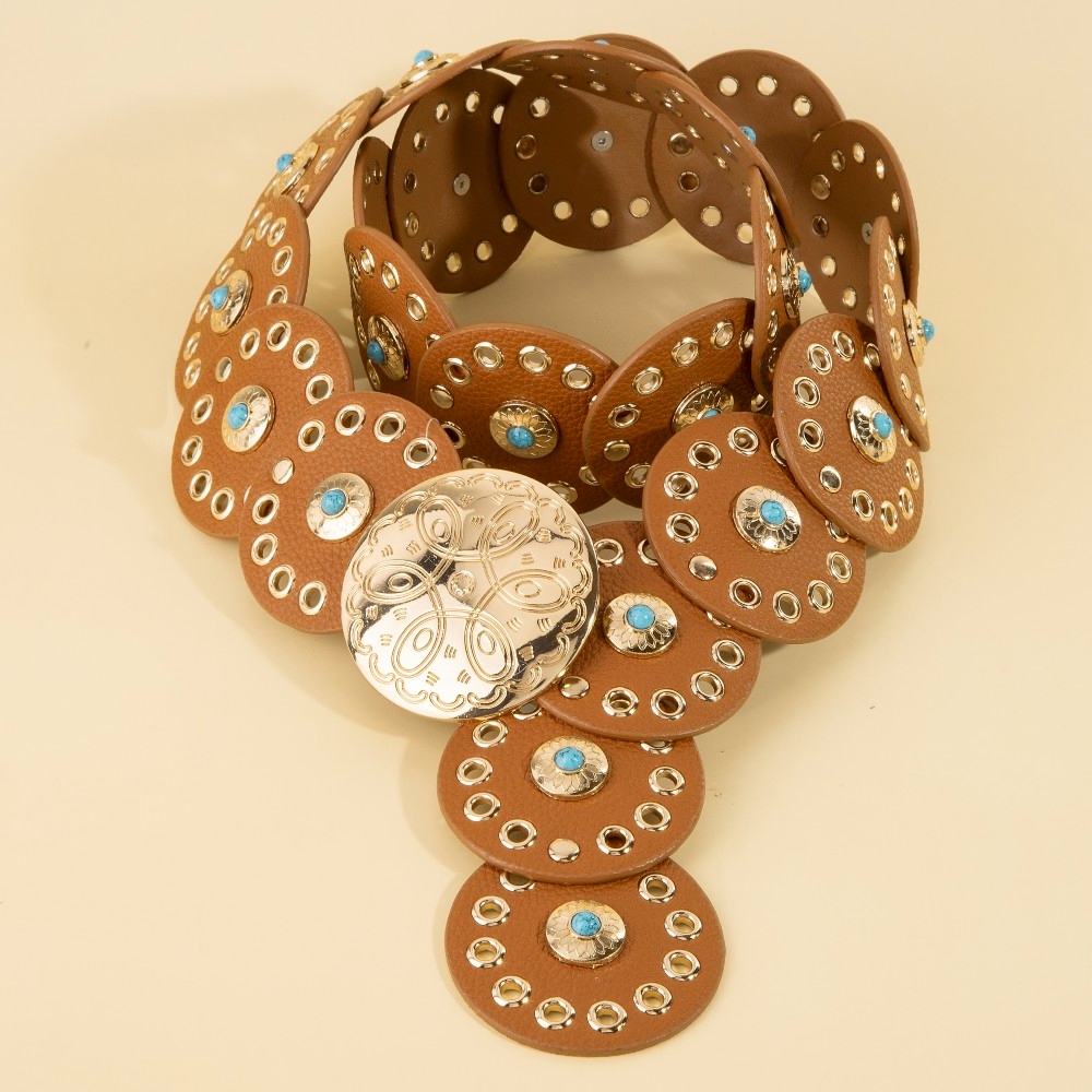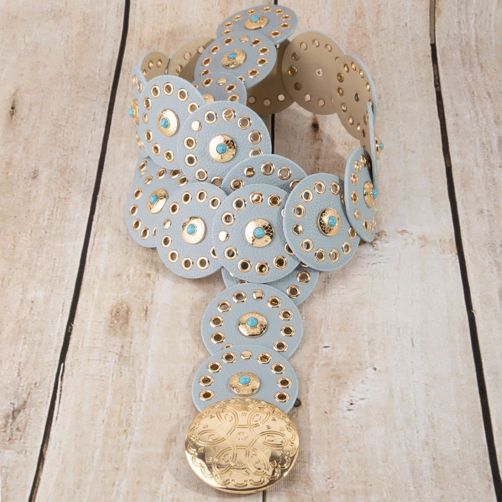 - A modern classic, this belt boasts a magnificent grommet trim leather concho disc link design. Infuse your ensemble with a touch of sophistication using this versatile belt, a game-changer in the world of fashion. Available in BEI, BG, BL, BR, BS, BZG, BZS, G, MIN, NVY, PN, R, S. This item is sold in packs of 1.