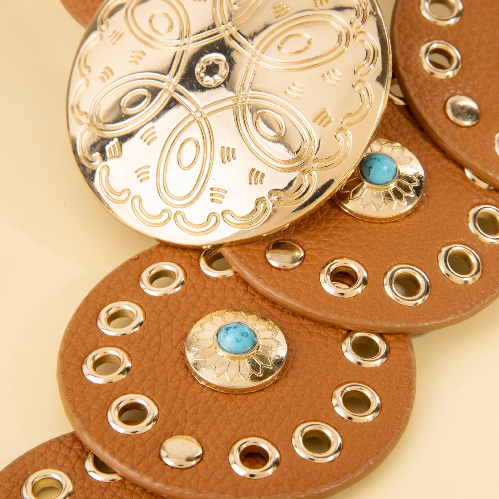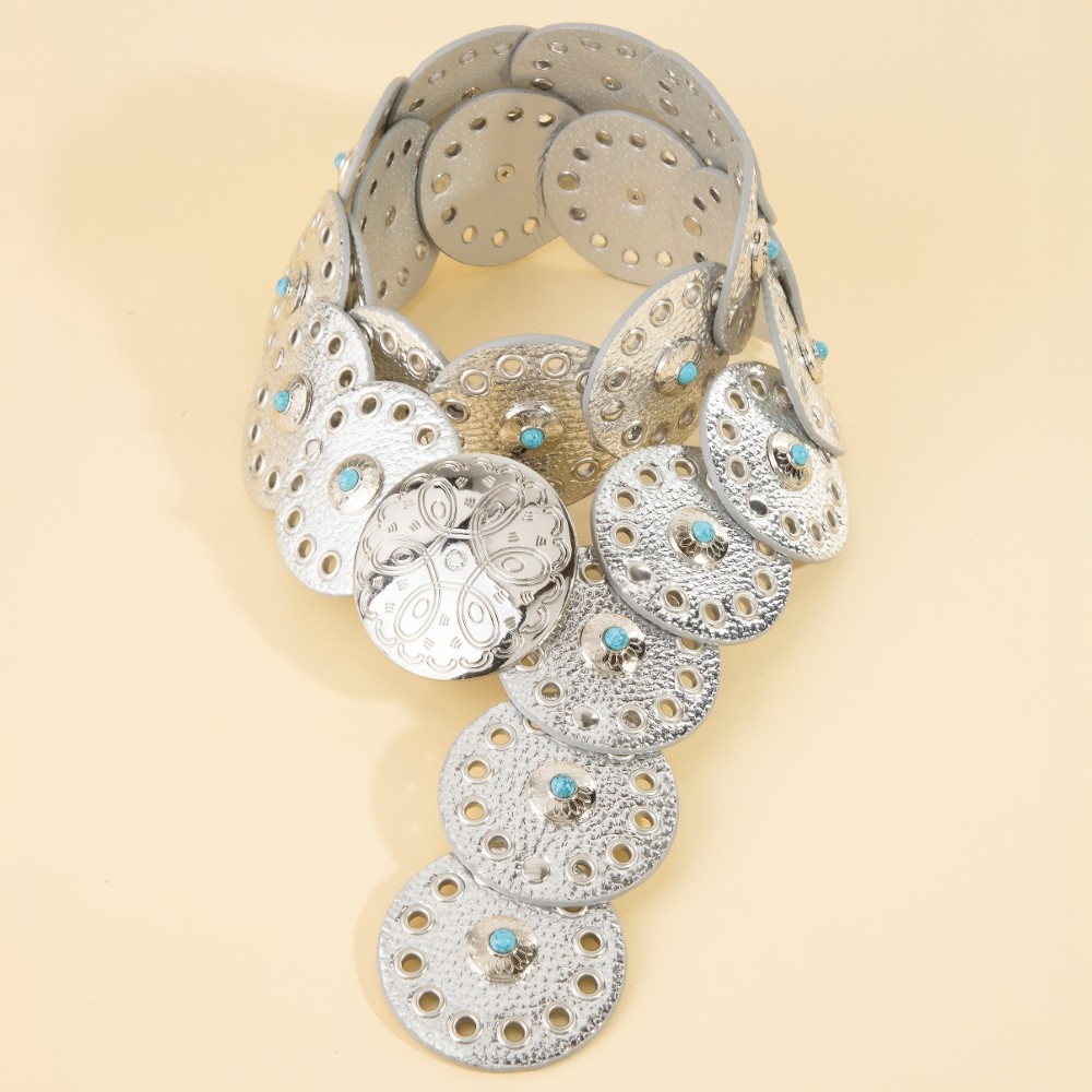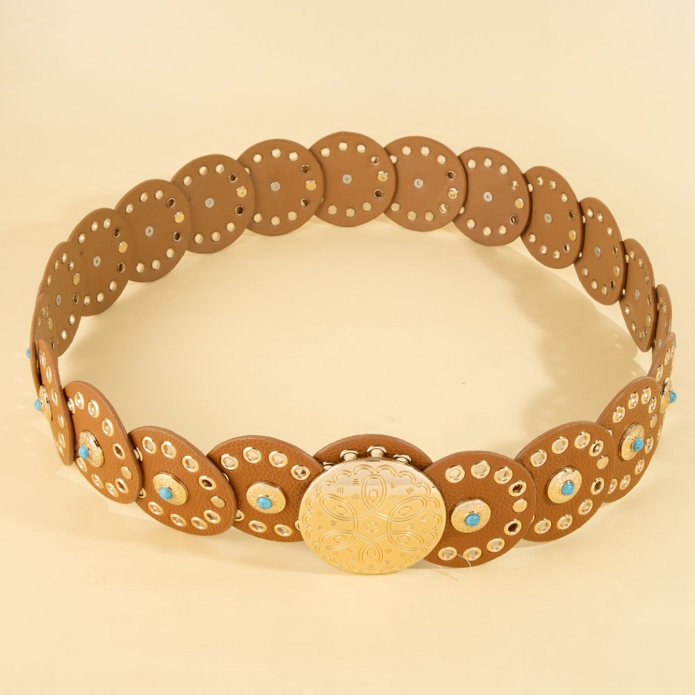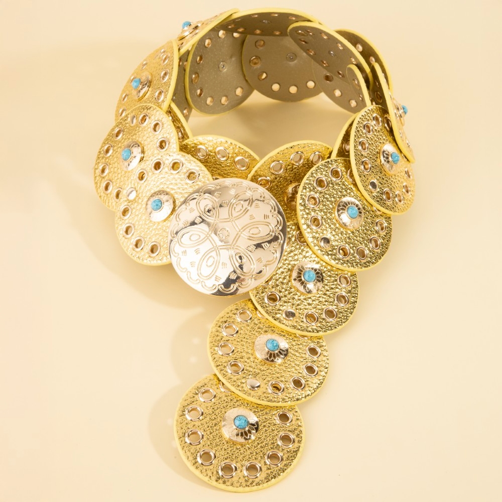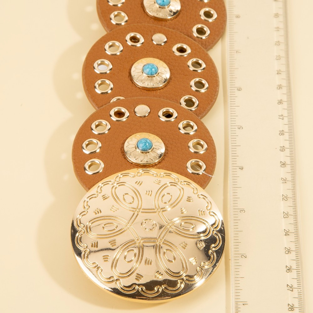 - A modern classic, this belt boasts a magnificent grommet trim leather concho disc link design. Infuse your ensemble with a touch of sophistication using this versatile belt, a game-changer in the world of fashion. Available in BEI, BG, BL, BR, BS, BZG, BZS, G, MIN, NVY, PN, R, S. This item is sold in packs of 1.