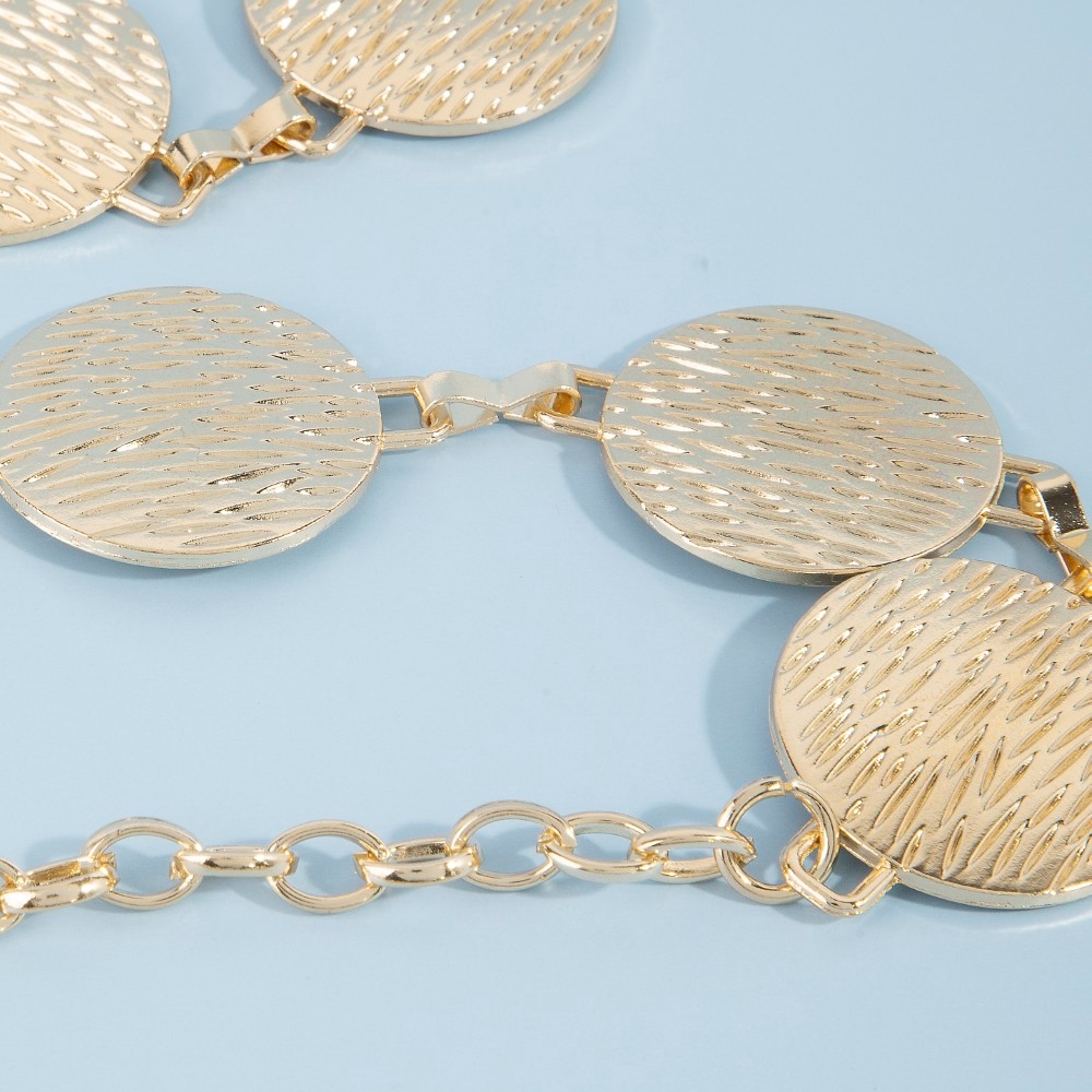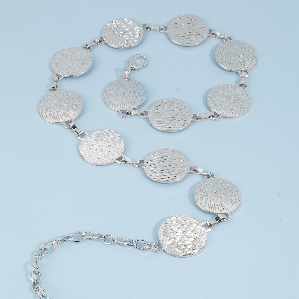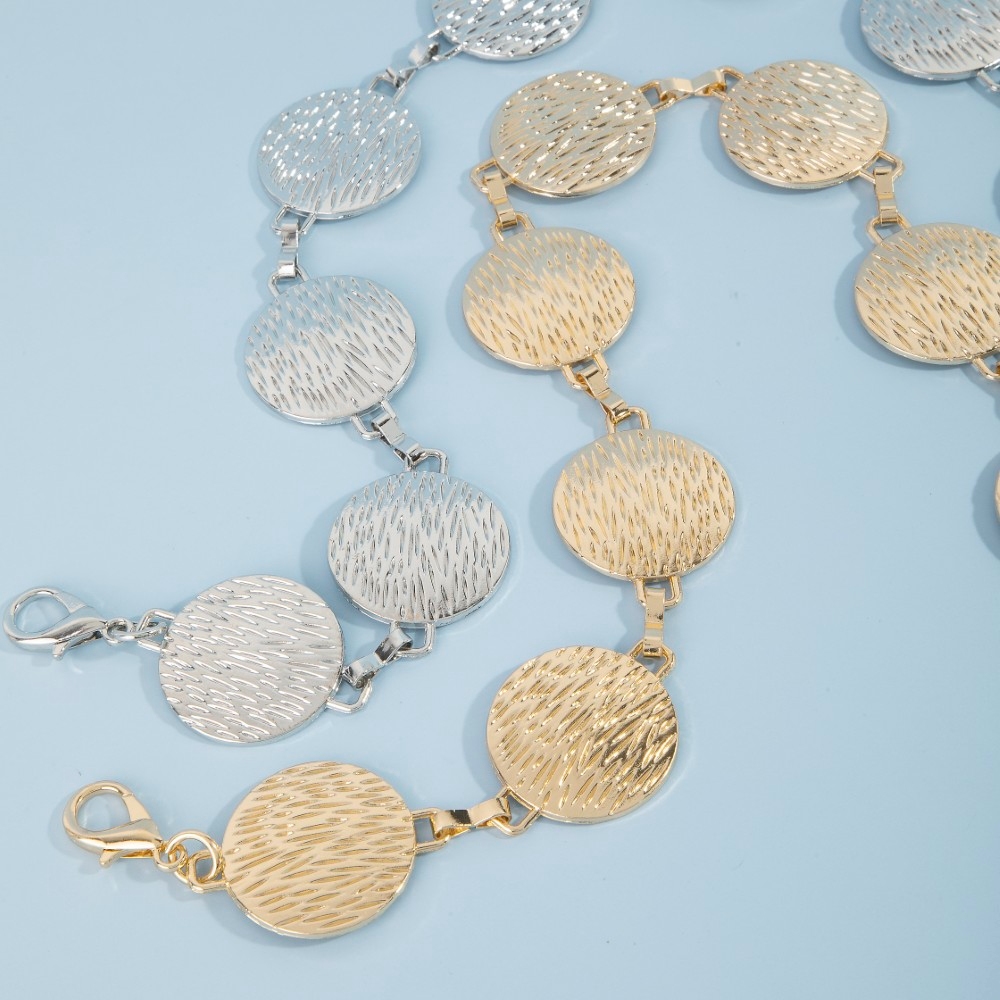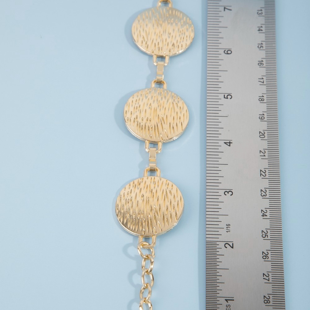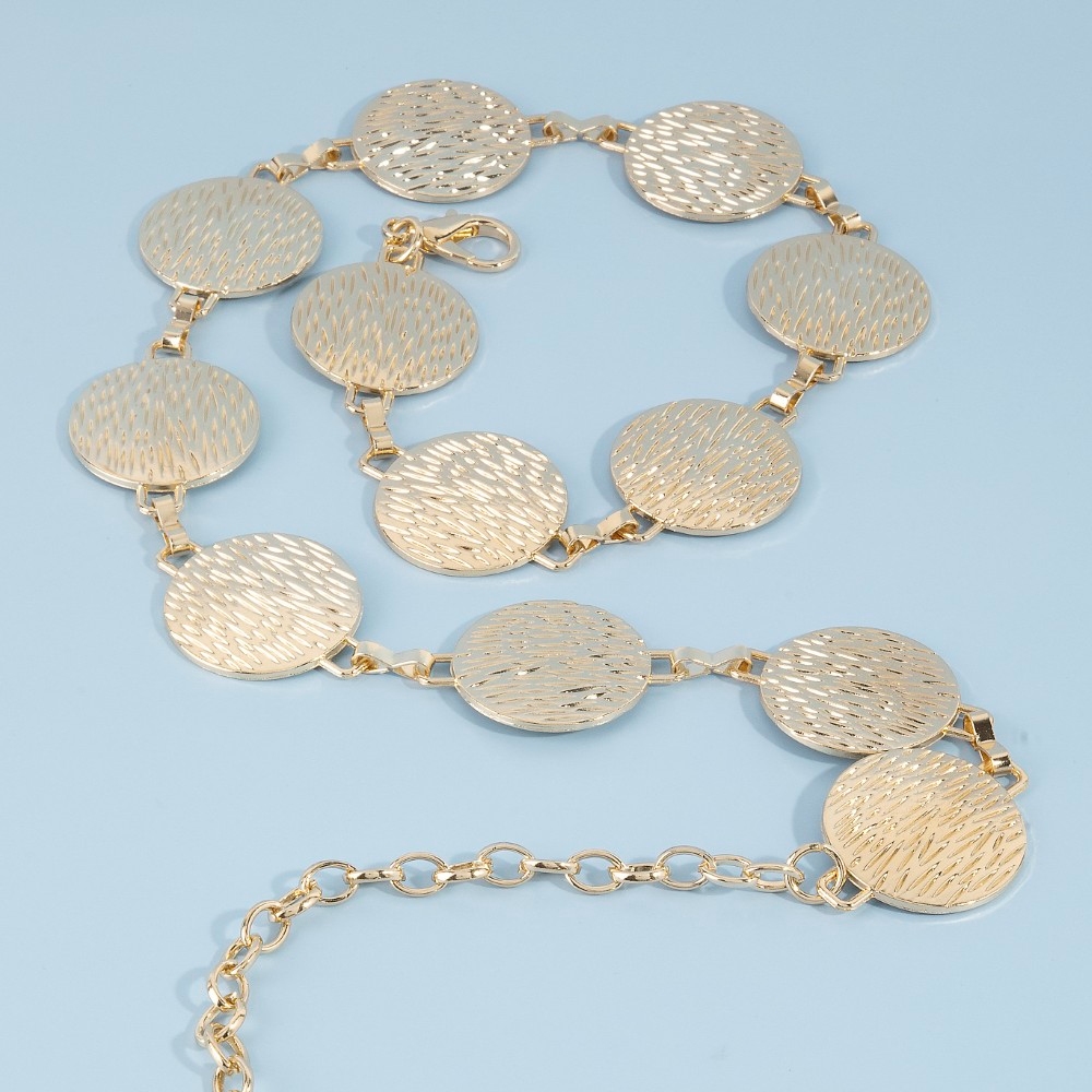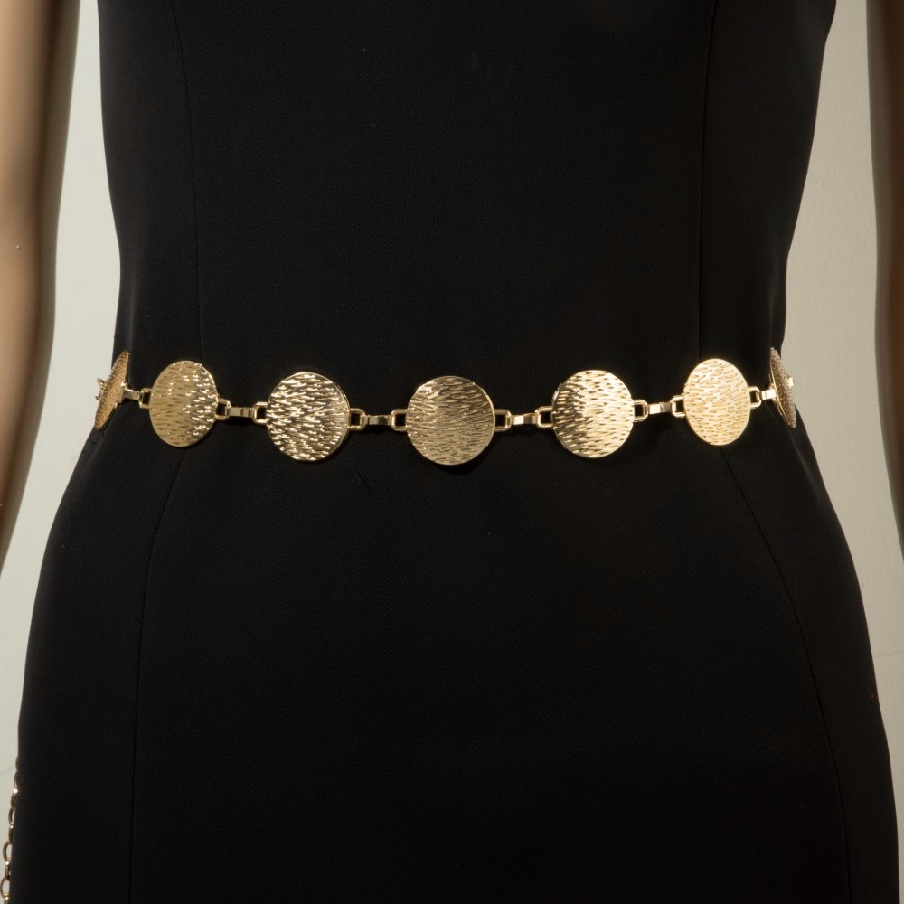 Stay on-trend and ahead of the fashion curve, this chain belt radiates a sleek hammered circle disc design. Unlock endless styling possibilities with this versatile chain belt, creating a signature look that speaks volumes. Available in G, RO. This item is sold in packs of 1.