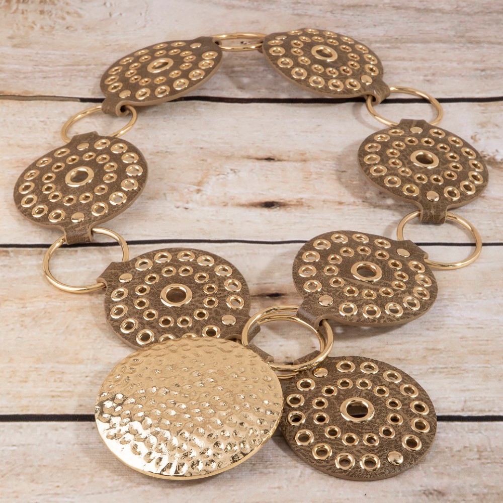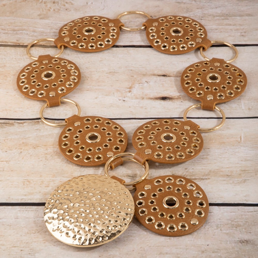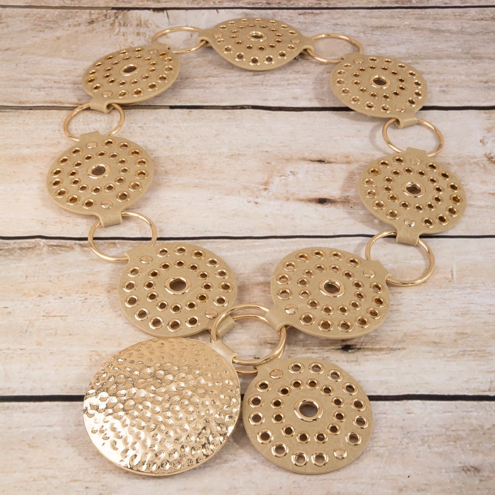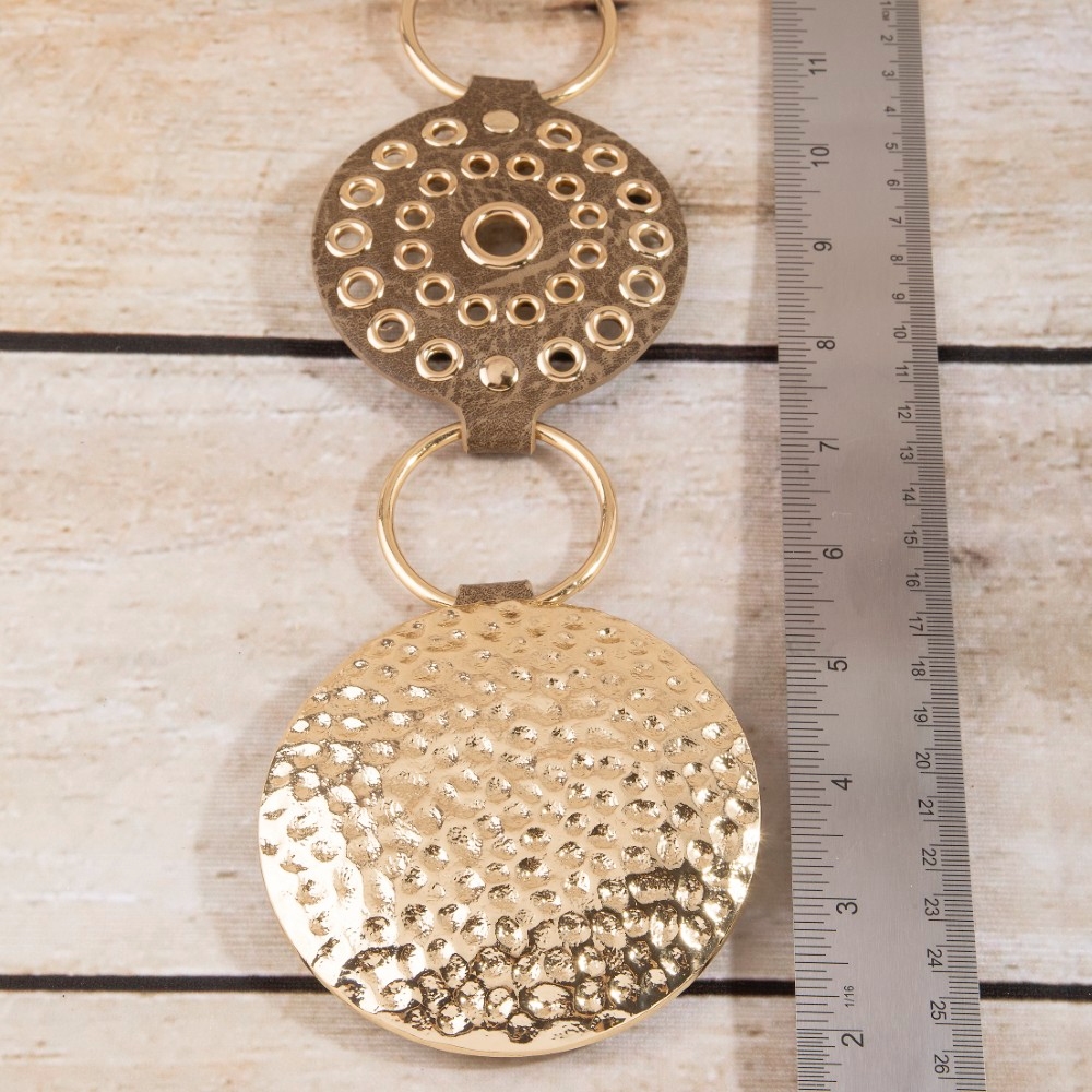 • A versatile and stylish addition to any wardrobe, this belt flaunts a luxurious hammered medallion chain leather studded disc design. This item adds the perfect finishing touch to any outfit, making it stand out from the crowd. Available in B, BR, BZ, G, KH, W. This item is sold in packs of 1.