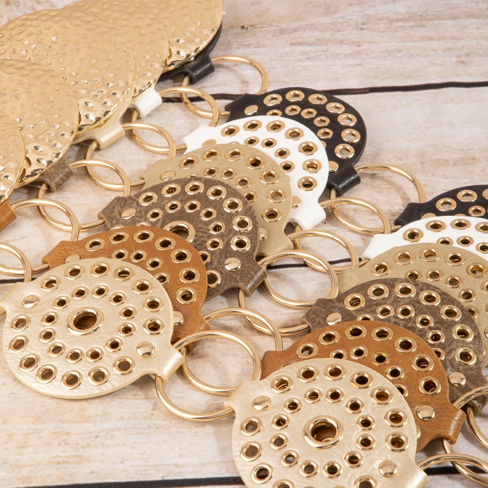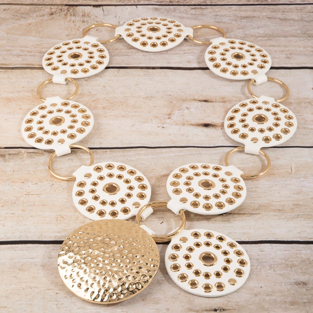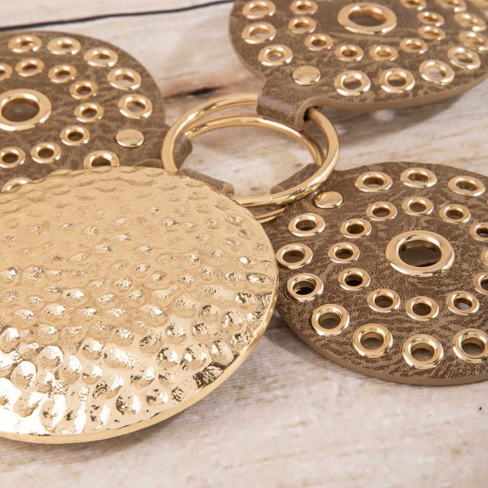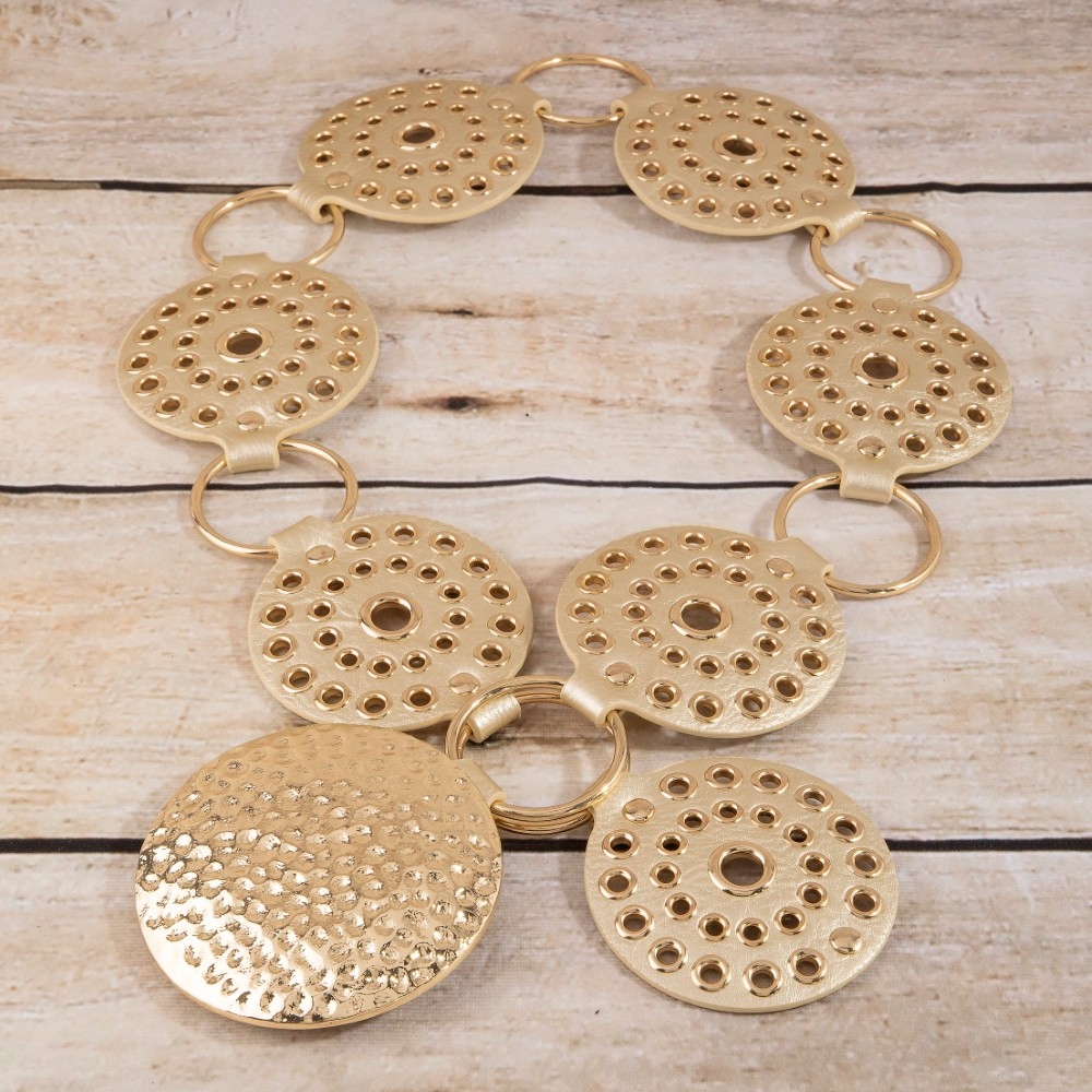 • A versatile and stylish addition to any wardrobe, this belt flaunts a luxurious hammered medallion chain leather studded disc design. This item adds the perfect finishing touch to any outfit, making it stand out from the crowd. Available in B, BR, BZ, G, KH, W. This item is sold in packs of 1.