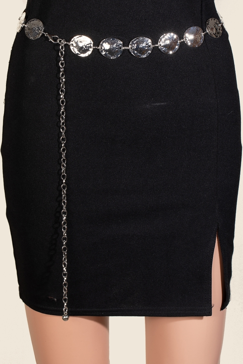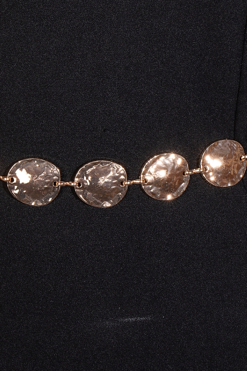The perfect way to complete any outfit, this chain belt incorporates a remarkable hammered metallic discs design. Experience the transformative power of this versatile chain belt, effortlessly enhancing the overall aesthetic of your outfit. Available in G and S. This item is sold in packs of 1.