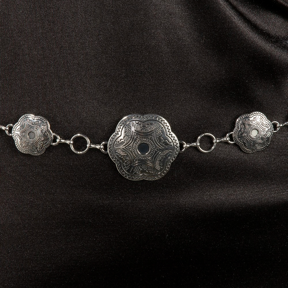 - This is the perfect chain belt for any occasion chain belt boasts a magnificent intricate engraved western concho design. Elevate your everyday style with this versatile chain belt, a simple yet impactful addition to your fashion repertoire. Available in RO. This item is sold in packs of 2.