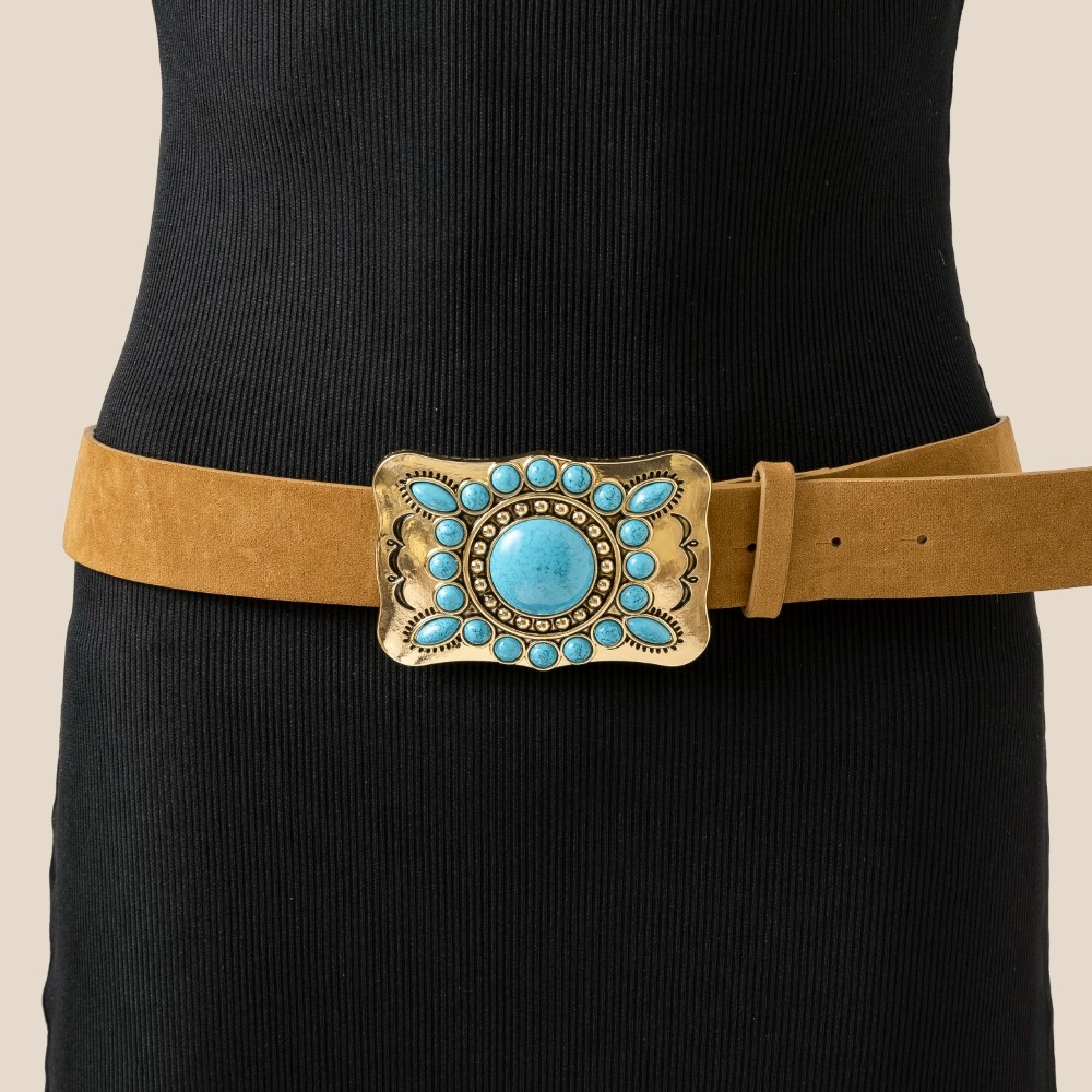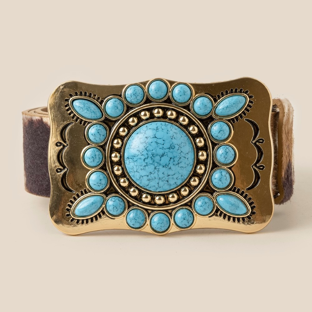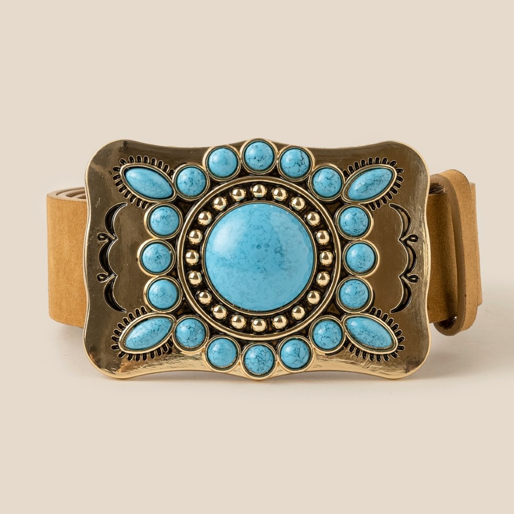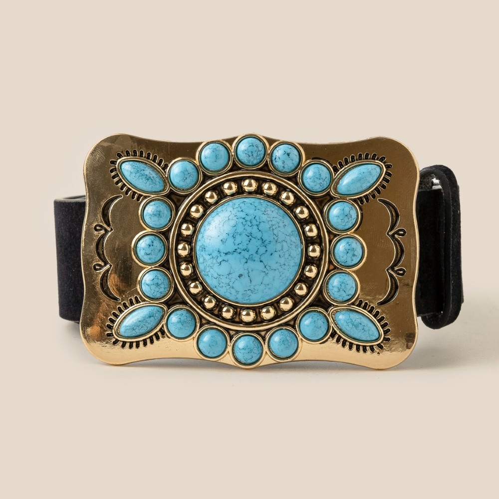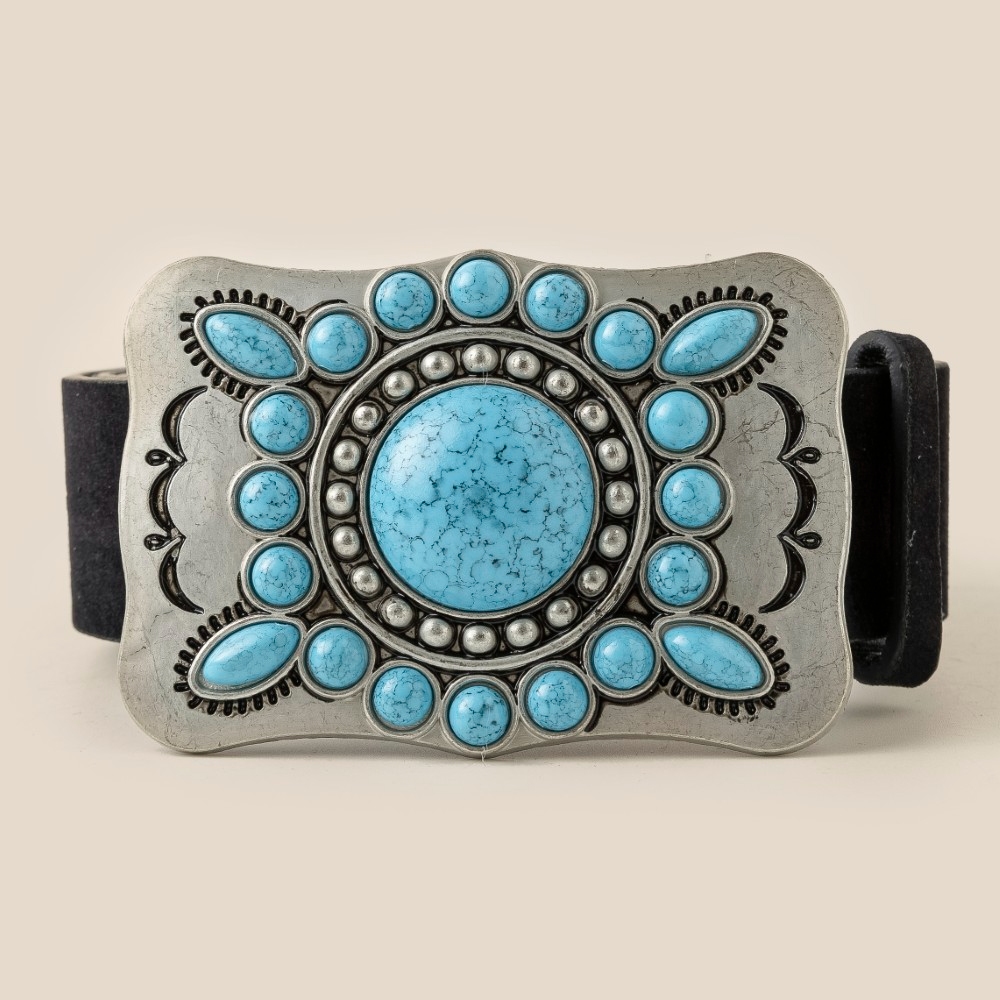 • Guaranteed to add a touch of glamour to any outfit, this belt flaunts a luxurious large western turquoise stone concho buckle design. Discover a new level of fashion versatility as this belt effortlessly elevates the allure of your attire. Available in GBK, GBR, GCO, SBK. This item is sold in packs of 1.