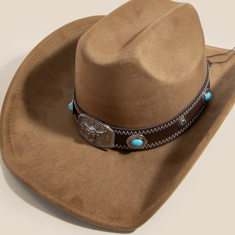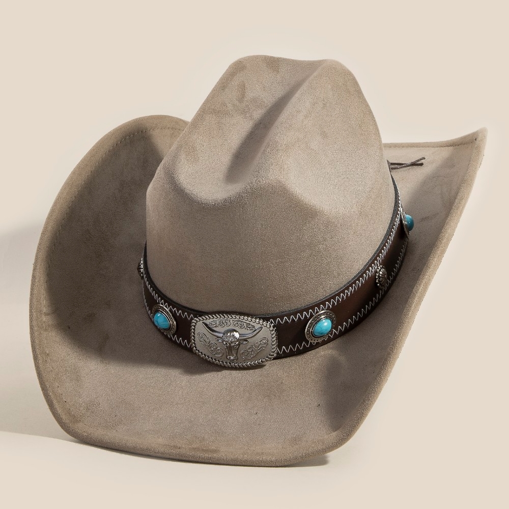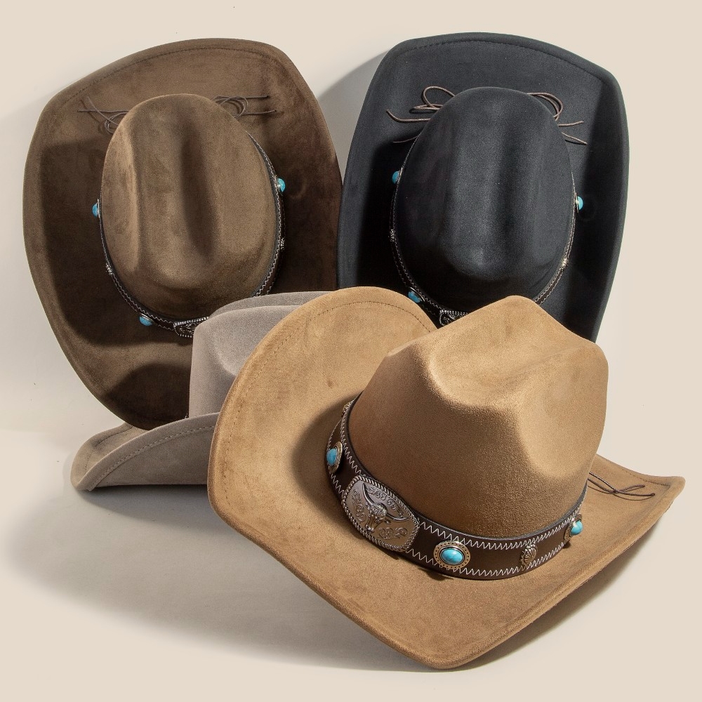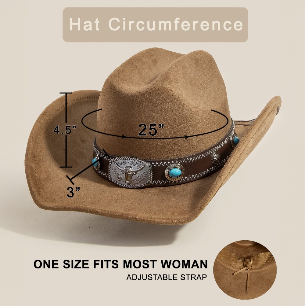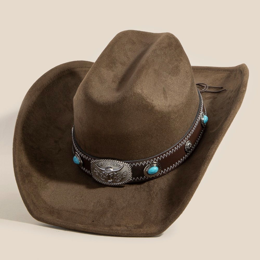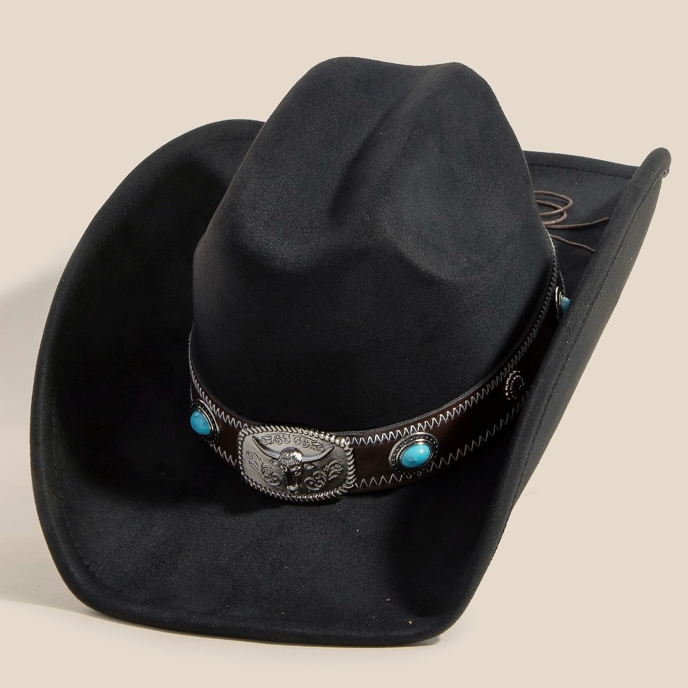 • This piece is the epitome of sophistication and elegance, this cowboy hat contains a special longhorn concho strap design. Unlock endless styling possibilities with this versatile cowboy hat, creating a signature look that speaks volumes. Available in BK, DBR, KA, LBR. This item is sold in packs of 1.