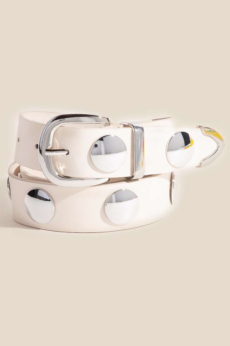 - This is the perfect faux leather belt for any occasion faux leather belt radiates a sleek metallic disc studded design. Unleash the potential of your wardrobe with this versatile faux leather belt, ensuring a touch of elegance in every ensemble. Available in GBK, GBR, SBK, SIV. This item is sold in packs of 1.
